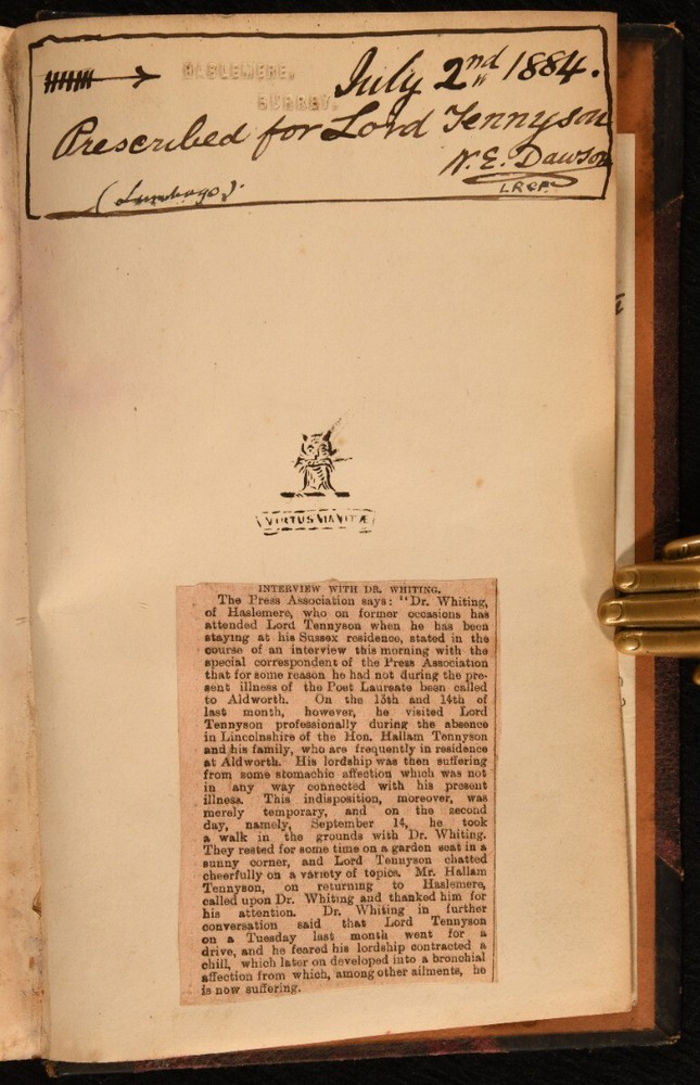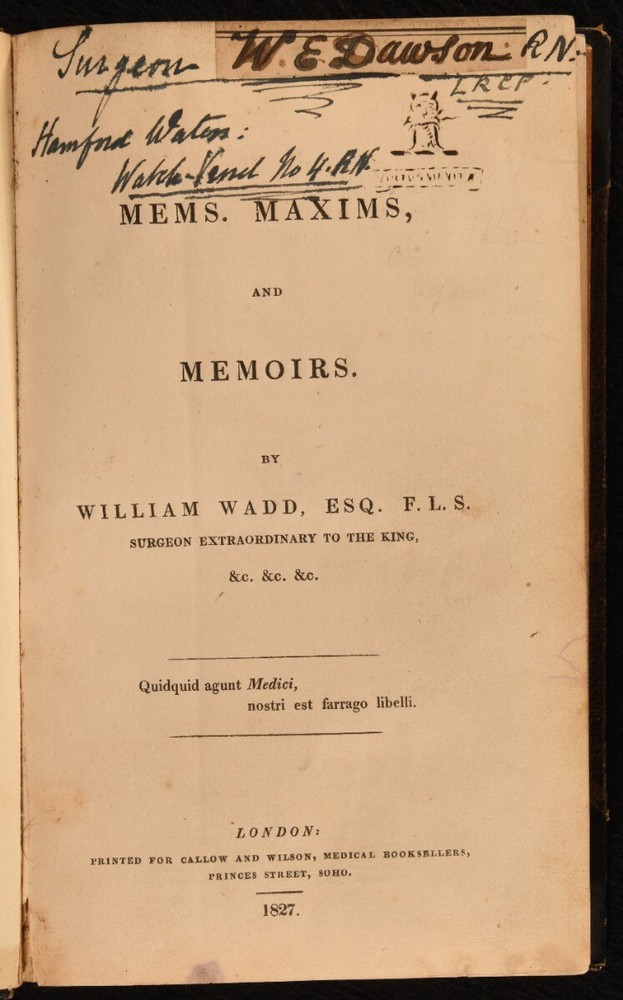 Click here to see our other books! Mems. Maxims, and Memoirs William Wadd 1827 Callow and Wilson : London 8" by 5" 303pp SUMMARY A scarce medical history from British surgeon William Wadd, from the ownership of Poet Laureate, Alfred Lord Tennyson. First Edition,Illustrated,Scarce Overall Condition: Good This book weighs 0.5 KG when packed UK Postage: £ 3.99 US Postage: £ 15.99 EU Postage : £ 13.99 European Postage: £ 14.99 Asia Postage: £ 18.99 Worldwide Postage: £ 19.99 DESCRIPTION This copy comes from the library of Alfred Lord Tennyson, the beloved Poet Laureate during much of Queen Victoria's reign and author of celebrated poems including 'Claribel' and 'The Charge of the Light Brigade'. With a presentation inscription to the poet to the rear endpaper, dated July 2nd 1884 and inscribed next to a blind stamped 'Haslemere, Surrey', the town that Tennyson moved to in the mid-19th century, commissioning an architect to build Aldworth House as his residence. Below the inscription and blind stamp is a newspaper clipping detailing an interview with Dr. Whiting of Haslemere, who attended to Lord Tennyson when he was suffering from "some stomachic affection". The first edition. A scarce copy of this early nineteenth-century medical history from British surgeon and medical author, William Wadd. Offering a fascinating account of the various key figures and historical events in the world of medicine, including the establishment of barber-surgeons in 1461 and the remedy of tar water for the plague. The work begins with a memoranda, from the date of the first hospital founded in Canterbury to the year 1800, in which a charter was granted to the Royal College of Surgeons. Bound in half calf with cloth boards. With a series of charming contemporary ink inscriptions from the other previous owner of this work, W. E. Dawson, a physician who worked in Walton-le-Soken (now Walton-on-the-Naze) as well as Hamford Waters as an admiralty surgeon for the Royal Navy. With a letter tipped in to the rear pastedown from George Brown, Editor of The Hospital Gazette, a weekly review of medicine and surgery who confirms the wish for an article from the W. E. Dawson. Dawson also has inscribed 'Navy and Army Illustrated Xmas No. 1898' to the front pastedown, suggesting he provided an article for this magazine also. With a list of 'Literary Doctors' inscribed to the rear free endpaper. Collated, complete with three plates. CONDITION In a half calf binding with cloth boards. Externally, with rubbing to the extremities and damp stains to the boards, more notable to the rear. With the bookplate of one W. E. Dawson to the front pastedown. With a tipped in letter from George Brown, Editor of 'The Hospital Gazette' to the rear pastedown. Internally, firmly bound. Pages are generally bright, with a series of contemporary ink inscriptions to the endpapers and title page. With occasional scattered spots and W. E. Dawson's ink impressions occasionally throughout. Overall Condition: Good GLOSSARY OF TERMS Overall Condition (Dustwrapper condition rating is shown after that for the book itself, where a dustwrapper is present) Fine - Very well preserved copy showing very little wear Very Good Indeed - Only one or two minor faults, really a very attractive copy Very Good - Quite a wide term meaning no major faults but probably several smaller ones often expected given the age of the book, but still a respectable copy Good - Meaning not very good. Some more serious faults as will be described in the condition report under 'condition' Good Only - Meaning one or more faults that could really do with repair Fair - As with good only above but with other faults leaving a compromised copy even after repair Poor - Really bad and possibly seriously incomplete. We only sell books in this condition where their rarity or value makes them attractive none the less. Major defects will be described. GUARANTEE We offer a full money back guarantee on our descriptions. Please ask for details and conditions. We prefer PAYPAL. If you pay via PAYPAL we will post the item off the same or the next working day with the postage you have selected. Please note we cannot accept USD cheques
