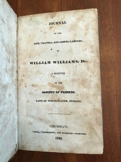 Journal of the Life, Travels, and Gospel Labours of William Williams, Dec. A Minister of the Society of Friends. Late of White-Water, Indiana. By William Williams Published: Lodge, L'Hommedieu, and Hammond, Cincinnati, 1828. 272 pp. Contemporary mottled calf, leather label. Slight chipping at head and toe of spine, outer front hinge rubbed, quite heavily foxed, some marginal dampstaining. A sound copy. Williams visited Maryland, Virginia, the Carolinas and Georgia in his capacity as a Quaker minister. He blamed much of the evil he saw rampant on the frontier on demon rum, and had little betters to say about the northern states he visited. Clark aptly describes Williams' narrative as "an exceedingly dull book," but goes on to indicate that "material for the study of Quakers in the South in this period is so scarce that Williams should be consulted." HOWES W490. CLARK II:176. I've done my best to describe the book, but if you have additional questions, please don't hesitate to send me an e-mail.