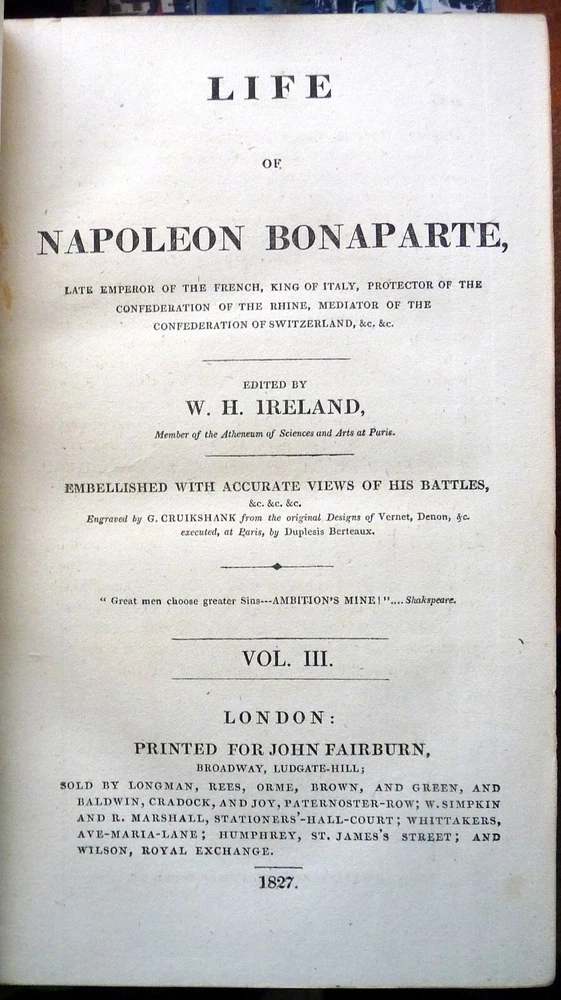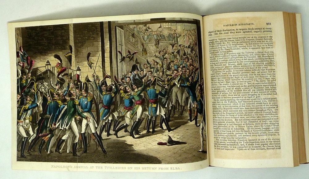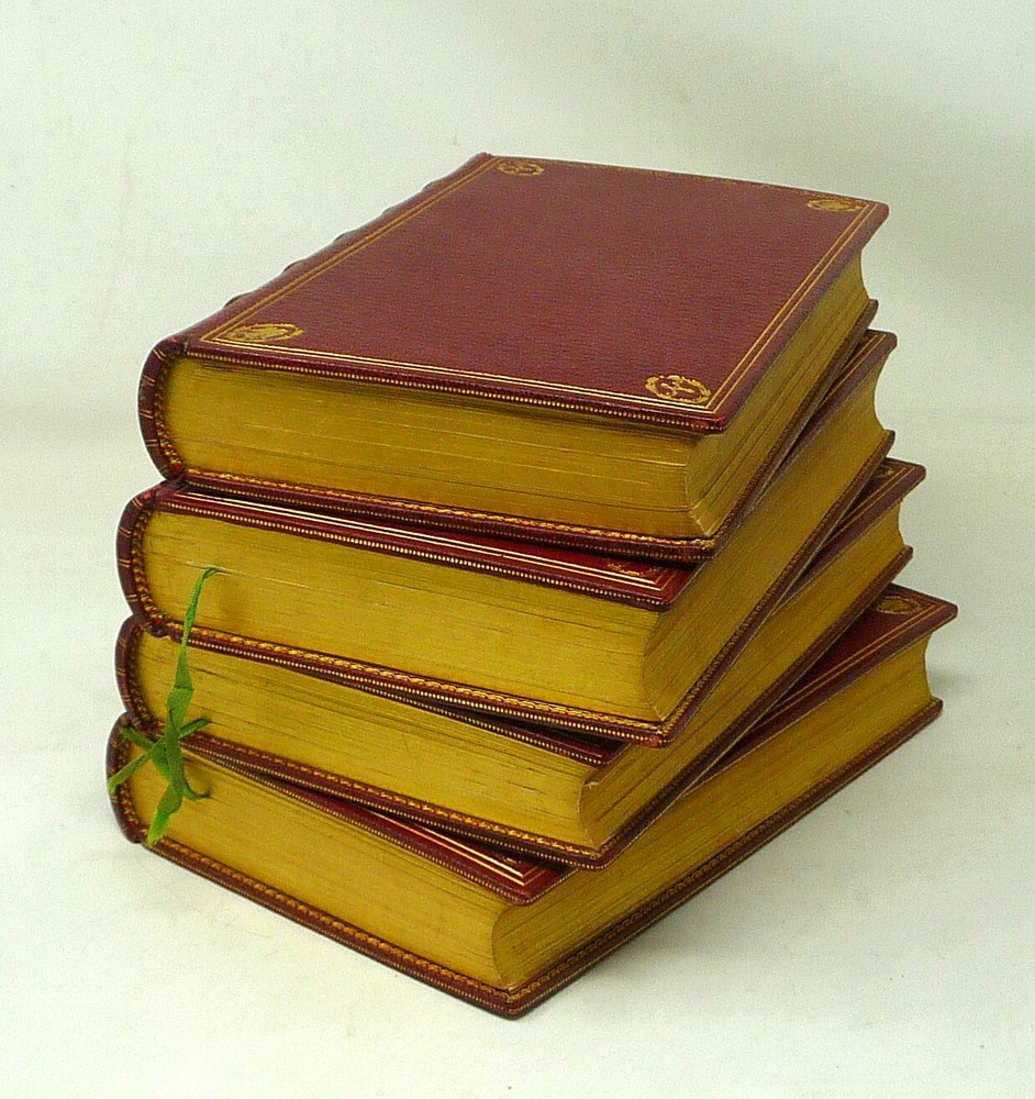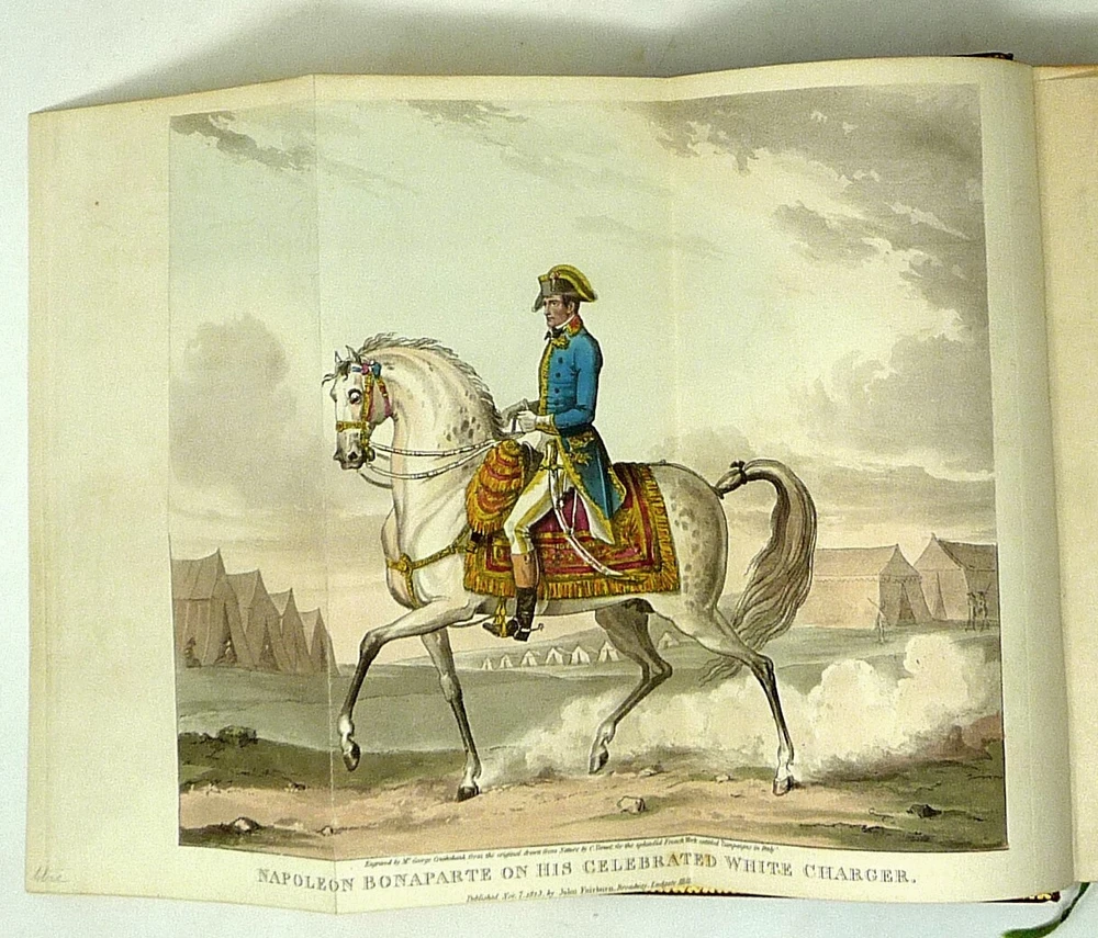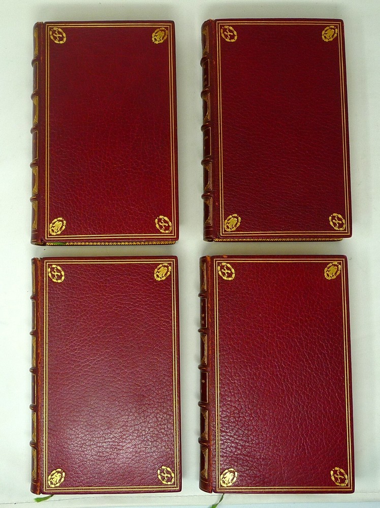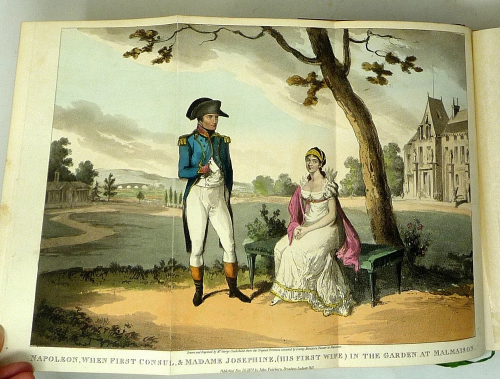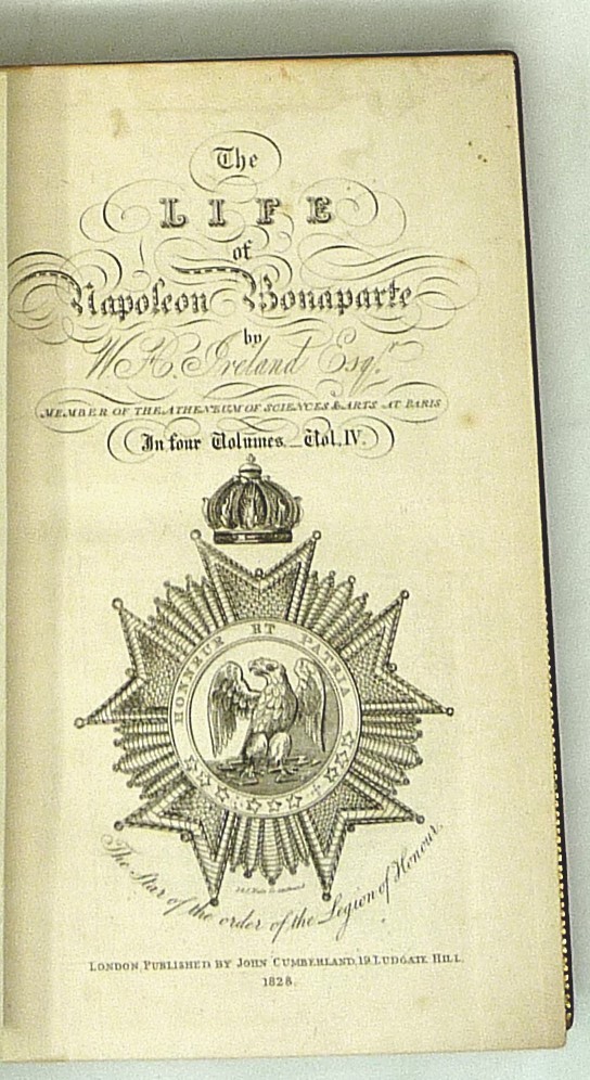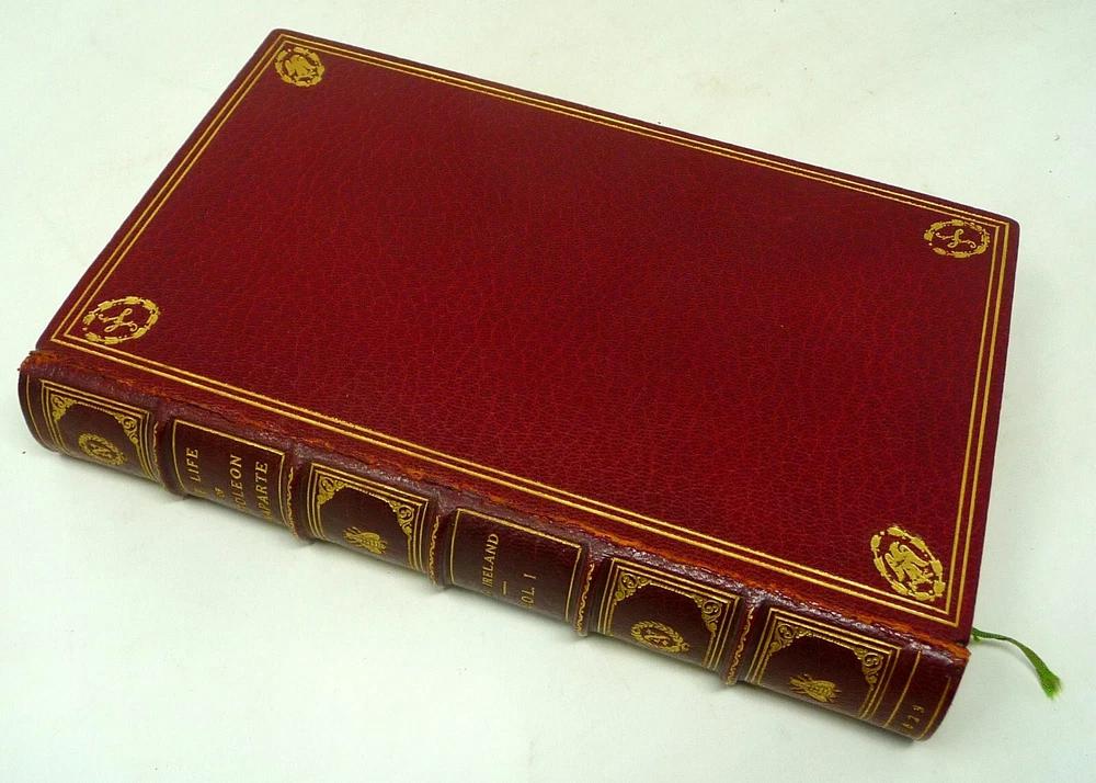 The French Revolution, by W. H. Ireland, 1828 The Life of Napoleon. Ireland, W. H. London: John Cumberland, 1828. Four volume set, complete. First edition set. Full maroon Morocco leather, with gilt vignette illustrations on each corner of the front and back covers and gilt rules. Gilt titles and elaborate gilt designs in six compartments on the spine, five raised bands -- plus the date each individual volume was published in gilt at the bottom (1823, 1825, 1827 and 1828). Pages gilt tipped on the three edges. Gilt detailing on the front and back inside covers, brown endpapers. The volumes are lavishly illustrated, with 27 total folding plates, most by George Cruikshank. Twenty-three are hand colored. The frontispiece folding plates have tissue guards. Title pages have Napoleon's crest. Handsome foldout portraits of Napoleon and Josephine -- all the illustrations are gorgeous. The volumes are in very good condition -- Three volumes have the original green ribbon bookmark. Volume 1 is fragile at the hinge, slightly cracked. All the gilt is still bright, no ownership inscriptions or bookplates and otherwise in especially nice condition. Spectacular set.