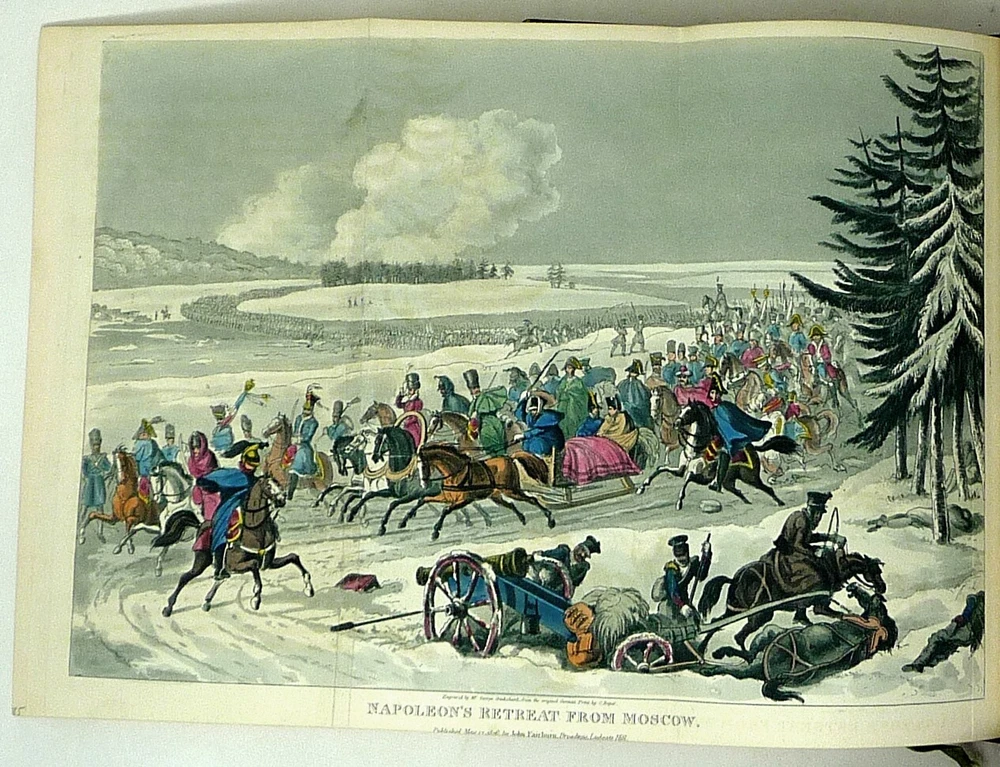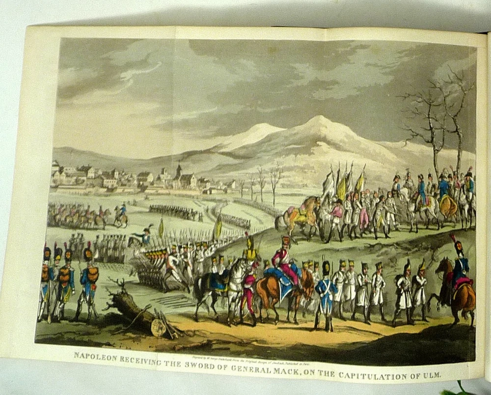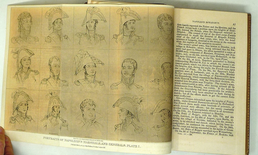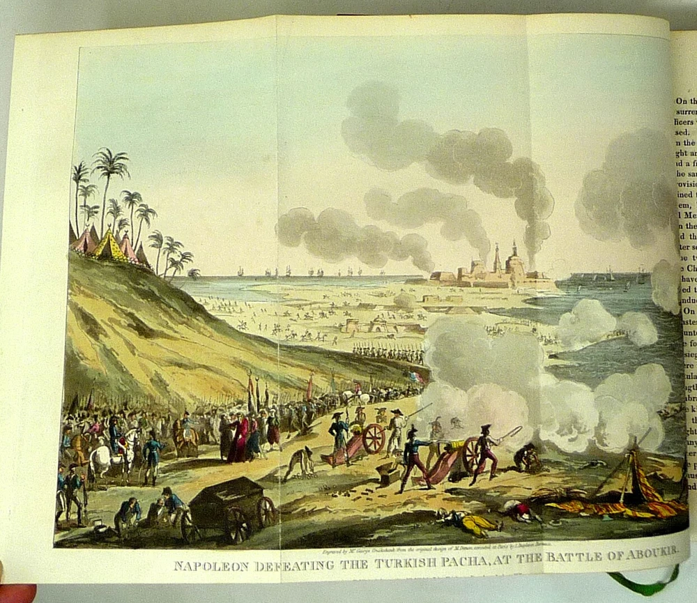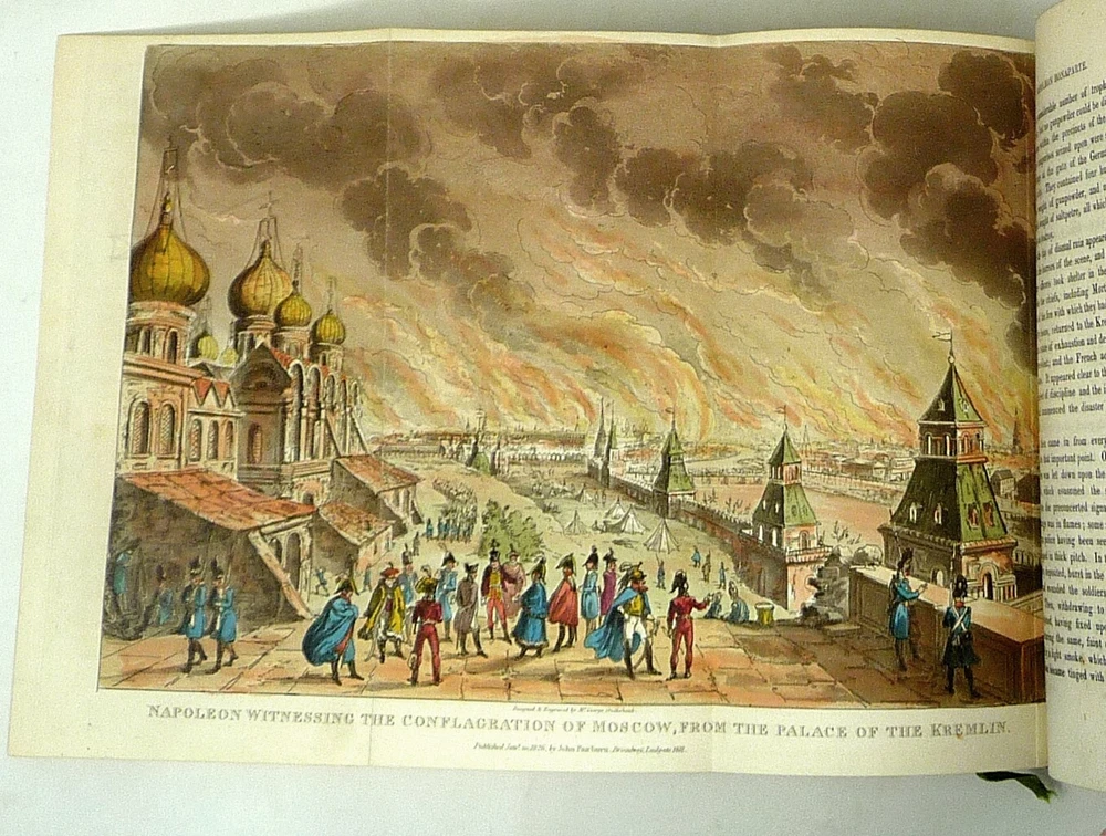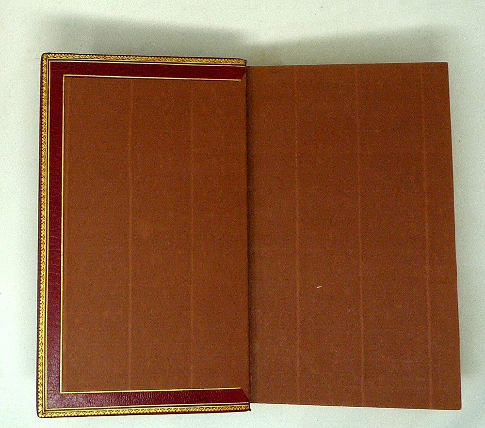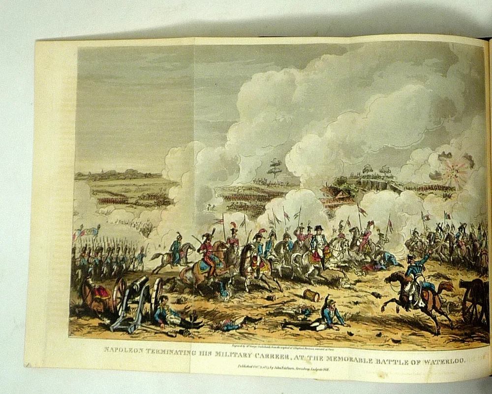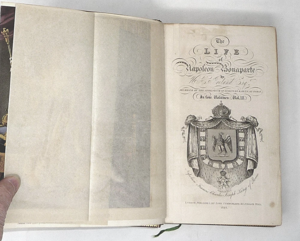 The French Revolution, by W. H. Ireland, 1828 The Life of Napoleon. Ireland, W. H. London: John Cumberland, 1828. Four volume set, complete. First edition set. Full maroon Morocco leather, with gilt vignette illustrations on each corner of the front and back covers and gilt rules. Gilt titles and elaborate gilt designs in six compartments on the spine, five raised bands -- plus the date each individual volume was published in gilt at the bottom (1823, 1825, 1827 and 1828). Pages gilt tipped on the three edges. Gilt detailing on the front and back inside covers, brown endpapers. The volumes are lavishly illustrated, with 27 total folding plates, most by George Cruikshank. Twenty-three are hand colored. The frontispiece folding plates have tissue guards. Title pages have Napoleon's crest. Handsome foldout portraits of Napoleon and Josephine -- all the illustrations are gorgeous. The volumes are in very good condition -- Three volumes have the original green ribbon bookmark. Volume 1 is fragile at the hinge, slightly cracked. All the gilt is still bright, no ownership inscriptions or bookplates and otherwise in especially nice condition. Spectacular set.