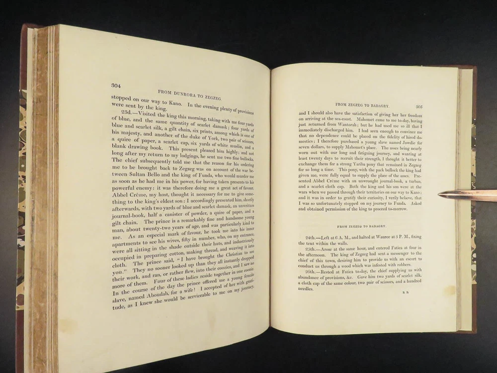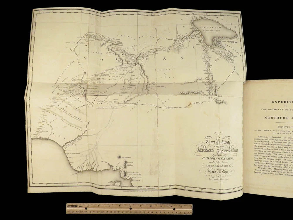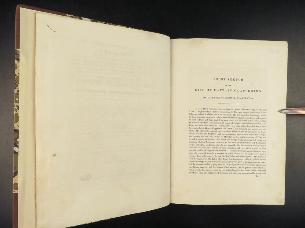 1829 AFRICA Voyages Slavery 1 ed Clapperton Journal Slaves Mungo Park HUGE MAP Hugh Clapperton and Dixon Denham were 19 th -century English explorers who is best known for their 1822 African expedition. While there, Denham and crew encountered numerous slave-trade exploits and did their part to rescue slaves. Following the mission, Denham and Clapperton aided the British plan to help settle rescued slaves in England. In 1829, following Clapperton’s second voyage to Africa, he published an expedition memoir, describing the events of the journey, descriptions of cities and villages near the Nile River, and the curious findings of Clapperton’s investigation into the death of Mungo Park. This impressive first edition of Clapperton’s ‘Journal’ includes the highly coveted large folding map! Item number: #24017 Price: $750 CLAPPERTON, Hugh Journal of a second expedition into the interior of Africa, from the bight of Benin to Soccato London : J. Murray, 1829. First edition. Details : · Collation: Complete with all pages o xxiii, [5], 355, [1] o Large folding map o 3 engravings · References: · Language: English · Binding: Leather; tight and secure · Size : ~11in X 8.5in (28cm x 21.5cm) Our Guarantee: Very Fast. Very Safe. Free Shipping Worldwide. Customer satisfaction is our priority! Notify us with 7 days of receiving, and we will offer a full refund without reservation! 24017
