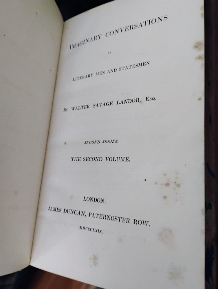 Imaginary Conversations Of Literary Men and Statesmen Volume 2 Walter Savage Landor London 1829 Volume 2. Full leather binding, marbled edges, bookplate of Major R. S. Seton on pastedown, some scattered foxing but mostly clean. Please let me know if you have any questions. Bookseller since 2011. Expanding to Ebay in 2022. Shipping with be with USPS Media Mail to keep costs down. I can ship with different methods if requested. 30 day returns.