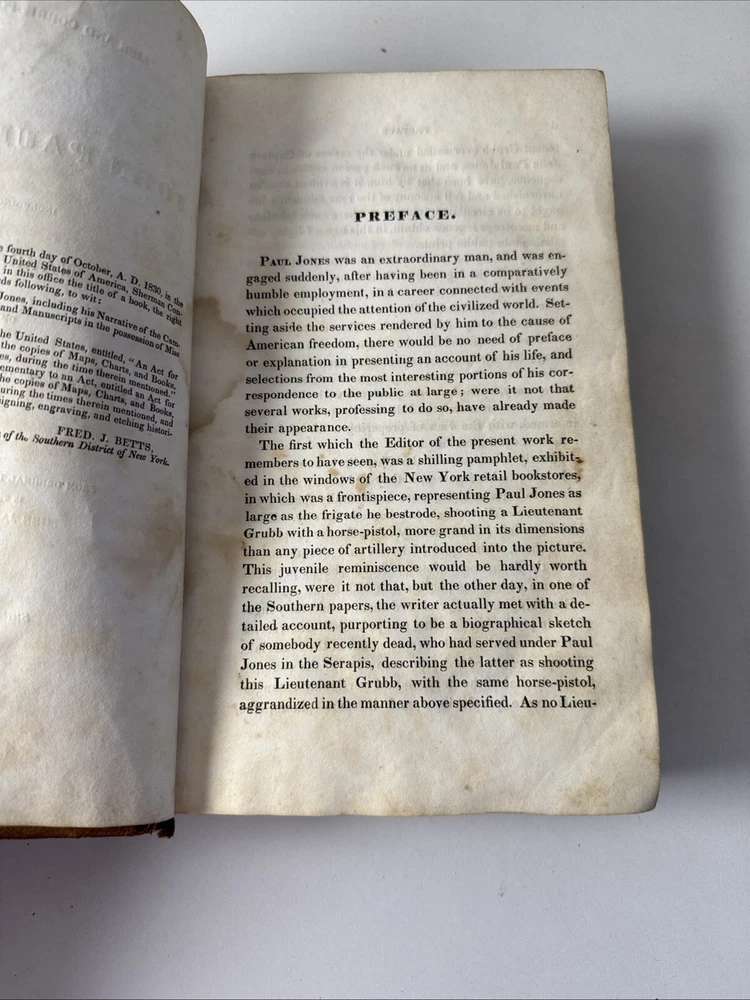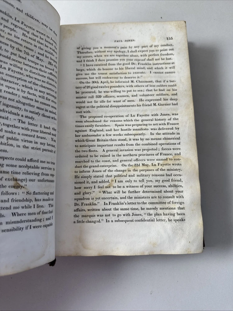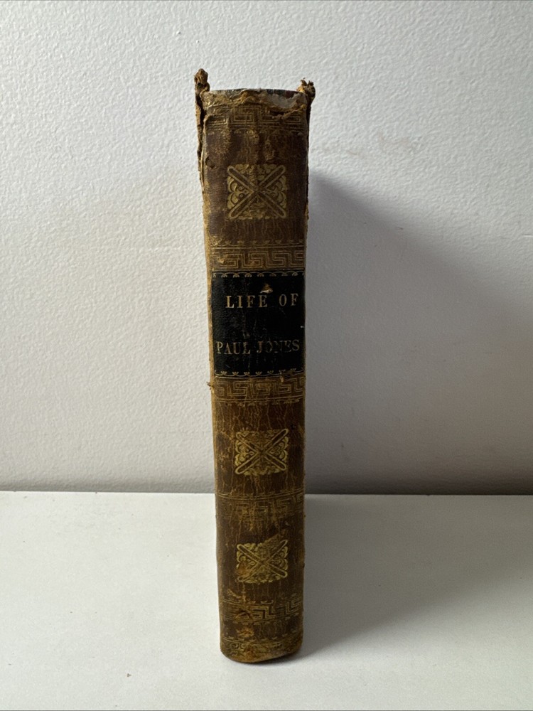 Life of (John) Paul Jones including the Narrative of the Campaign of the Liman. Published in 1830 in New York. Hard leather book. 555 pages. Condition: some age and shelf wear. Dirt and stains throughout. Some foxing. Some writing inside on blank pages. Some folded page corners. See photos.