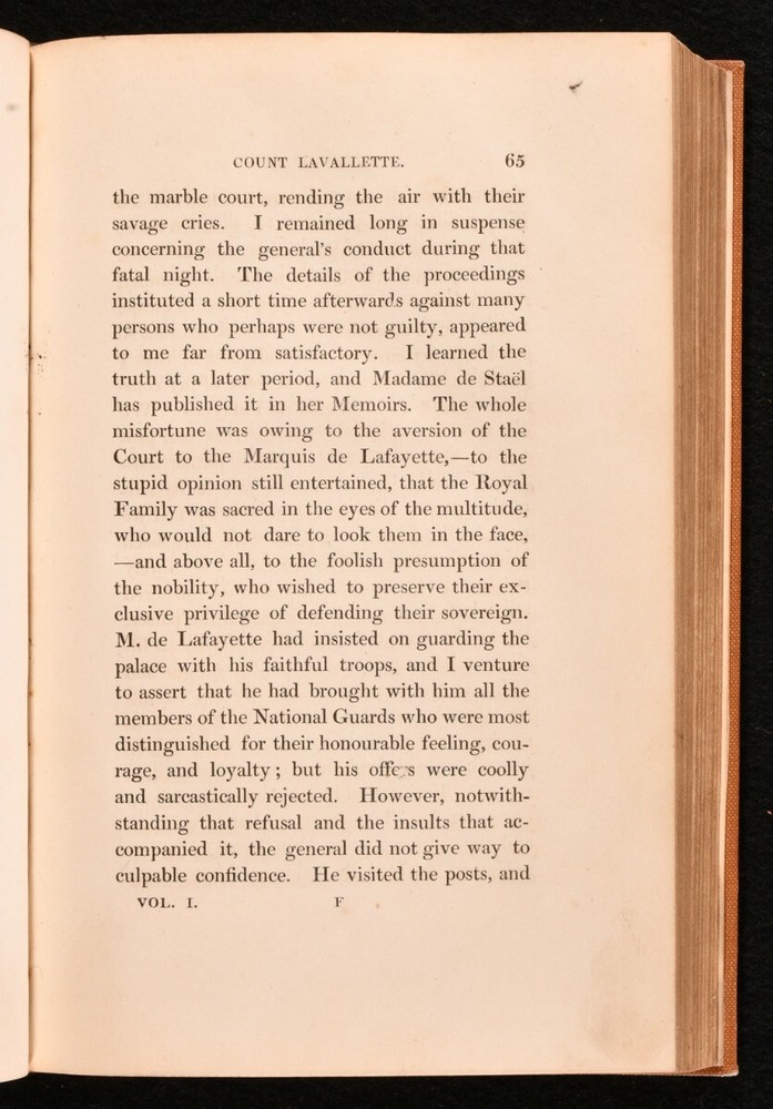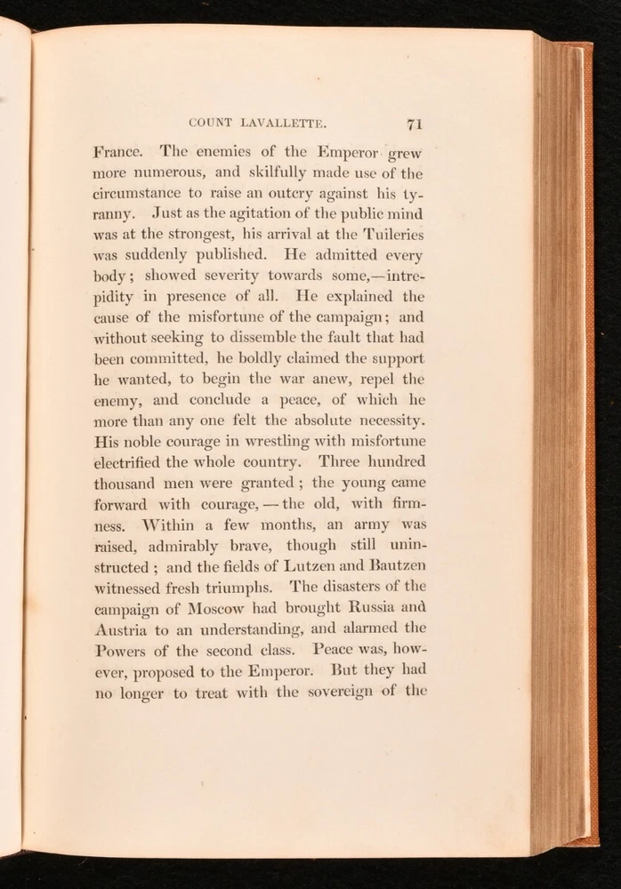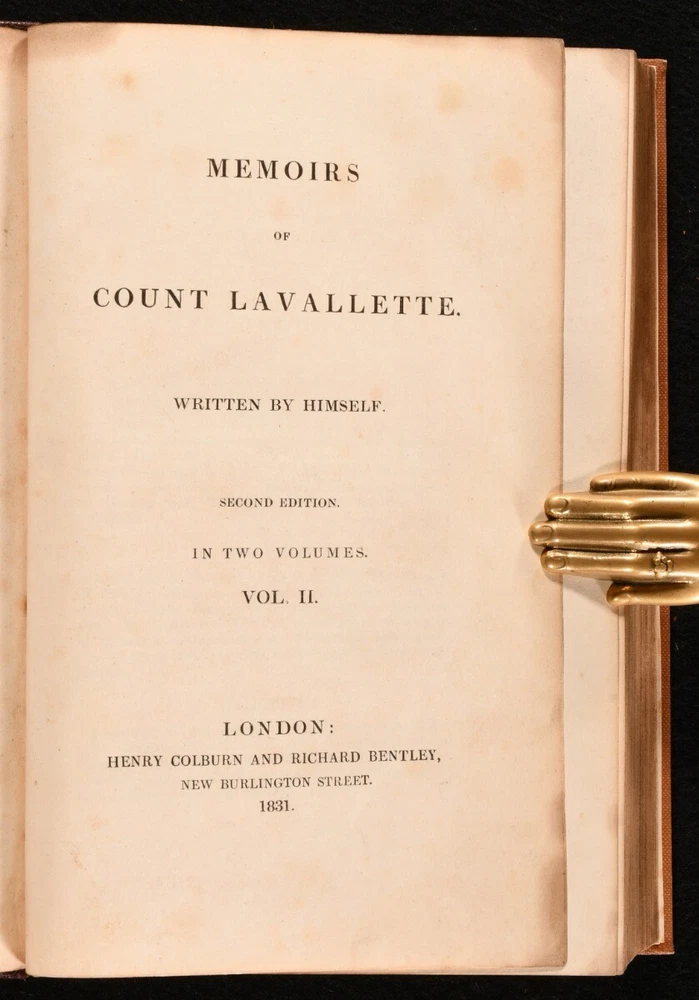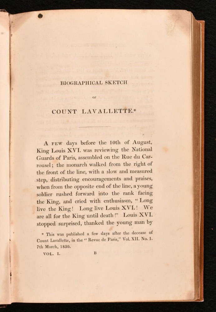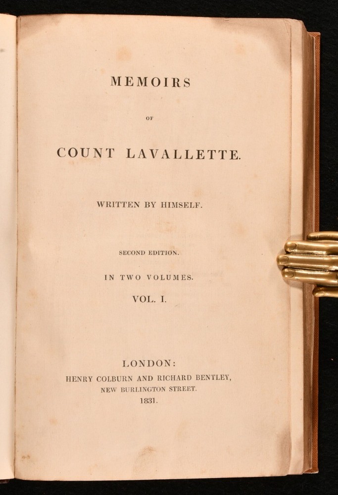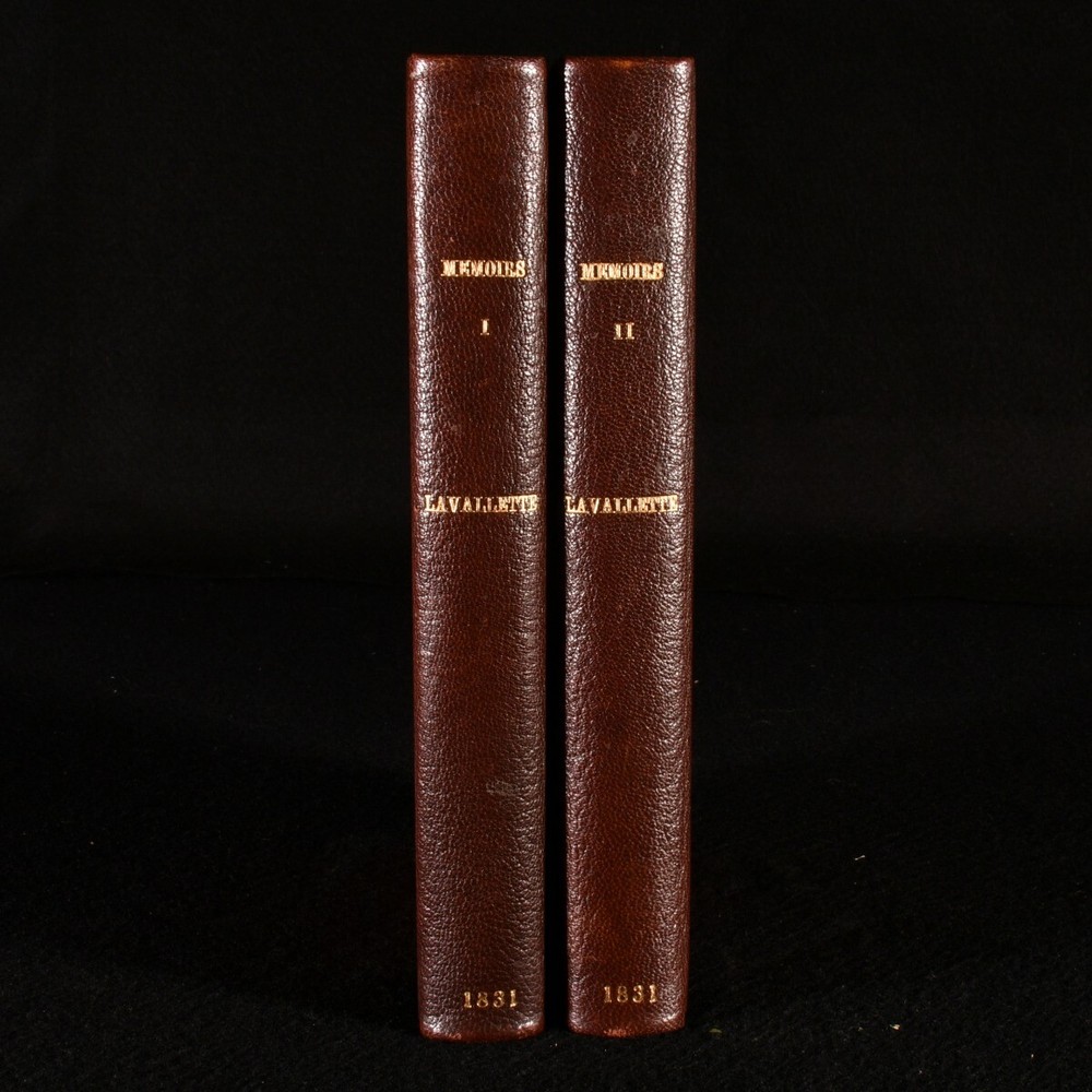 Click here to see our other books! Memoirs of Count Lavallette Count Lavalette; Antoine Marie Chamans 1831 Henry Colburn and Richard Bentley : London 9" by 6.5" viii, 392; viii, 397pp SUMMARY The second edition of this fascinating memoir of Count Lavallette, Antoine Marie Chamans, an French politician and general. Early Edition,Leather Binding,Rebound Overall Condition: Very Good This book weighs 1.5 KG when packed UK Postage: £ 3.99 US Postage: £ 23.99 EU Postage : £ 18.99 European Postage: £ 19.99 Asia Postage: £ 31.99 Worldwide Postage: £ 32.99 DESCRIPTION A fascinating and compelling memoir of Antoine Marie Chamans, or Count Lavallette. Born in 1769, Count Lavallette fought in the French Revolution and Napoleonic Wars, eventually turning down an opportunity to go into exile with Napoleon and opting for execution instead. Most fascinatingly, he escaped prison the night before his execution by dressing as a woman. The second edition of this work. Handsomely bound in quarter morocco with refreshed endpapers. CONDITION Handsomely bound in quarter morocco with cloth covered boards and refreshed endpapers. Externally, lovely, with just minor shelf wear. Internally, hinges slightly strained, remaining binding is firm. A few scattered spots to the first and last few pages of each volume, and the odd instance of spotting throughout. A very small tidemark to the head of the page in Volume II from the title page to page 3. Overall Condition: Very Good GLOSSARY OF TERMS Overall Condition (Dustwrapper condition rating is shown after that for the book itself, where a dustwrapper is present) Fine - Very well preserved copy showing very little wear Very Good Indeed - Only one or two minor faults, really a very attractive copy Very Good - Quite a wide term meaning no major faults but probably several smaller ones often expected given the age of the book, but still a respectable copy Good - Meaning not very good. Some more serious faults as will be described in the condition report under 'condition' Good Only - Meaning one or more faults that could really do with repair Fair - As with good only above but with other faults leaving a compromised copy even after repair Poor - Really bad and possibly seriously incomplete. We only sell books in this condition where their rarity or value makes them attractive none the less. Major defects will be described. GUARANTEE We offer a full money back guarantee on our descriptions. Please ask for details and conditions. We prefer PAYPAL. If you pay via PAYPAL we will post the item off the same or the next working day with the postage you have selected. Please note we cannot accept USD cheques