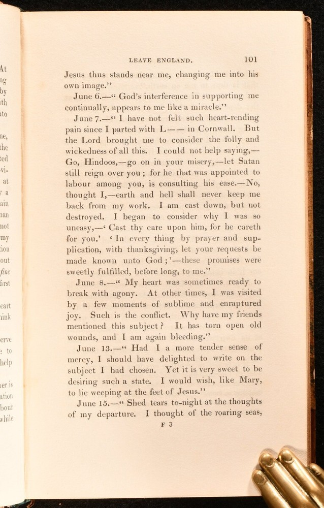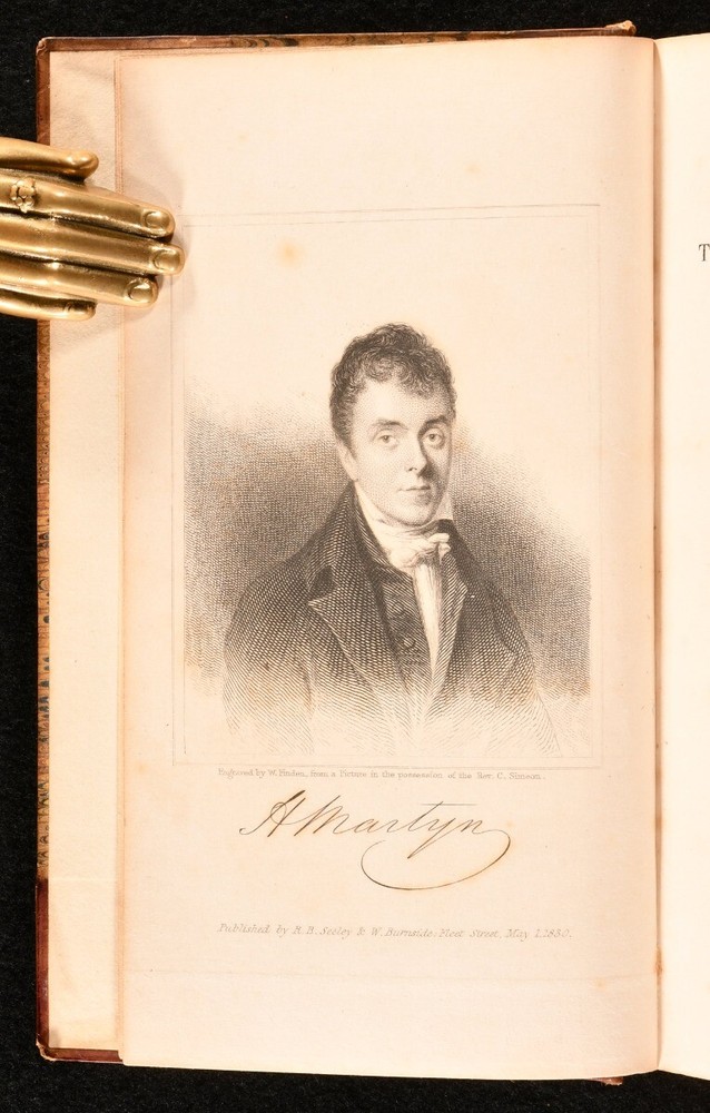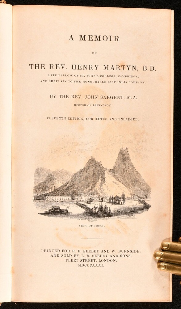 Click here to see our other books! A Memoir of the Rev. Henry Martyn, B. D. Rev. John Sargent 1831 Seeley and Sons : London 7" by 4.5" xii, 1-484pp. SUMMARY A revised and enlarged edition of this scarce volume, comprising Rev. Henry Martyn's memoir of his missions in India and Persia. Leather Binding Overall Condition: Very Good This book weighs 0.75 KG when packed UK Postage: £ 3.99 US Postage: £ 19.99 EU Postage : £ 15.99 European Postage: £ 16.99 Asia Postage: £ 21.99 Worldwide Postage: £ 25.99 DESCRIPTION The eleventh, enlarged and corrected edition stated. This volume contains memoirs of Reverend Henry Martyn, his biography from the academic career to becoming a missionary, including details of his time as a missionary to India and Persia. The contents of this book were taken from Mr. Martyn's personal journals that he kept for his own private use, and from his own account of his visit to Shiraz in Persia. Henry Martyn was an Anglican priest and missionary to the people in India and Persia. CONDITION In half leather binding, with titles in gilt to spine and four raised bands. Externally smart with slight shelfwear and edge wear and slight minor scuffing to leather. Elizabeth Thorold bookplate to front pastedown. Spine has slightly faded. Internally, firmly bound. Faint scattered spotting to fore edge, affecting the occasional page only. Minor offsetting to title page. With frontispiece. Overall Condition: Very Good GLOSSARY OF TERMS Overall Condition (Dustwrapper condition rating is shown after that for the book itself, where a dustwrapper is present) Fine - Very well preserved copy showing very little wear Very Good Indeed - Only one or two minor faults, really a very attractive copy Very Good - Quite a wide term meaning no major faults but probably several smaller ones often expected given the age of the book, but still a respectable copy Good - Meaning not very good. Some more serious faults as will be described in the condition report under 'condition' Good Only - Meaning one or more faults that could really do with repair Fair - As with good only above but with other faults leaving a compromised copy even after repair Poor - Really bad and possibly seriously incomplete. We only sell books in this condition where their rarity or value makes them attractive none the less. Major defects will be described. GUARANTEE We offer a full money back guarantee on our descriptions. Please ask for details and conditions. We prefer PAYPAL. If you pay via PAYPAL we will post the item off the same or the next working day with the postage you have selected. Please note we cannot accept USD cheques