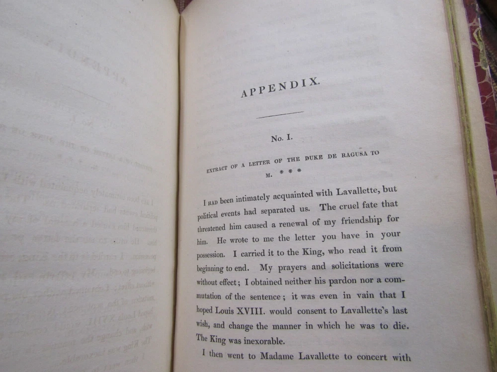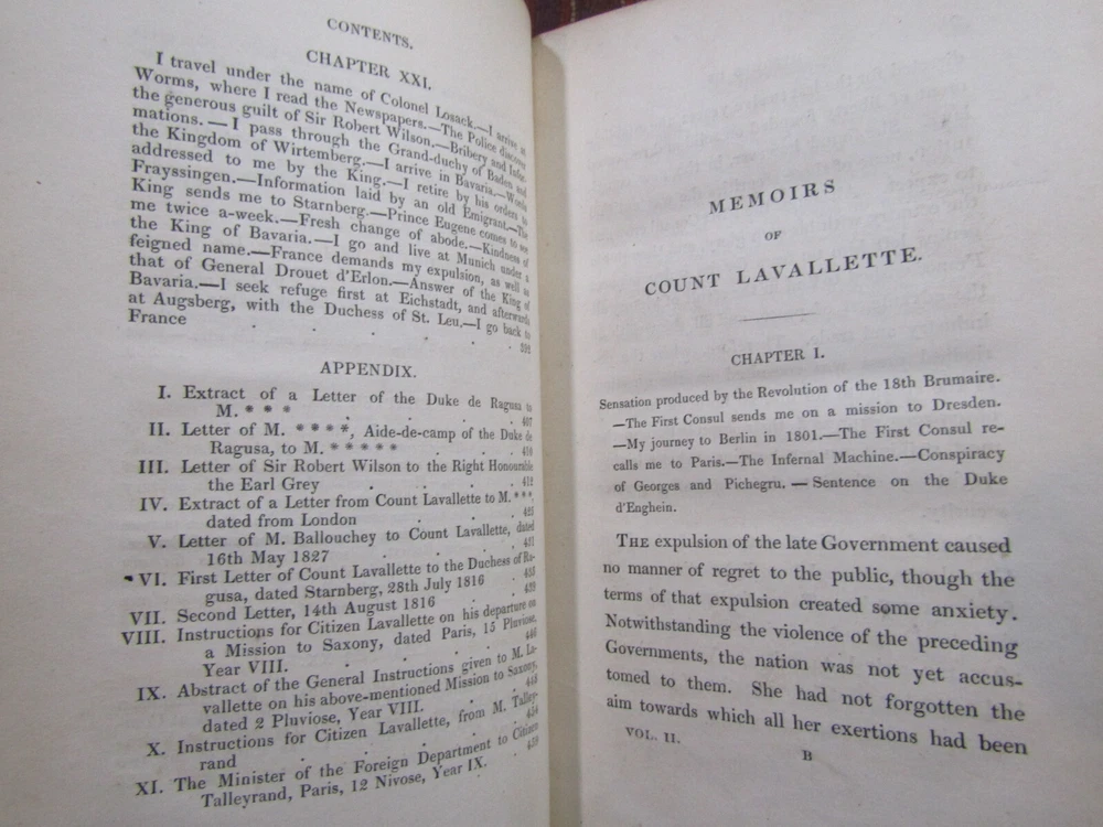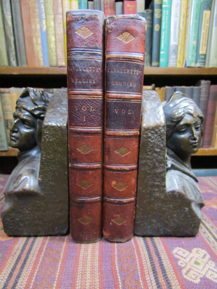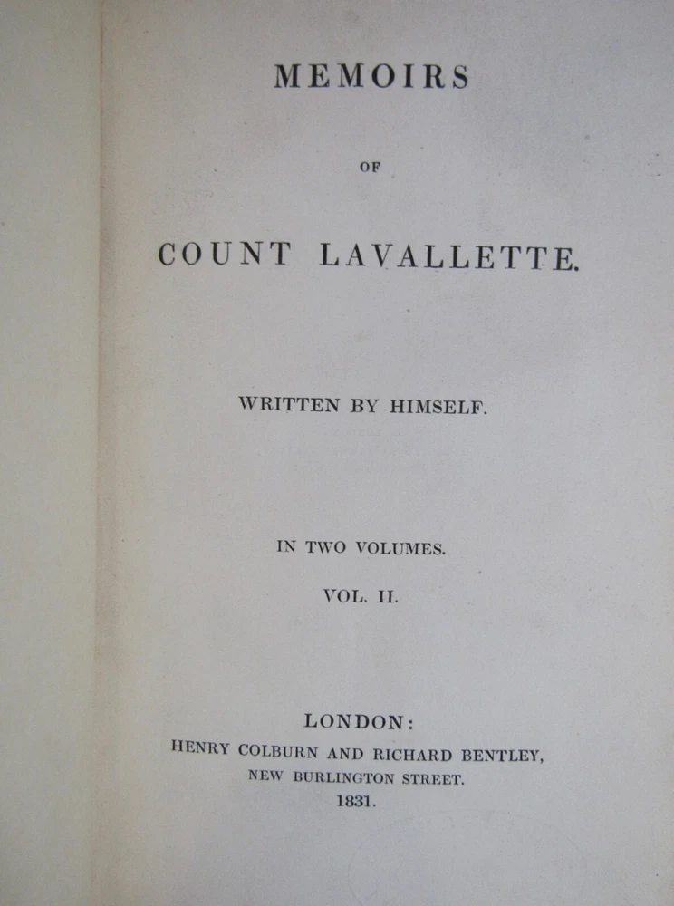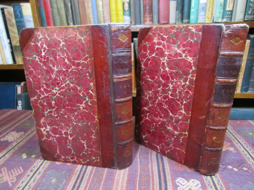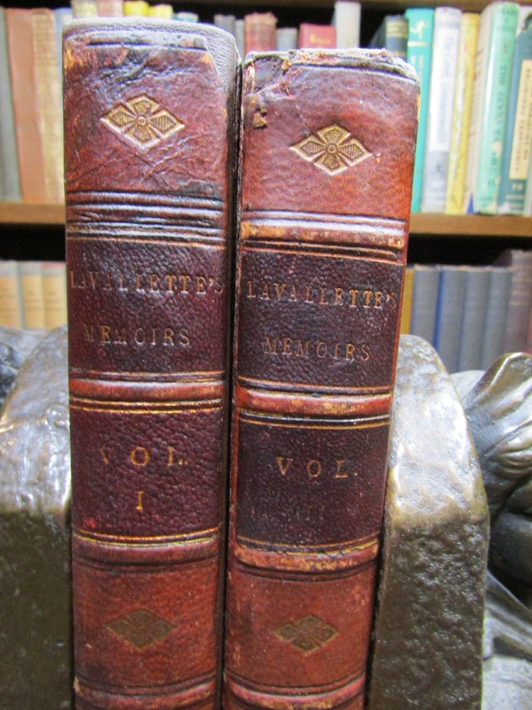 ~~Two Volume Set~~ ~ Attractive Leather Bindings ~ Memoirs of Count Lavallette In Two Volumes By Antoine Marie Chamans Lavallette London: Henry Colburn and Richard Bentley, ~ (1831) ~ ************************************************* Octavos. 412; 459 pages. 2 volume set. Hardcovers bound in 3/4 red leather with red marbled paper covered boards. The bindings are rubbed. Spines are toned, have some light scuffs. 5 raised bands. Black label pastedowns on spines have titles in gilt, which have dulled and darkened. Corners are rubbed down to boards. Fore-edges and bottoms of text blocks are yellow, appear to be faux gilt. Top edges of text blocks are mottled. Volume I has been rebacked with the original spine laid down. New endpapers in Volume I. Both volumes have been placed in modern clear removable mylar dust jackets Antoine Marie Chamans, comte de Lavalette ( 1769-1830 ) was a French politician and general who was in the French Revolutionary Army under Napoleon during the French Revolution. ***************************************** We Always Accept Returns if the Item Does Not Match the Description. If You Have any Questions, Please Do Not Hesitate to Ask! *************************************************** Come visit our OPEN SHOP in Greensboro, North Carolina. Shop Hours: 10-6 Mondays ~~ Saturdays ~~Closed on Sundays~~ Pages Past -- Used & Rare Books / 1837 Spring Garden St. / Greensboro, N.C. 27403 We are proud to have serviced the Greensboro area with an open bookshop since 1996 !