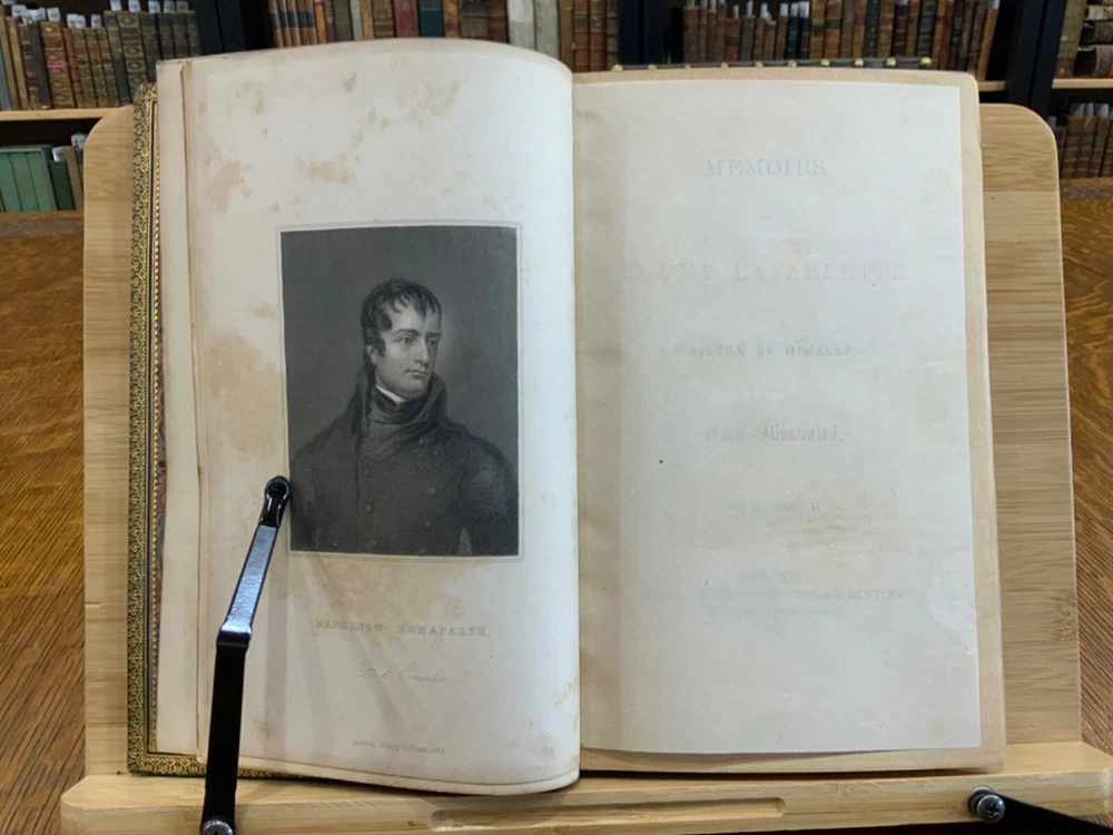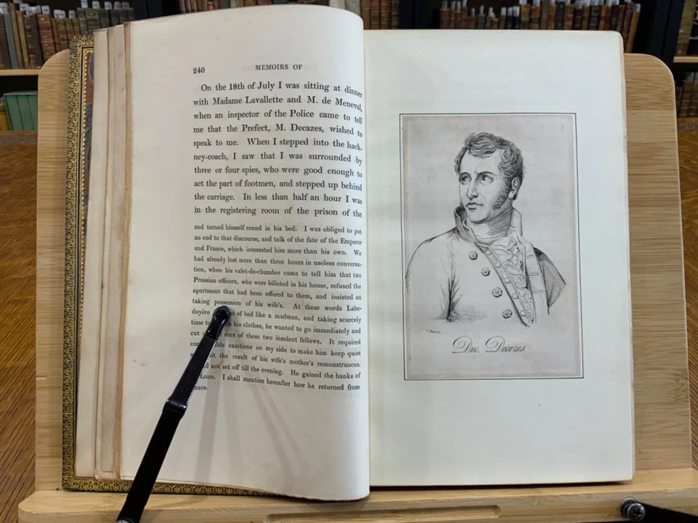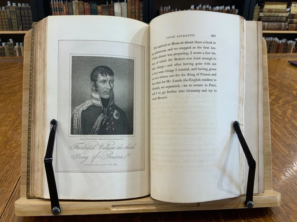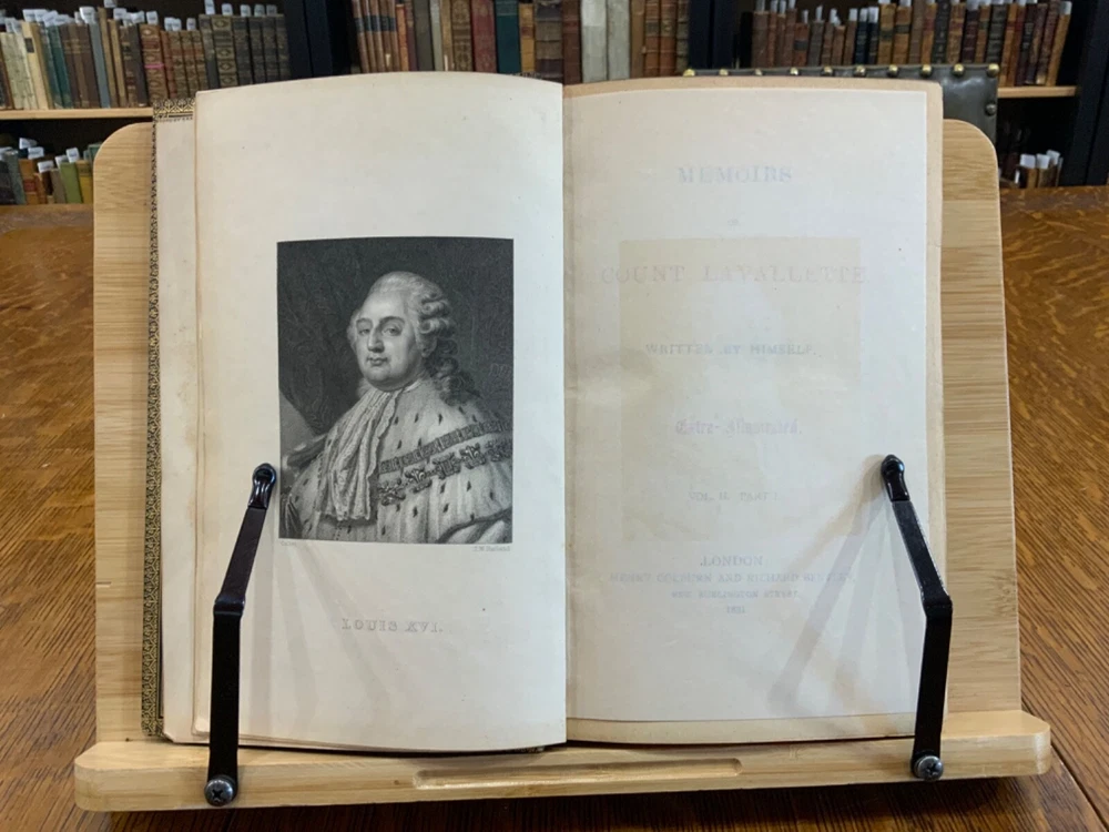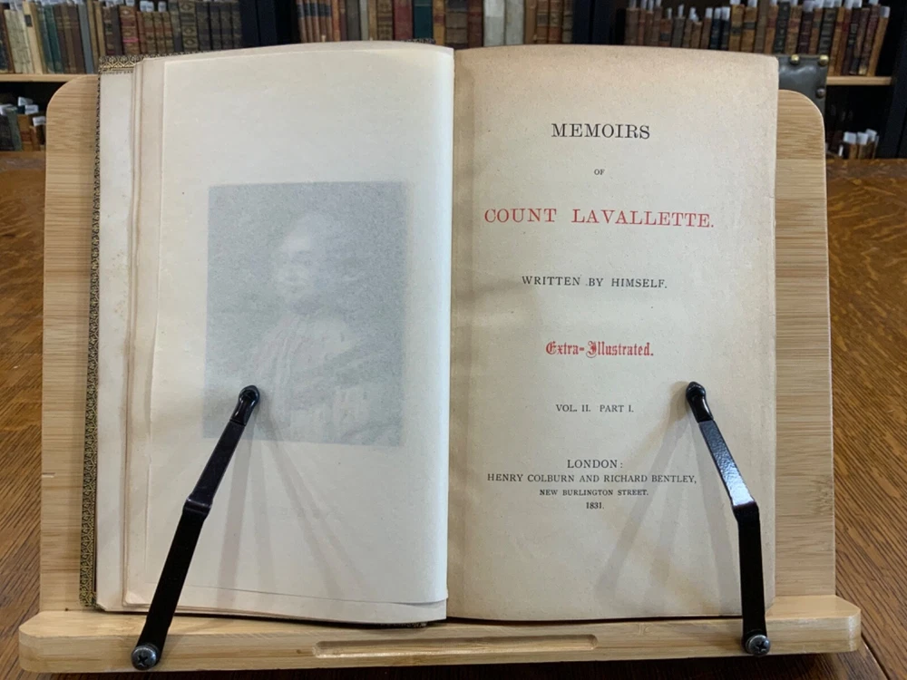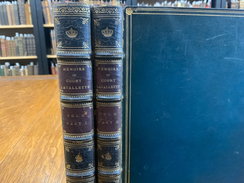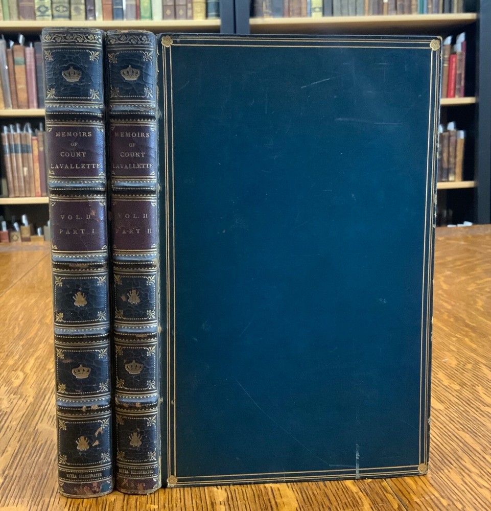 Memoirs of Count Lavalette by himself. Extra-Illustrated. Volume II, Parts I & II ONLY. London: Henry Colburn and Richard Bentley. New Burlington Street. 1831. Continuous Pagination: Part I: 1 - 236 p., Part II: 237 - 459 p. Signed binding by Sancorski & Sutcliffe, London. Fine Moroccan leather binding measuring 9 x 6", 8vos. ***Elaborate banded and ridged spine with crown and bees (Napoleon’s symbols) in alternating blocks with second and third block having an oxblood background with gilt lettering for name and volume number. In good condition. Boards are lightly scuffed at edges and corners. Heads and tails of spines scuffed. Hinges rubbed. Gilt lettering and deco on spines normally toned, but overall bright and attractive. Top edges gilt. Binder's stamps found on front end-pages' (verso) top edges. Text-blocks normally toned, with some light foxing and age-staining around plates. Bindings tight and intact. Please see photos and ask questions, if any, before purchasing. Antoine Marie Chamans, comte de Lavalette (1769 – 1830) was a French politician & an aide-de-camp to Napoleon who met him in 1796. His memoirs tell of the various diplomatic missions that he was sent on during his time on duty with the Emperor. When Napoleon was sent into exile, Lavalette did not go, having a pregnant wife and young daughter. The night before he was to be executed, he escaped by switching clothes with his wife, impersonating her and escaping. There are several portraits of her, along with pictures of Napoleon and other dignitaries of the era. There are approximately 29-30 plates in volume II, part I with a good many being portraits while there are fewer in volume II, part II—about 15 or so—but this contains the exciting tale of his escape from prison while dressed in his wife’s clothes. RAREB1831FOPA - 02/18 COLH1831FPOA - 10/24 - HKREV105