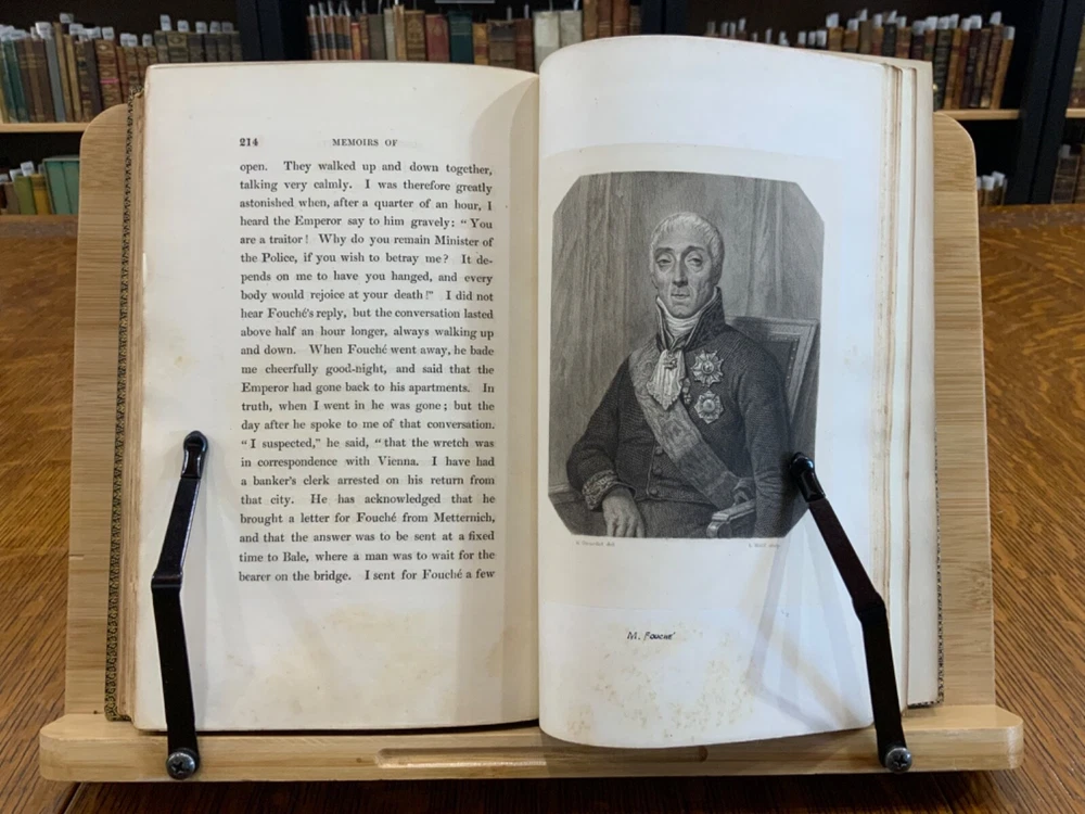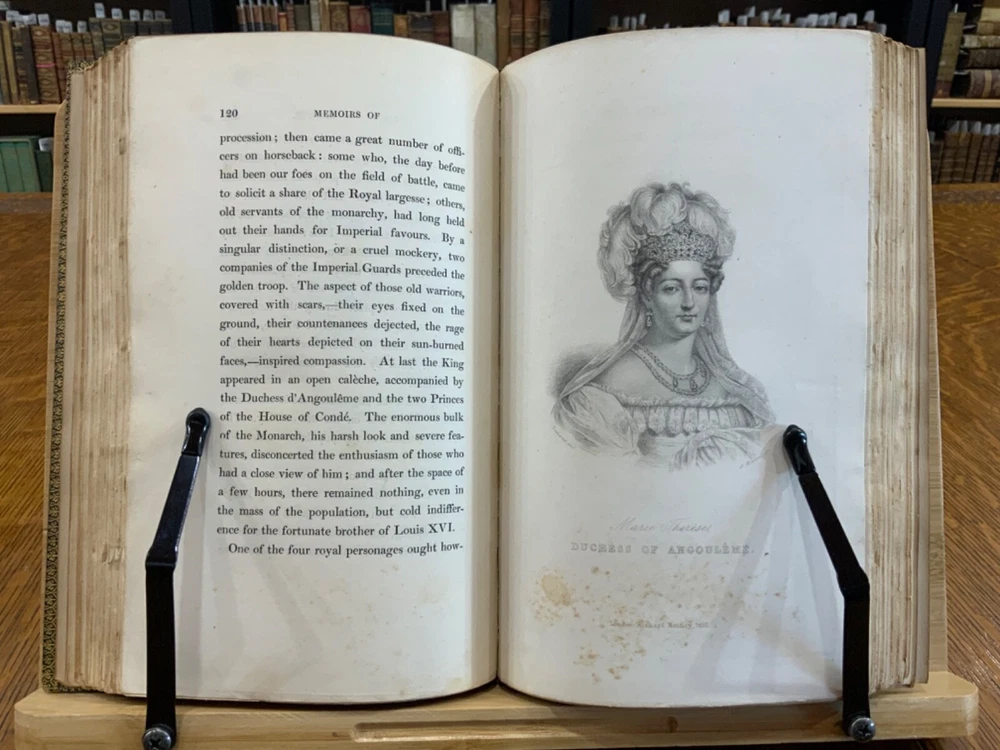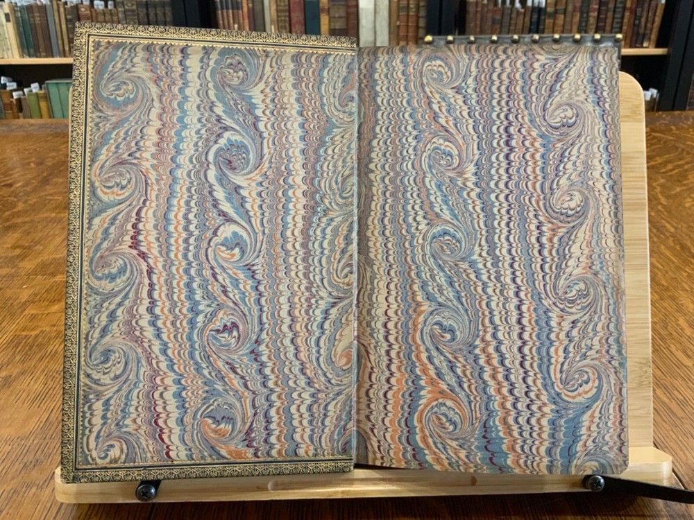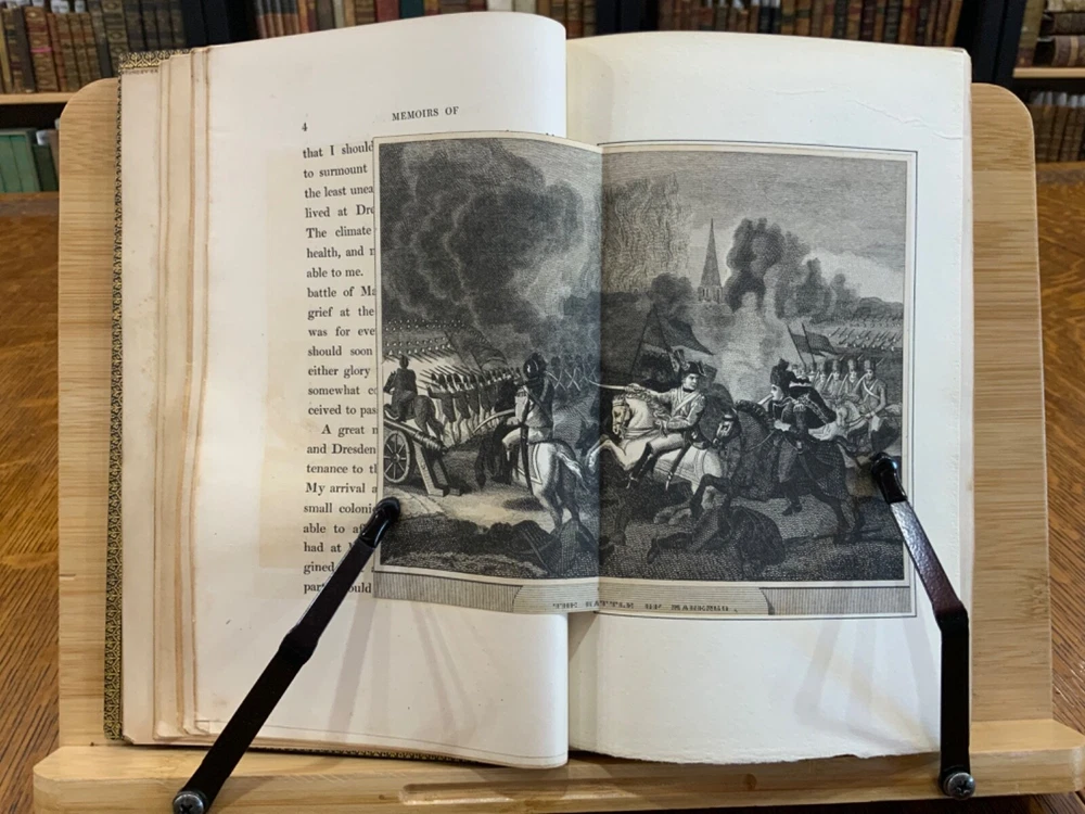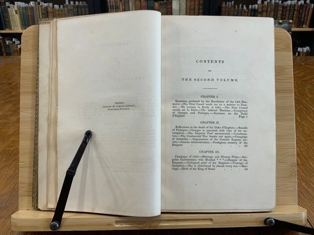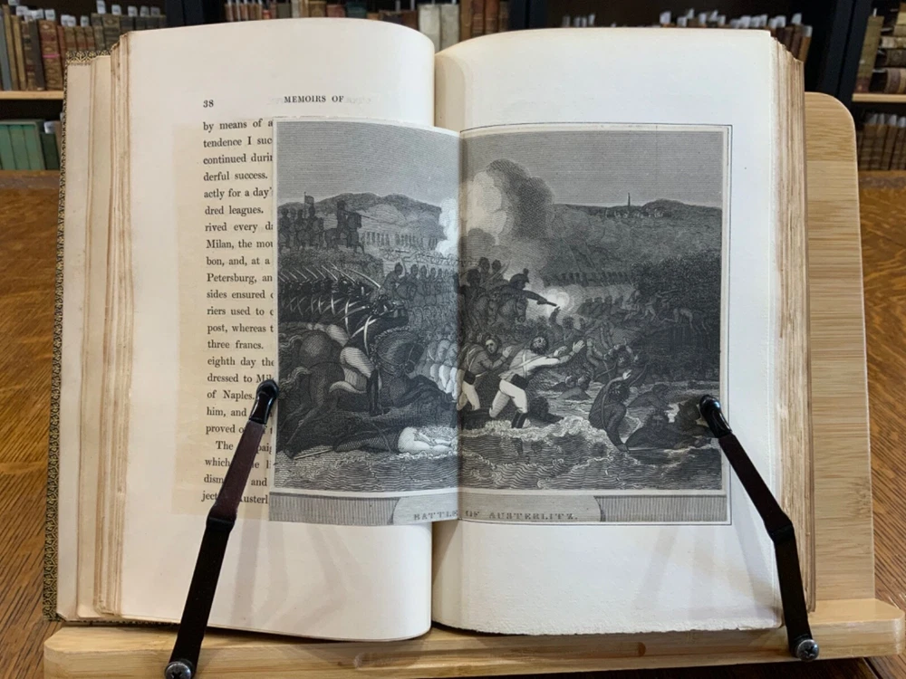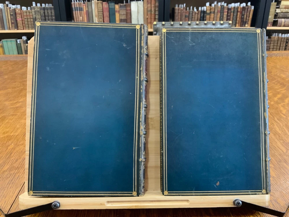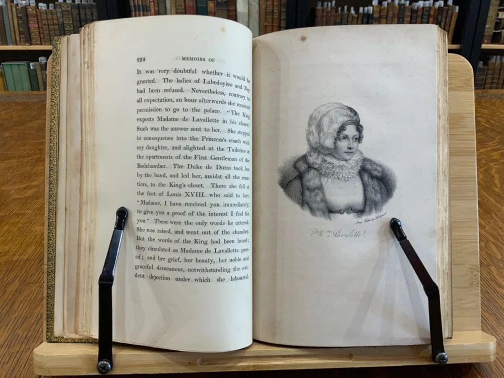 Memoirs of Count Lavalette by himself. Extra-Illustrated. Volume II, Parts I & II ONLY. London: Henry Colburn and Richard Bentley. New Burlington Street. 1831. Continuous Pagination: Part I: 1 - 236 p., Part II: 237 - 459 p. Signed binding by Sancorski & Sutcliffe, London. Fine Moroccan leather binding measuring 9 x 6", 8vos. ***Elaborate banded and ridged spine with crown and bees (Napoleon’s symbols) in alternating blocks with second and third block having an oxblood background with gilt lettering for name and volume number. In good condition. Boards are lightly scuffed at edges and corners. Heads and tails of spines scuffed. Hinges rubbed. Gilt lettering and deco on spines normally toned, but overall bright and attractive. Top edges gilt. Binder's stamps found on front end-pages' (verso) top edges. Text-blocks normally toned, with some light foxing and age-staining around plates. Bindings tight and intact. Please see photos and ask questions, if any, before purchasing. Antoine Marie Chamans, comte de Lavalette (1769 – 1830) was a French politician & an aide-de-camp to Napoleon who met him in 1796. His memoirs tell of the various diplomatic missions that he was sent on during his time on duty with the Emperor. When Napoleon was sent into exile, Lavalette did not go, having a pregnant wife and young daughter. The night before he was to be executed, he escaped by switching clothes with his wife, impersonating her and escaping. There are several portraits of her, along with pictures of Napoleon and other dignitaries of the era. There are approximately 29-30 plates in volume II, part I with a good many being portraits while there are fewer in volume II, part II—about 15 or so—but this contains the exciting tale of his escape from prison while dressed in his wife’s clothes. RAREB1831FOPA - 02/18 COLH1831FPOA - 10/24 - HKREV105