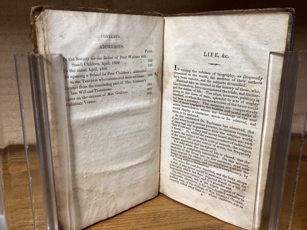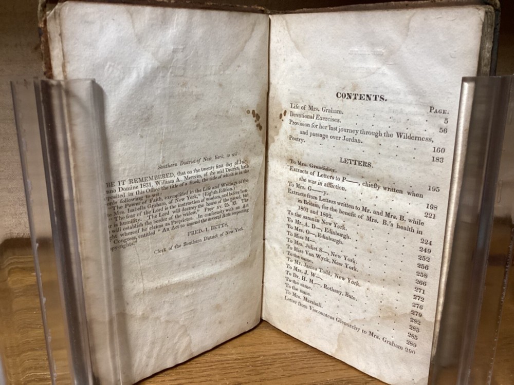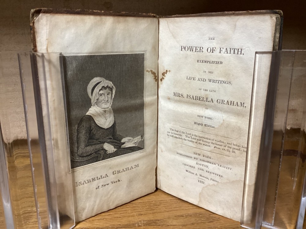 The Power of Faith, Exemplified in the Life and Writings, of the Late Mrs. Isabella Graham. Eighth Edition. Printed in New York City by Jonathan Leavitt. 1831, 303 pp, 7” x 4.5”, 8vo, hardcover full leather. In fair condition, with scuffing and losses to boards. Loss to leather on bottom of spine. Some cracking to hinges at front and rear. Staining remnants throughout parts of text block. Female ownership, with signature at front. Light wear to title label on spine. Occasional wear throughout text block. General age-related toning to pages, along with periodic foxing and wear. Please see photographs and ask any questions prior to purchasing. A scarce later edition of the life of Isabella Graham (1742-1814), a Scottish-American philanthropist and educator who dedicated much of her life to educating and caring for the poor in both Scotland and the United States. COLR1831ABCB-0724-aj1997