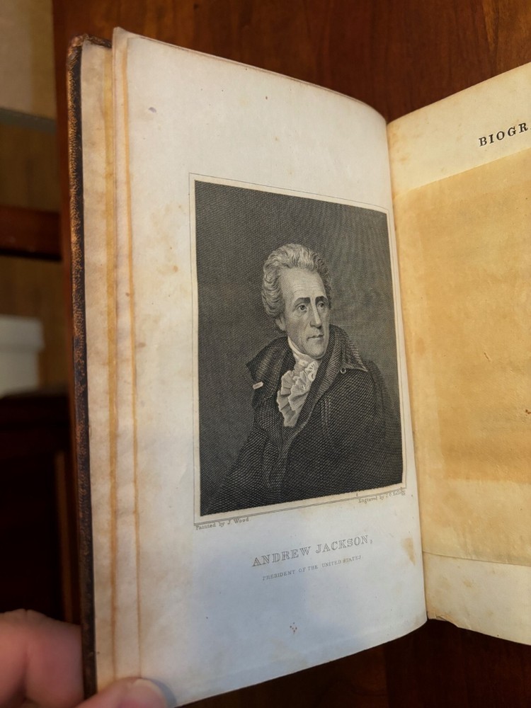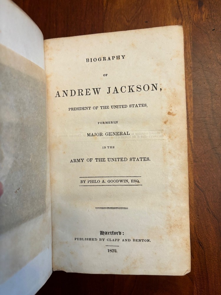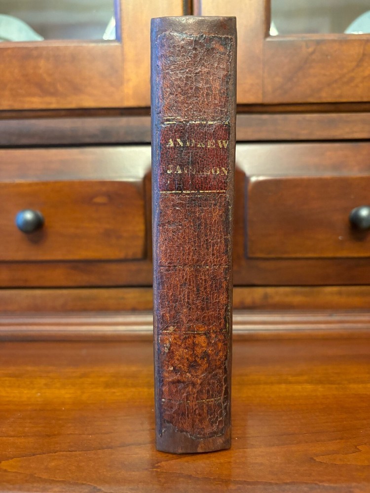 Biography of Andrew Jackson By Philo A. Goodwin Published: Clapp and Benton, Hartford, 1832 . Hardcover in full calf leather binding, with red morroco spine label, spine laid down, ex-lib, frontispiece portrait VG, 422 pp, 4.5x7", calf rubbed, paper VG, original owner's name T.M. Hughes dated on fep January 21, 1832. I've done my best to describe the book, but if you have additional questions, please don't hesitate to send me an e-mail.