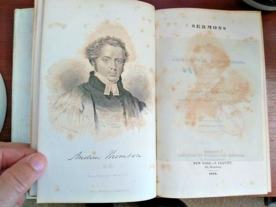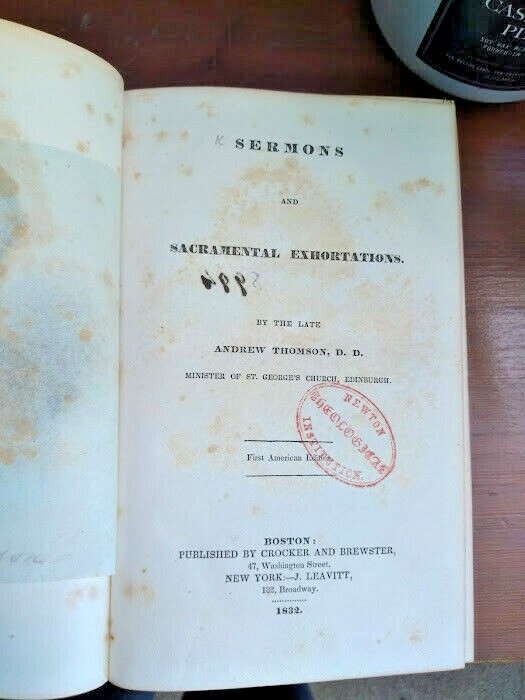 Greetings! Old Saratoga Books is pleased to offer: Sermons and Sacramental Exhortations, by The Late Andrew Thomson, D. D., Boston: Crocker and Brewster, 1832, first American edition. Ex-seminary library copy in Good condition. Front boards cracked at outer joint, boards worn, library stamps and markings on front and verso of title page and rear free endpaper, contemporary gift inscription on front flyleaf, owner bookplate on front pastedown. Brown leather binding with leather spine label. Marbled endpapers and edges. Frontispiece engraved portrait of Thomson with tissue guard. lix, 447 pp. A collection of 22 selected sermons by the minister of Edinburgh's St. George's Church published directly after his untimely demise. The unattributed memoir preface to this volume notes that Rev. Thomson, in addition to being a parish minister, was active in the Church of Scotland and in public circles about the immediate abolition of slavery in the British colonies. Thank you for visiting our auctions. Old Saratoga Books owners Dan and Rachel Jagareski have been selling books since 1996. We had an open shop for twenty years in the historic village of Schuylerville and now sell books exclusively online. We are members of the Independent Online Booksellers Association (IOBA).