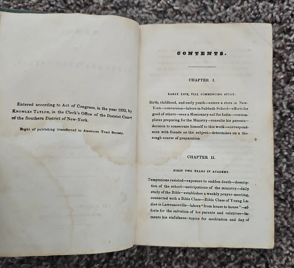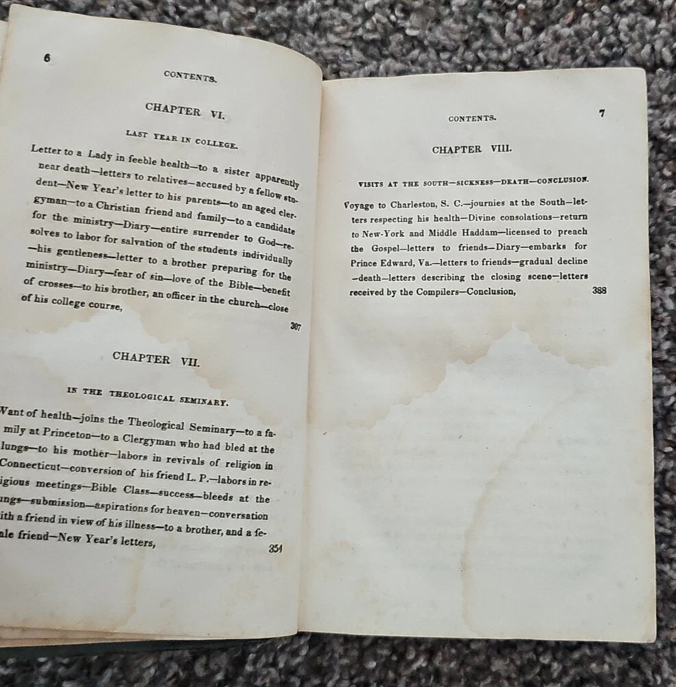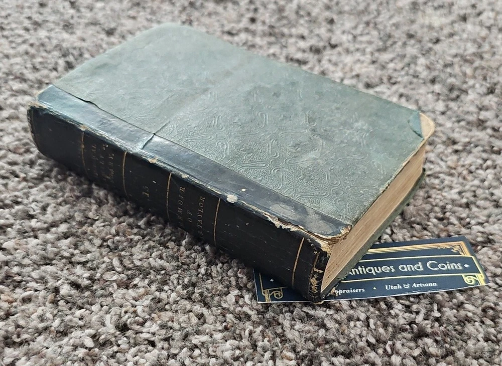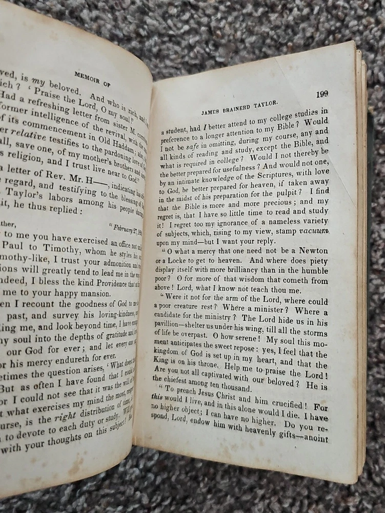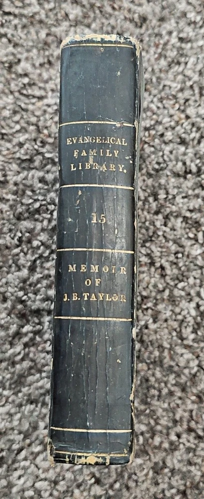 MEMOIR OF JAMES BRAINERD TAYLOR by John Holt Rice and Benjamin Holt Rice second stereotype edition Published by the American Tract Society Measures 3 3/4" x 6" and is 441 pages Condition: The hardback cover has a pressed design in the green cloth covered boards. The cloth on the corners is worn with the boards showing. The leather spine has gold gilt bands and lettering. It has rubbing to the leather (see pictures) but no chipping. The binding is tight. The inside front cover has pencil writing. The first 10 and last 50 pages have light moisture stains on part of the page. The rest of the pages have normal foxing or yellowing but are in very good condition.