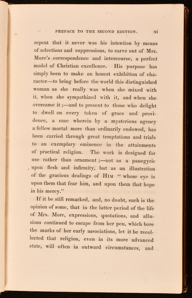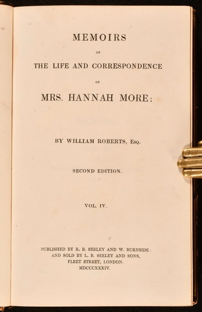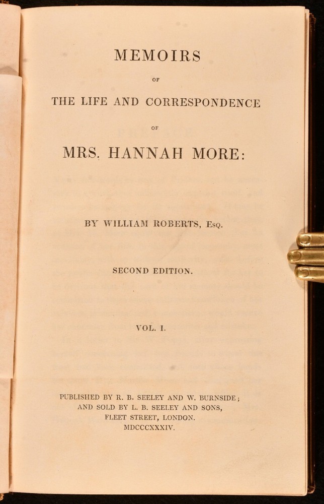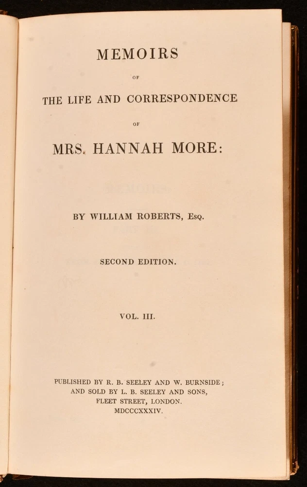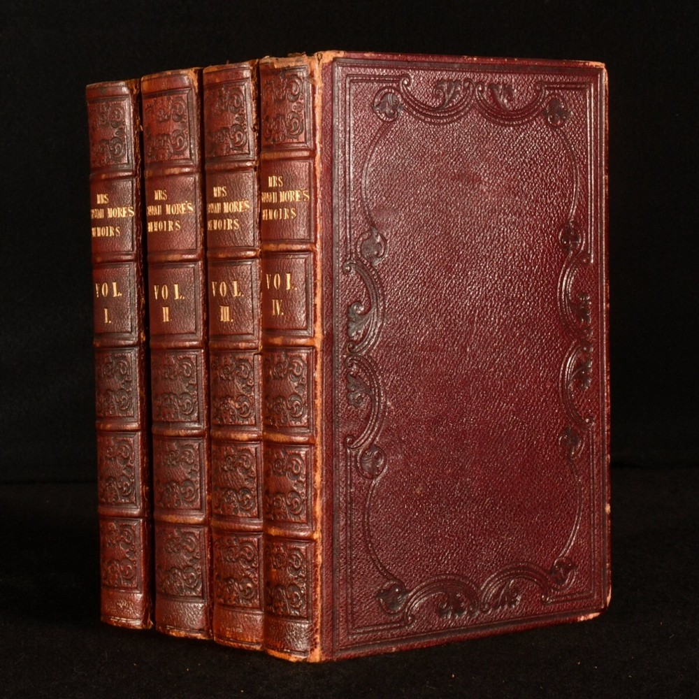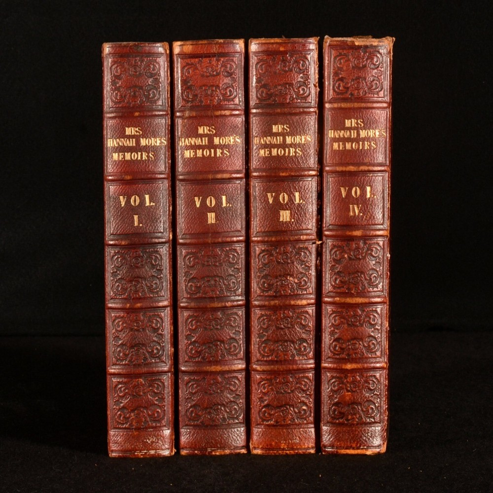 Click here to see our other books! Memoirs of the Life and Correspondence of Mrs. Hannah More William Roberts 1834 R. B. Seeley and W. Burnside : London 7.5" by 4.5" xxiii, 407; [2], 478; [2], 466; [2], 448pp SUMMARY A complete four volume set of Memoirs of the Life and Correspondence of Mrs. Hannah More by William Roberts. Leather Binding Overall Condition: Very Good This book weighs 4 KG when packed UK Postage: £ 4.49 US Postage: £ 39.99 EU Postage : £ 25.99 European Postage: £ 27.99 Asia Postage: £ 47.99 Worldwide Postage: £ 69.99 DESCRIPTION Second edition copies of Memoirs of the Life and Correspondence of Mrs. Hannah More by William Roberts. Hannah More was an English religious writer, poet and playwright who wrote on moral and religious subjects. These volumes explore her life and writings, considering her involvement in the London literary elite and as a leading Bluestocking member. William Roberts was the first biographer of Hannah More. With a frontispiece to the first volume. CONDITION In full morocco binding. Externally, smart with some rubbing to the spines and extremities. Light marks to the boards. Internally, firmly bound with bright and clean pages. Overall Condition: Very Good GLOSSARY OF TERMS Overall Condition (Dustwrapper condition rating is shown after that for the book itself, where a dustwrapper is present) Fine - Very well preserved copy showing very little wear Very Good Indeed - Only one or two minor faults, really a very attractive copy Very Good - Quite a wide term meaning no major faults but probably several smaller ones often expected given the age of the book, but still a respectable copy Good - Meaning not very good. Some more serious faults as will be described in the condition report under 'condition' Good Only - Meaning one or more faults that could really do with repair Fair - As with good only above but with other faults leaving a compromised copy even after repair Poor - Really bad and possibly seriously incomplete. We only sell books in this condition where their rarity or value makes them attractive none the less. Major defects will be described. GUARANTEE We offer a full money back guarantee on our descriptions. Please ask for details and conditions. We prefer PAYPAL. If you pay via PAYPAL we will post the item off the same or the next working day with the postage you have selected. Please note we cannot accept USD cheques