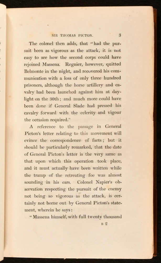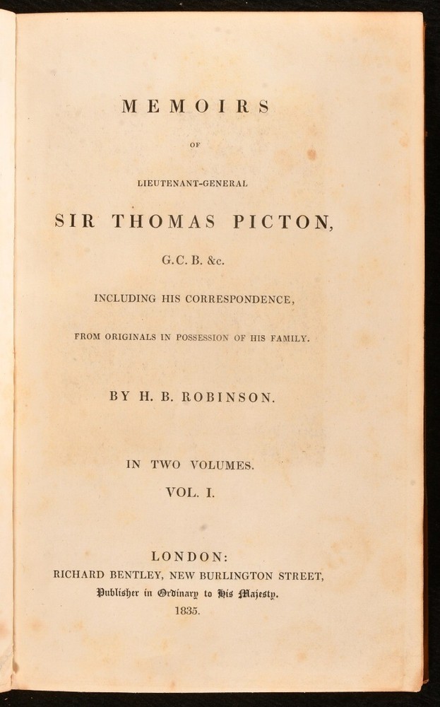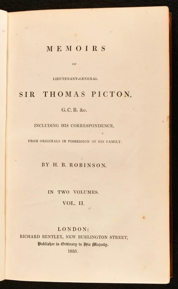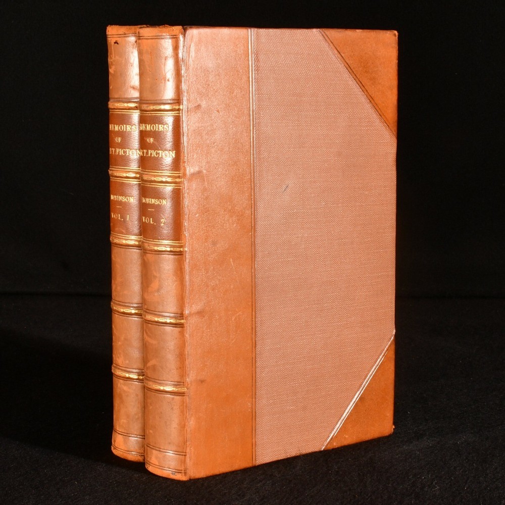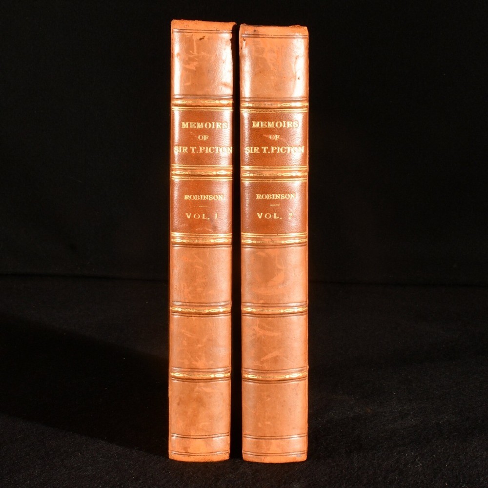 Click here to see our other books! Memoirs of Lieutenant-General Sir Thomas Picton H. B. Robinson 1835 Richard Bentley : London 8.5" by 5.5" xvi, 404; xi, 446pp SUMMARY A smart complete two volume set of the Memoirs of Lieutenant-General Sir Thomas Picton. First Edition,Illustrated,Leather Binding Overall Condition: Very Good Indeed This book weighs 2 KG when packed UK Postage: £ 3.99 US Postage: £ 29.99 EU Postage : £ 21.99 European Postage: £ 23.99 Asia Postage: £ 37.99 Worldwide Postage: £ 38.99 DESCRIPTION A complete two volume set of the Memoirs of Lieutenant-General Sir Thomas Picton, including his correspondence, from originals in possession of his family, by H. B. Robinson. Thomas Picton was a British Army officer who fought during the Napoleonic Wars, and these volumes detail his life. With a frontispiece and plan to the first volume. Collated, complete. With the bookplate of Major Fawkner-Corbett. CONDITION In half calf binding with cloth covered boards. Externally, very smart with some light rubbing to the spines. With a bookplate to Major Fawkner-Corbett to both front pastedowns. Internally, firmly bound with generally bright and clean pages. Overall Condition: Very Good Indeed GLOSSARY OF TERMS Overall Condition (Dustwrapper condition rating is shown after that for the book itself, where a dustwrapper is present) Fine - Very well preserved copy showing very little wear Very Good Indeed - Only one or two minor faults, really a very attractive copy Very Good - Quite a wide term meaning no major faults but probably several smaller ones often expected given the age of the book, but still a respectable copy Good - Meaning not very good. Some more serious faults as will be described in the condition report under 'condition' Good Only - Meaning one or more faults that could really do with repair Fair - As with good only above but with other faults leaving a compromised copy even after repair Poor - Really bad and possibly seriously incomplete. We only sell books in this condition where their rarity or value makes them attractive none the less. Major defects will be described. GUARANTEE We offer a full money back guarantee on our descriptions. Please ask for details and conditions. We prefer PAYPAL. If you pay via PAYPAL we will post the item off the same or the next working day with the postage you have selected. Please note we cannot accept USD cheques