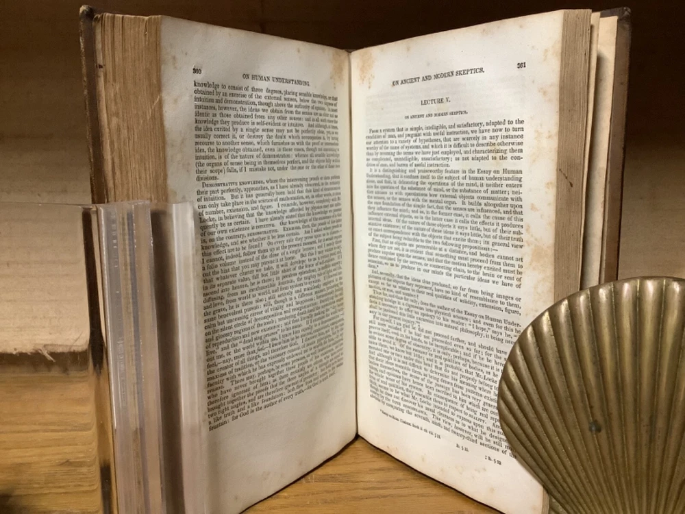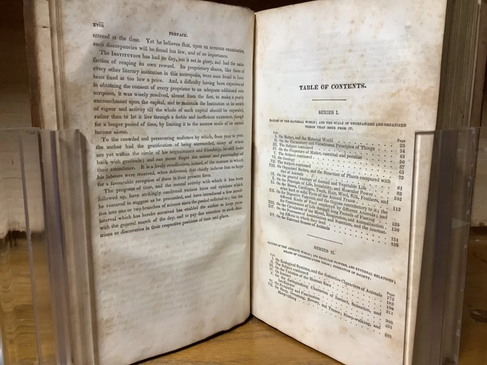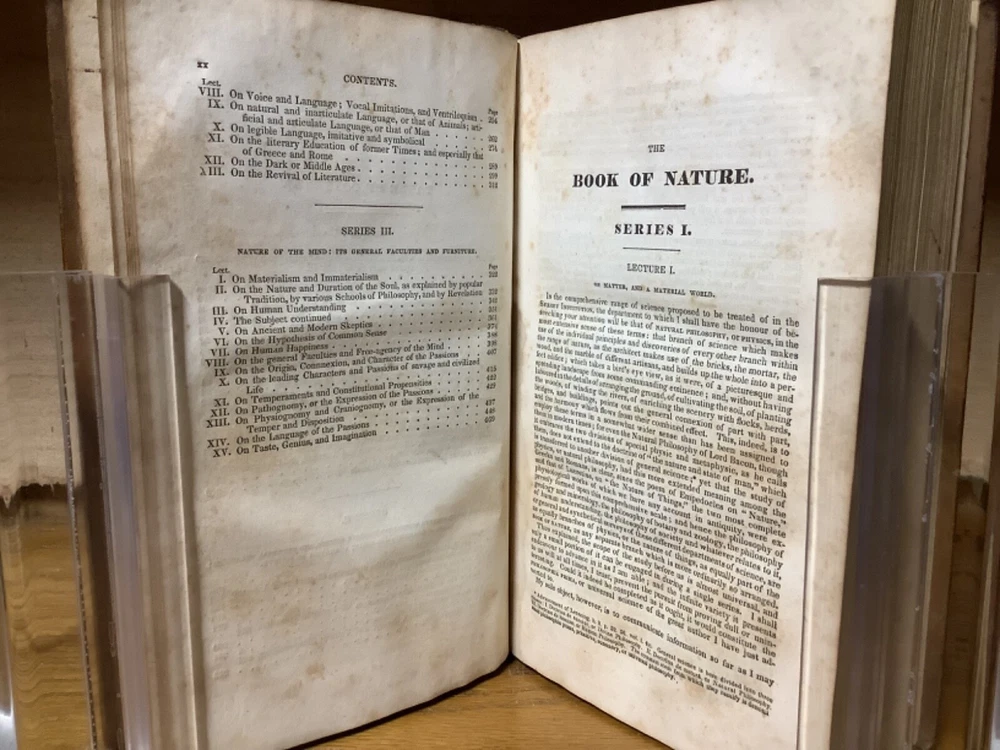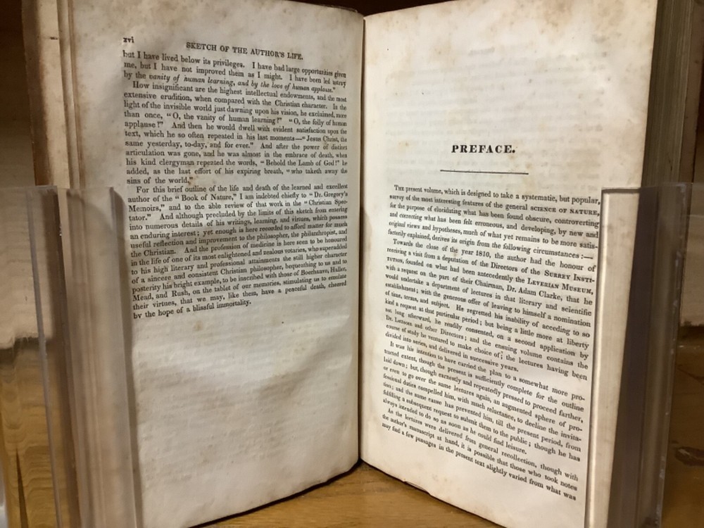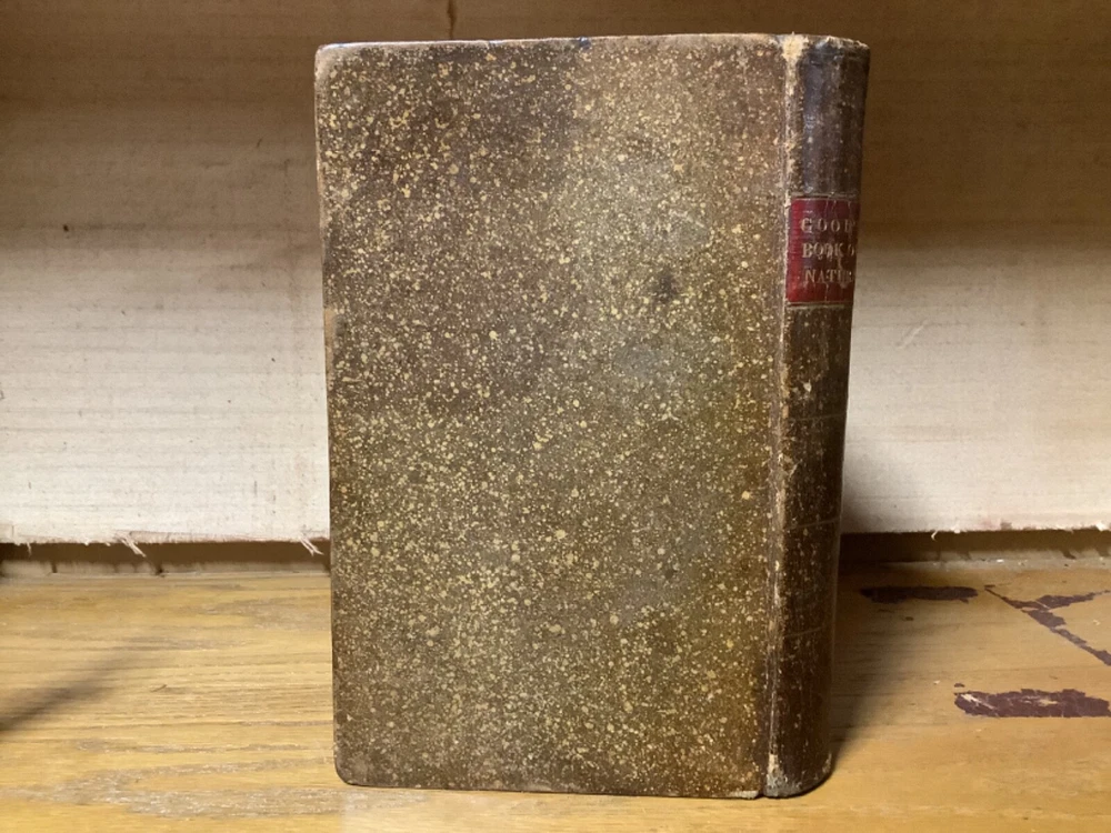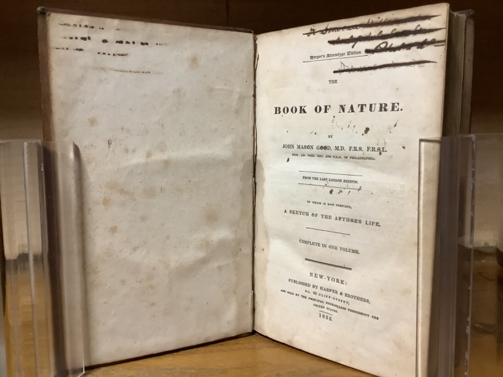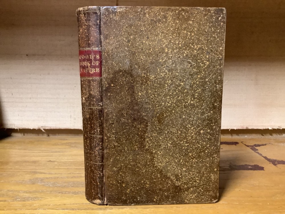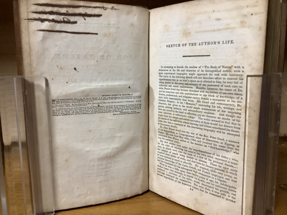 The Book of Nature. By John Mason Good and printed in New York City by Harper & Brothers. 1835, 467 pp, 9” x 5.75”, 8vo, hardcover full leather. In good condition, with minor rubbing and wear to boards and spine, primarily along edges and corners. Superficial staining to boards, primarily at front. Hinges remain in good condition with light wear and text block remains bound well. Light markings and marginalia, primarily at front of book. General age-related toning to pages, along with periodic foxing and wear. Please see photographs and ask any questions prior to purchasing. An interesting scientific and philosophical work by the late John Mason Good (1764-1827), an English historical, religious, and scientific writer, including a biography of his life and works. COLN1835HSCT 0124-aj0891