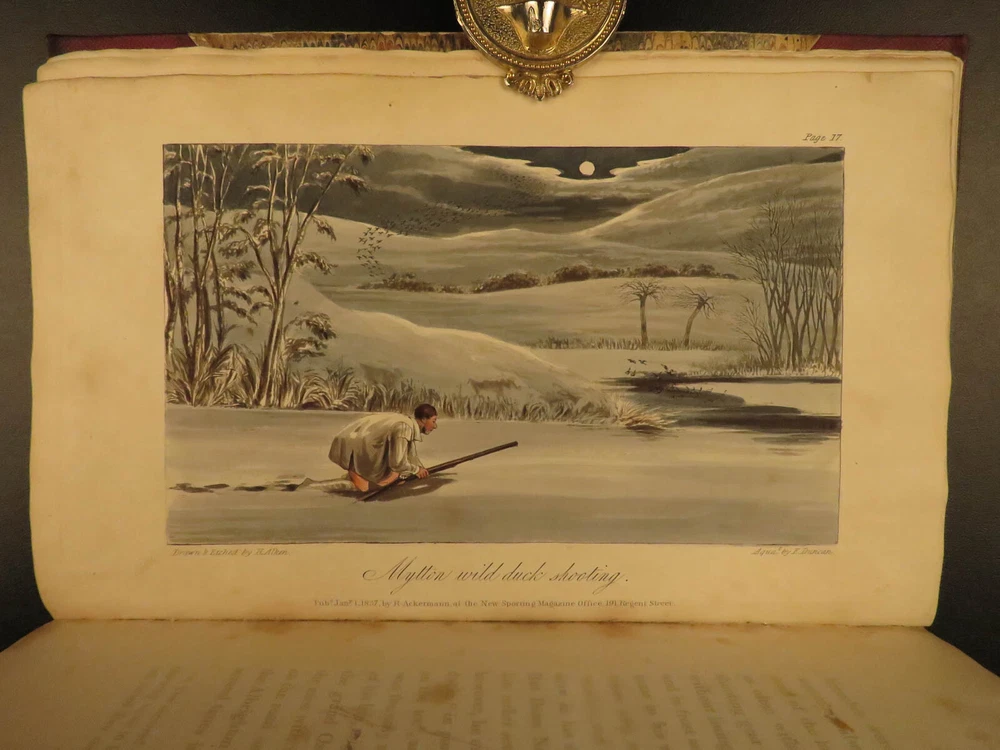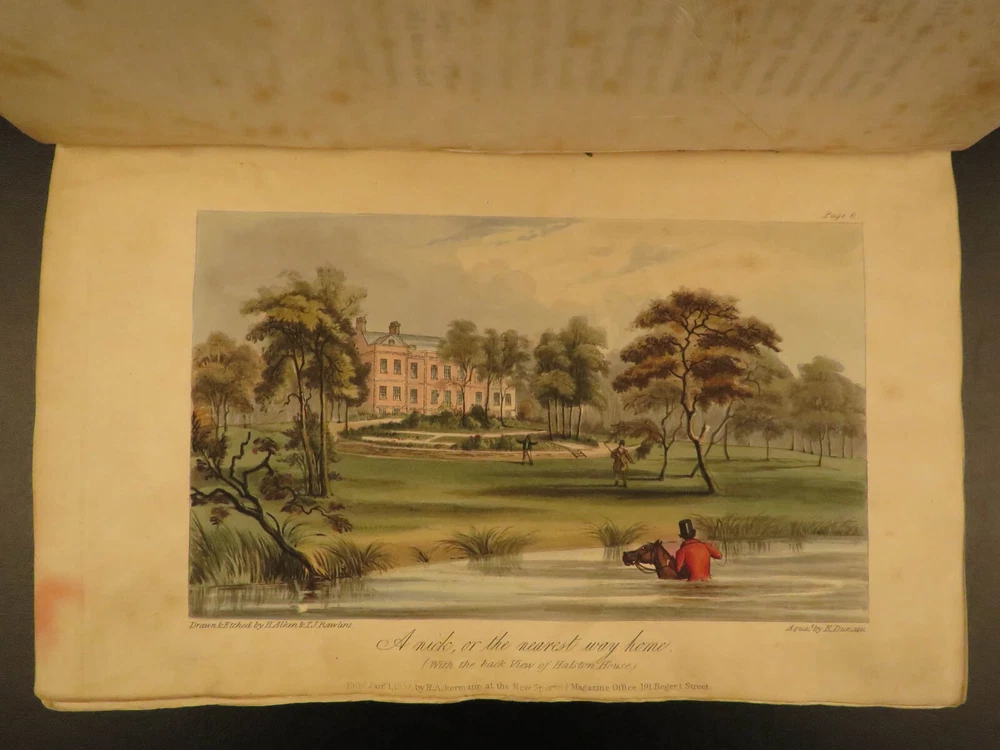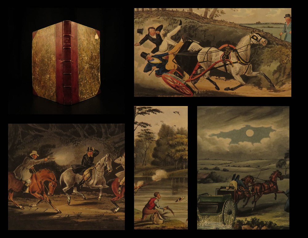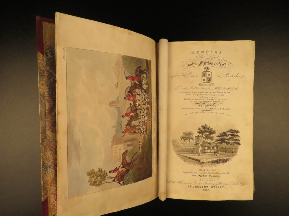1837 Memoirs of John Mytton HUNTING Sports Color Illustrated Alken & Rawlins Charles Apperley’s book ‘Memoirs of the life of the late John Mytton’ is a fascinating biography with beautiful color illustrations depicting different hunting scenes, which fell in line with Apperley’s work writing for the Sporting Magazine of London. "This is not a work of fiction, for John Mytton, a rather inglorious character for a biography, was a hard-living, hard-drinking country squire of Halston, Shropshire, capable of the utmost physical endurance, and ready to accept any wager to walk, shoot or ride against any man. Many of his feats are recorded and graphically delineated, including the climax of his folly in setting his nightshirt on fire to cure a hiccough” (Martin Hardie). "A most valuable and important book for the sporting life of the period , aptly described by Newton as 'a biography of a man that reads like a work of fiction'" (Tooley). This 1837 edition is illustrated with 17 hand-colored aquatint plates by Henry Alken and T.J. Rawlins with original hand-coloring in full page format! Item number: #7733 Price: $550 APPERLEY, Charles James, aka NIMROD Memoirs of the life of the late John Mytton, Esq., of Halston, Shropshire ...: with notices of his hunting, shooting, driving, racing, eccentric and extravagant exploits London: Rudolph Ackermann, Eclipse Sporting Gallery, and New Sporting Magazine Office, 191 Regent Street, 1837. Details : · Collation: o [ix], [1], 206 o 17 plates · References: Tooley 67. Schwerdt 1, p. 38. Abbey, Life, 385. Martin Hardie, pp. 185-186. Prideaux, p. 326. · Language: English · Binding: Leather; tight and secure o Visible repair to front and back board · Size : ~9.5in X 6in (24cm x 15.5cm) · Very rare with auction estimates and price comparisons as high as $2,000 Our Guarantee: Very Fast. Very Safe. Free Shipping Worldwide. Customer satisfaction is our priority! Notify us with 7 days of receiving, and we will offer a full refund without reservation! 7733