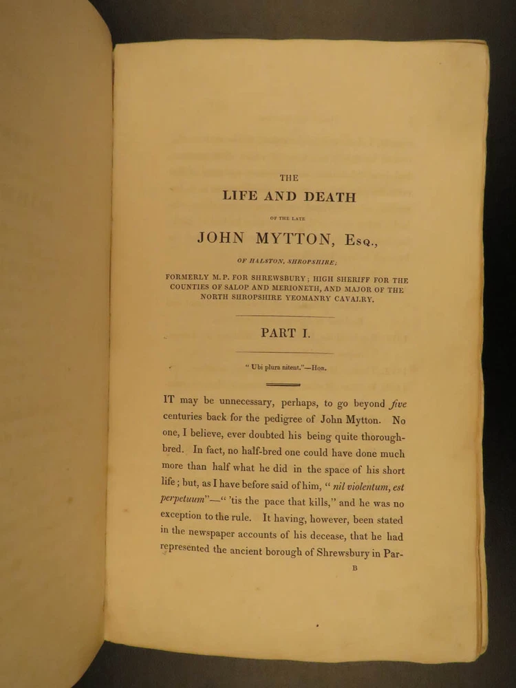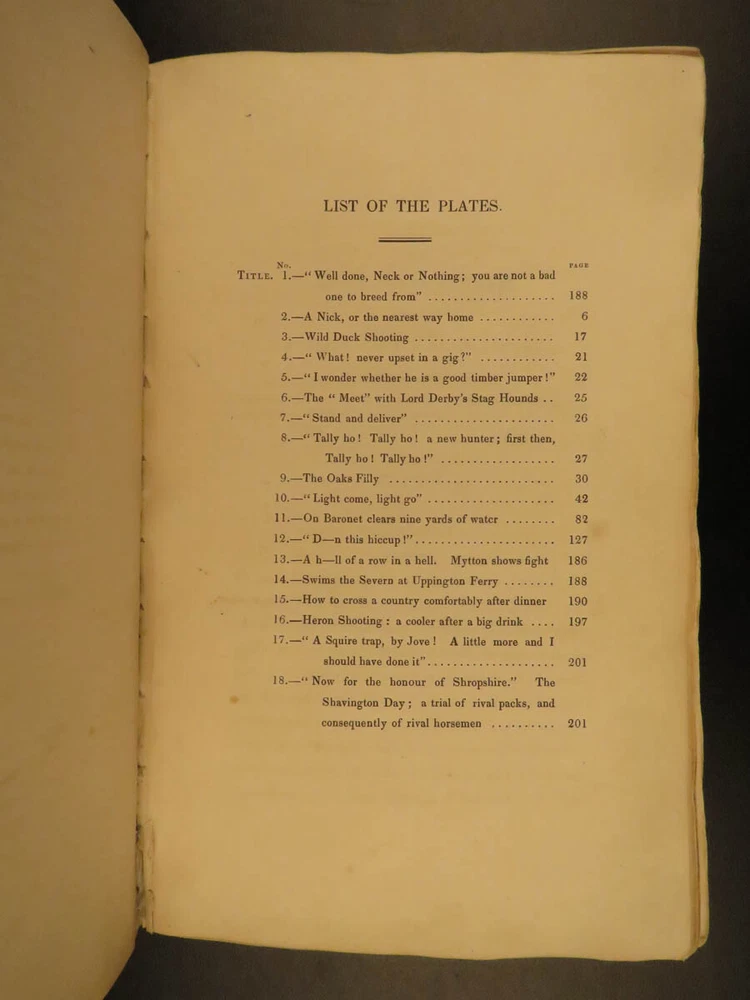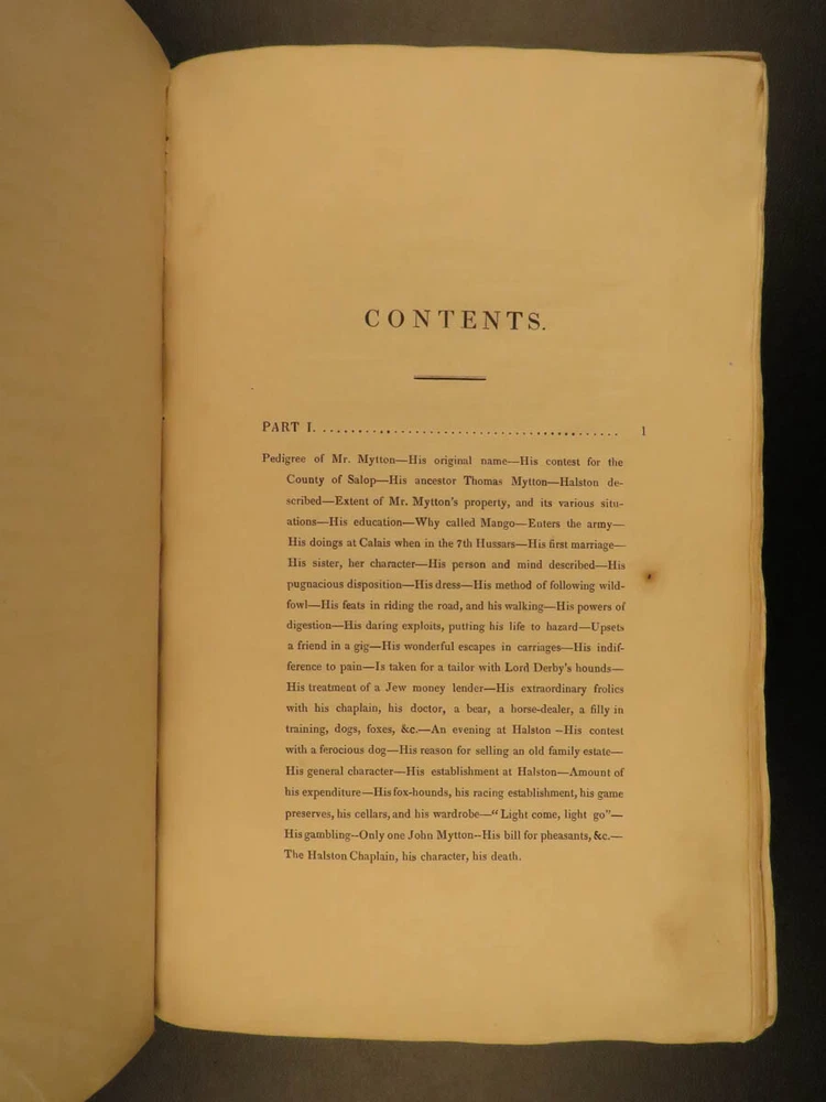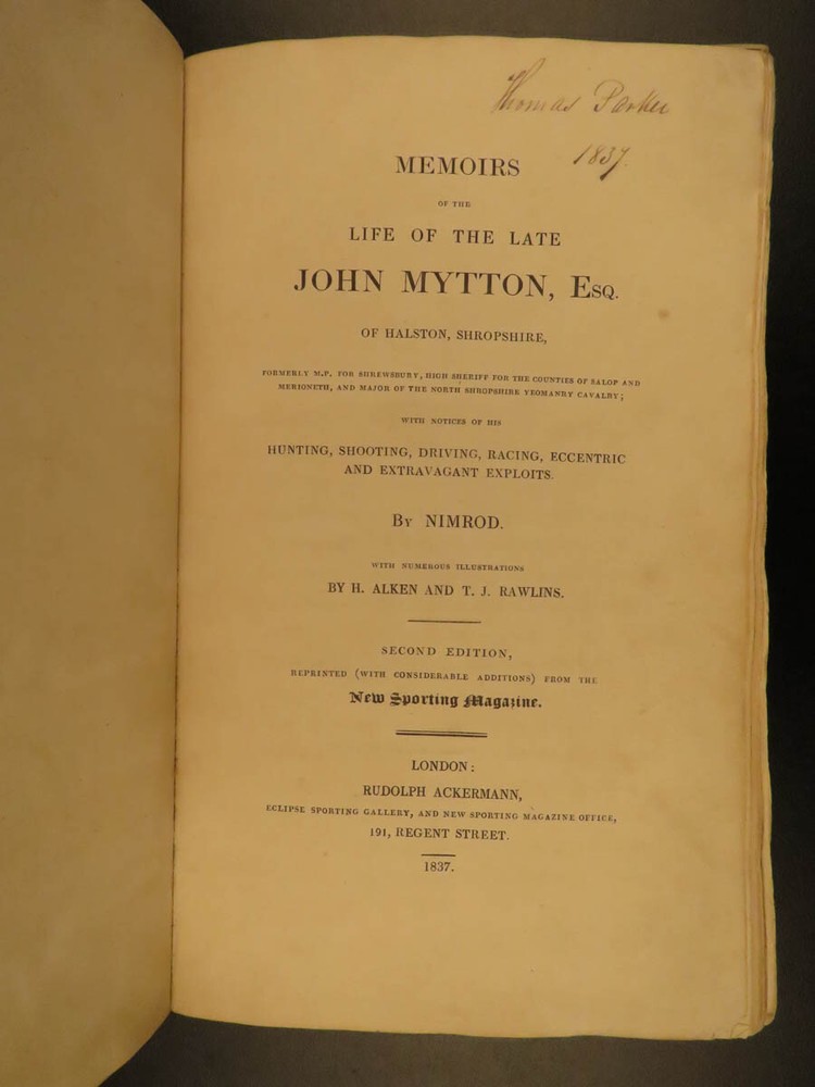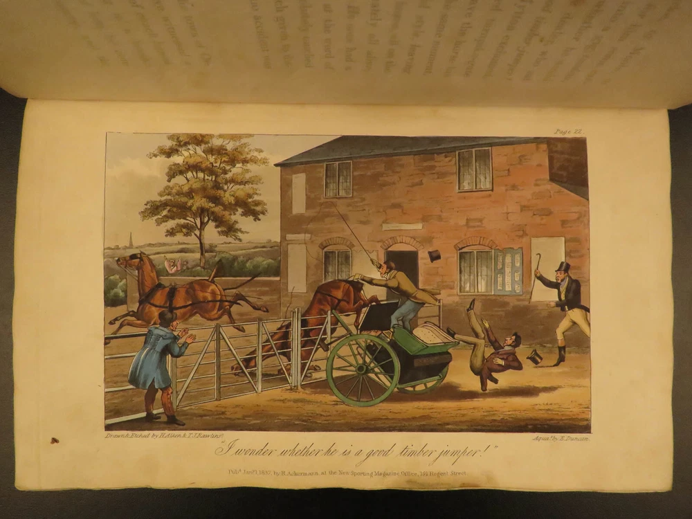 1837 Memoirs of John Mytton HUNTING Sports Color Illustrated Alken & Rawlins Charles Apperley’s book ‘Memoirs of the life of the late John Mytton’ is a fascinating biography with beautiful color illustrations depicting different hunting scenes, which fell in line with Apperley’s work writing for the Sporting Magazine of London. "This is not a work of fiction, for John Mytton, a rather inglorious character for a biography, was a hard-living, hard-drinking country squire of Halston, Shropshire, capable of the utmost physical endurance, and ready to accept any wager to walk, shoot or ride against any man. Many of his feats are recorded and graphically delineated, including the climax of his folly in setting his nightshirt on fire to cure a hiccough” (Martin Hardie). "A most valuable and important book for the sporting life of the period , aptly described by Newton as 'a biography of a man that reads like a work of fiction'" (Tooley). This 1837 edition is illustrated with 17 hand-colored aquatint plates by Henry Alken and T.J. Rawlins with original hand-coloring in full page format! Item number: #7733 Price: $550 APPERLEY, Charles James, aka NIMROD Memoirs of the life of the late John Mytton, Esq., of Halston, Shropshire ...: with notices of his hunting, shooting, driving, racing, eccentric and extravagant exploits London: Rudolph Ackermann, Eclipse Sporting Gallery, and New Sporting Magazine Office, 191 Regent Street, 1837. Details : · Collation: o [ix], [1], 206 o 17 plates · References: Tooley 67. Schwerdt 1, p. 38. Abbey, Life, 385. Martin Hardie, pp. 185-186. Prideaux, p. 326. · Language: English · Binding: Leather; tight and secure o Visible repair to front and back board · Size : ~9.5in X 6in (24cm x 15.5cm) · Very rare with auction estimates and price comparisons as high as $2,000 Our Guarantee: Very Fast. Very Safe. Free Shipping Worldwide. Customer satisfaction is our priority! Notify us with 7 days of receiving, and we will offer a full refund without reservation! 7733
