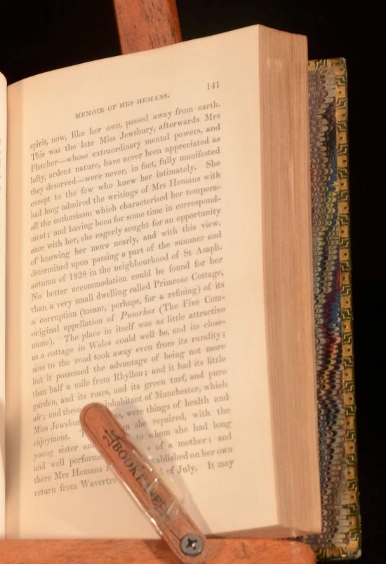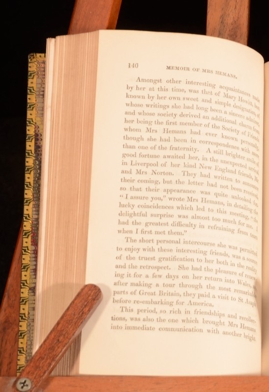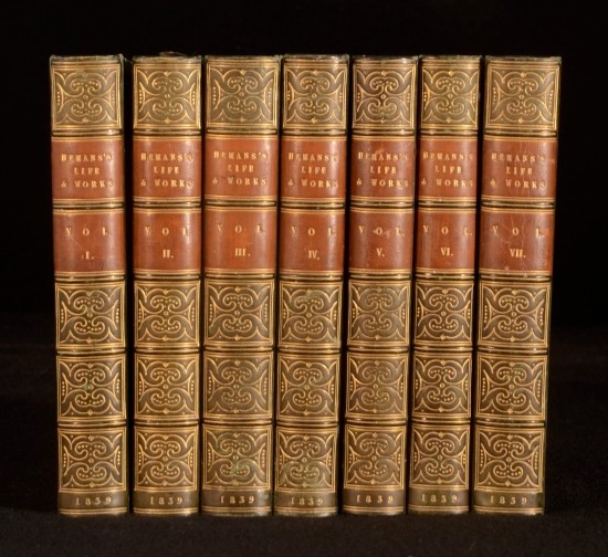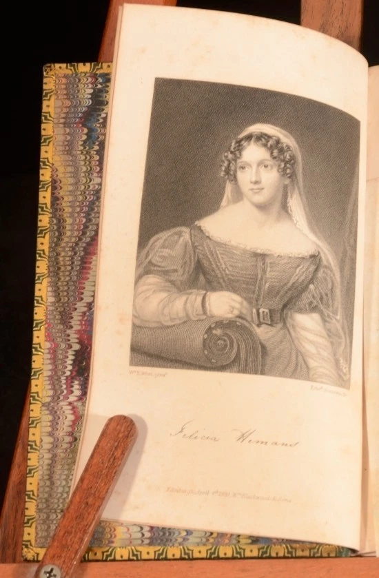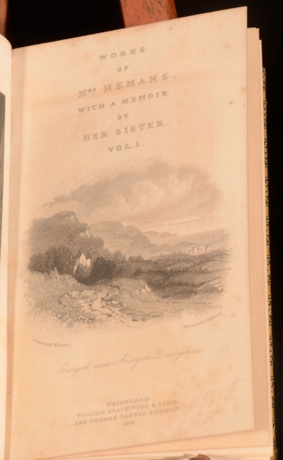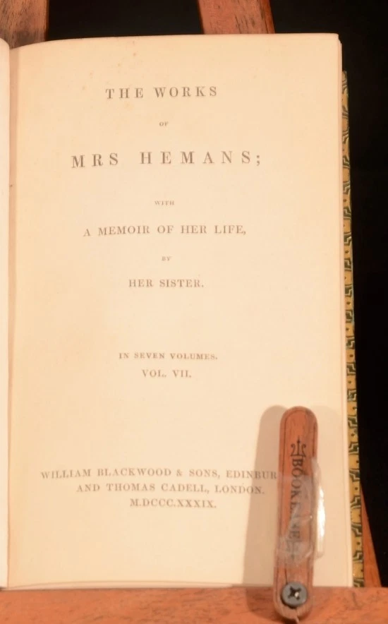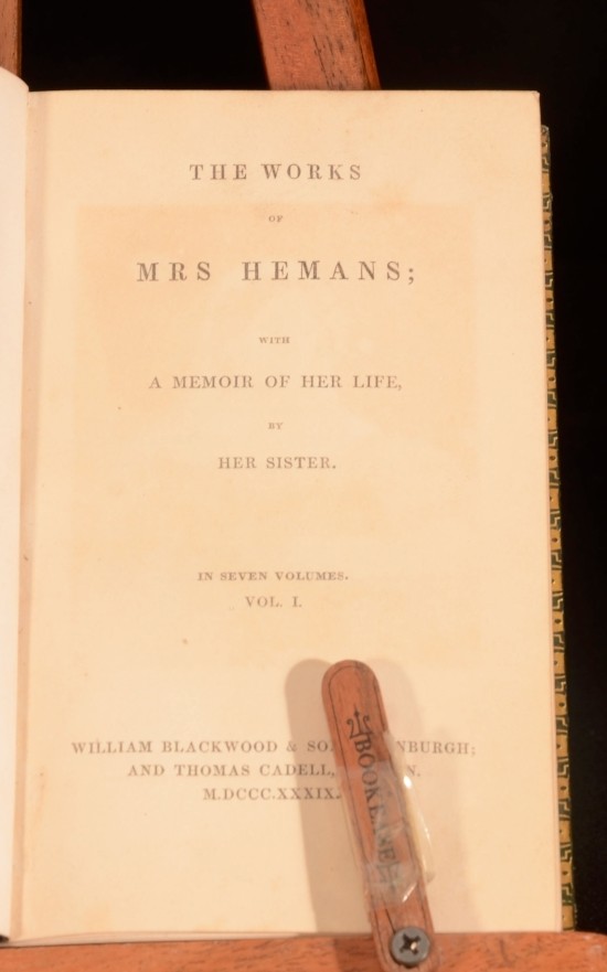 Click here to see our other books! The Works of Mrs Hemans; With a Memoir of Her Life By Her Sister Mrs Felicia Hemans 1839 William Blackwood and Sons and Thomas Cadell : Edinburgh and London 6.5" by 4" 352pp.; 356pp.; (ii) 390pp.; (v) 343pp.; (iii) 326pp.; (vi) 326pp.; (viii) 377pp. SUMMARY A handsomely-bound set of the works of the poet, Felicia Hemans. Fine Binding,Illustrated,Leather Binding Overall Condition: Very Good Indeed This book weighs 3 KG when packed UK Postage: £ 3.99 US Postage: £ 36.99 EU Postage : £ 25.99 European Postage: £ 27.99 Asia Postage: £ 47.99 Worldwide Postage: £ 69.99 DESCRIPTION Felicia Hemans' works appeared in nineteen individual books during her lifetime. After her death in 1835 they were republished widely, usually as collections of individual lyrics and not the longer, annotated works and integrated series that made up her books. For surviving women poets, like Britons Caroline Norton and Letitia Elizabeth Landon, Americans Lydia Sigourney and Frances Harper, the French Amable Tastu and German Annette von Droste-Hülshoff, and others, she was a valued model, or (for Elizabeth Barrett Browning) a troubling predecessor; and for male poets including Tennyson and Longfellow, an influence less acknowledged. Hemans' critical reputation has been re-examined in recent years. Her work has resumed a role in standard anthologies and in classrooms and seminars and literary studies, especially in the U. S. It is likely that further poems will be familiar to new readers, such as "The Image in Lava," "Evening Prayer at a Girls' School," "I Dream of All Things Free," "Night-Blowing Flowers," "Properzia Rossi," "A Spirit's Return," "The Bride of the Greek Isle," "The Wife of Asdrubal," "The Widow of Crescentius," "The Last Song of Sappho," and "Corinne at the Capitol." With engraved frontispiece to the first volumes, and engraved title pages. Complete in seven volumes. CONDITION In green calf bindings with gilt detailing. Externally, smart, with just some slight fading to the spine, and some rubbing. Internally, firmly bound. One hinge is slightly strained. Pages are bright and clean, with just some foxing to the first and last few pages, and some offsetting from the frontispieces. Overall Condition: Very Good Indeed GLOSSARY OF TERMS Overall Condition (Dustwrapper condition rating is shown after that for the book itself, where a dustwrapper is present) Fine - Very well preserved copy showing very little wear Very Good Indeed - Only one or two minor faults, really a very attractive copy Very Good - Quite a wide term meaning no major faults but probably several smaller ones often expected given the age of the book, but still a respectable copy Good - Meaning not very good. Some more serious faults as will be described in the condition report under 'condition' Good Only - Meaning one or more faults that could really do with repair Fair - As with good only above but with other faults leaving a compromised copy even after repair Poor - Really bad and possibly seriously incomplete. We only sell books in this condition where their rarity or value makes them attractive none the less. Major defects will be described. GUARANTEE We offer a full money back guarantee on our descriptions. Please ask for details and conditions. We prefer PAYPAL. If you pay via PAYPAL we will post the item off the same or the next working day with the postage you have selected. Please note we cannot accept USD cheques
