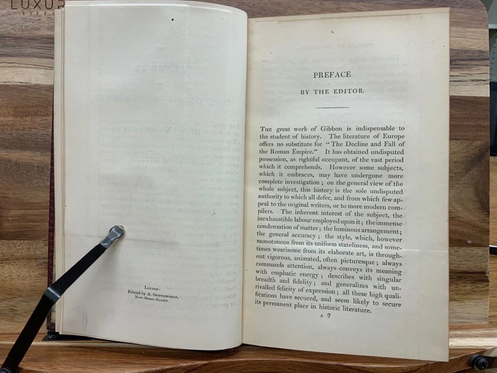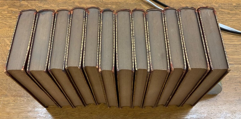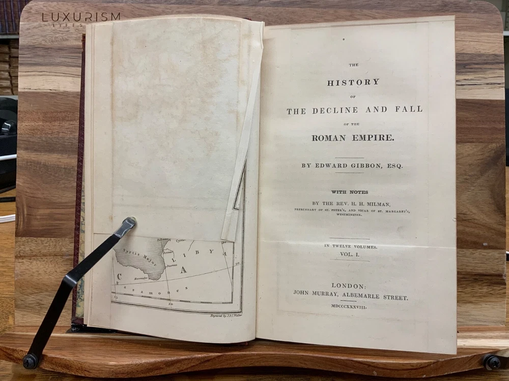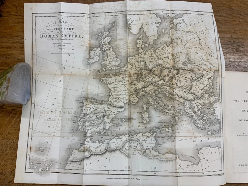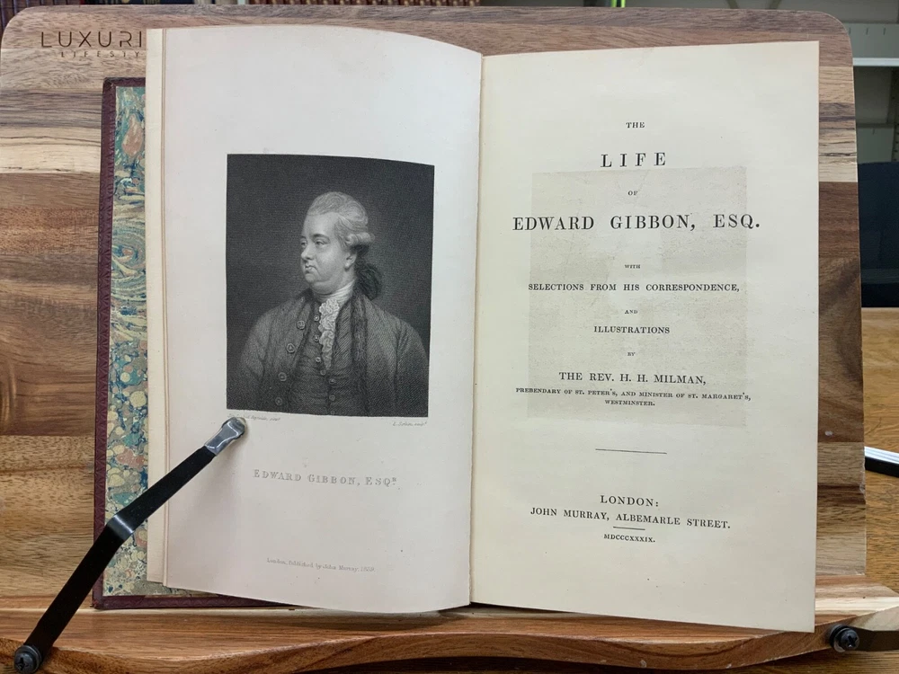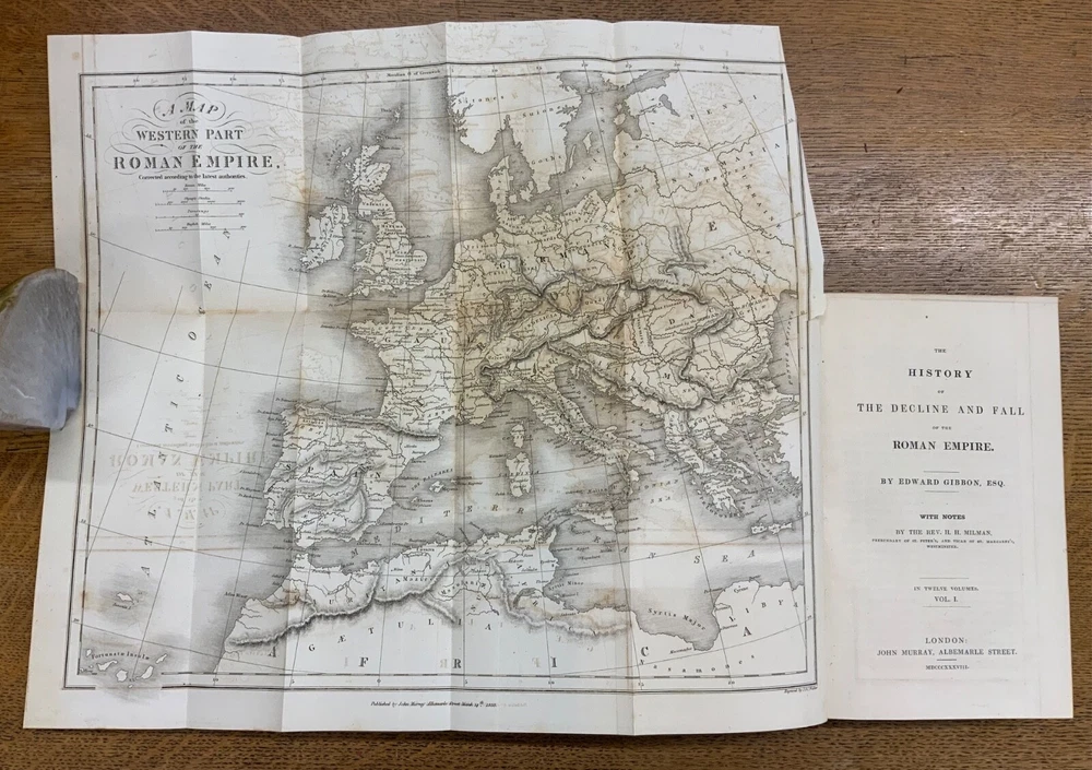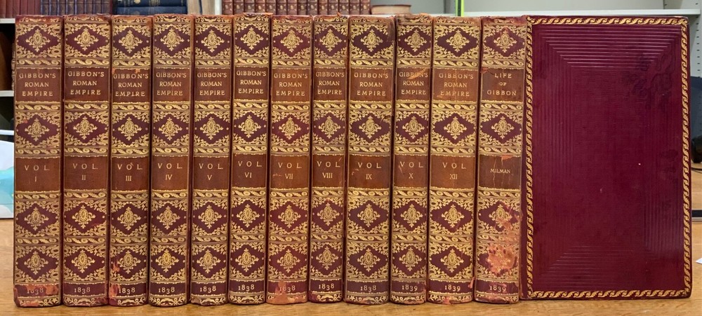 Contemporary full-leather fine bindings measure 8.5 x 5.5”, 8vos. The History of The Decline & Fall of the Roman Empire. By Edward Gibbon, Esq. With Notes by the Rev. H. H. Milman, Prebendary of St. Peter’s, and Vicar of St. Margaret’s, Westminster. In Twelve Volumes. London: John Murray, 1838-1839. First Edition. LACKING VOLUME 11! INCOMPLETE SET! + The Life of Edward Gibbon, Esq. With Selections from his Correspondence, and Illustrations by The Rev. H. H. Milman… London: John Murray, 1839. First Edition. In fair condition. FRONT BOARDS OF VOLUME 1 & LIFE OF GIBBON DETACHED FROM BINDINGS! Boards scuffed at edges and corners. Heads and tails of spines scuffed with some chipping at heads of Vols. VI, VIII, IX, X & XII. Scuffing at tails with loss of gilt lettering or deco on volumes I, III, VII & X. Hinges creased with front hinge cracked at head of Vol. IX’s spine & rear hinge cracked at head of Vol. XII’s spine. Normal toning in margins throughout text-blocks. Fold-out maps in Vol. I normally toned at creases with small tears at some creases. Light off-setting on title page of Life of from frontispiece. Front boards DETACHED Vols. I & Life of. INCOMPLETE SET. Please see photos and ask questions, if any, before purchasing. Henry Hart Milman (1791 – 1868) was an English historian and ecclesiastic. In 1821 Milman was elected professor of poetry at Oxford ; and in 1827 he delivered the Bampton lectures on The character and conduct of the Apostles considered as an evidence of Christianity. In 1835, Sir Robert Peel made him Rector of St Margaret's, Westminster, and Canon of Westminster , and in 1849 he became Dean of St Paul's. He was elected a Foreign Honorary Member of the American Academy of Arts and Sciences in 1864. In 1838 he had edited Edward Gibbon's Decline and Fall of the Roman Empire, and in the following year published his Life of Gibbon. INCOMPLETE SET! LACKING VOLUME 11! RARES1839AKLP 05/25 - HK2488