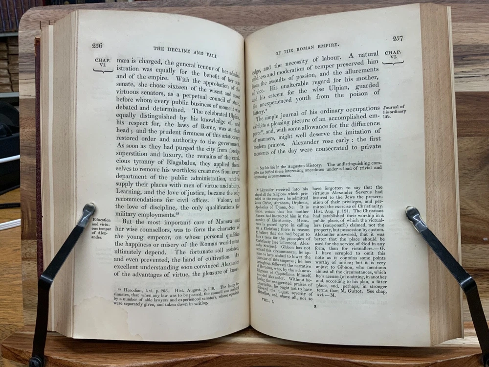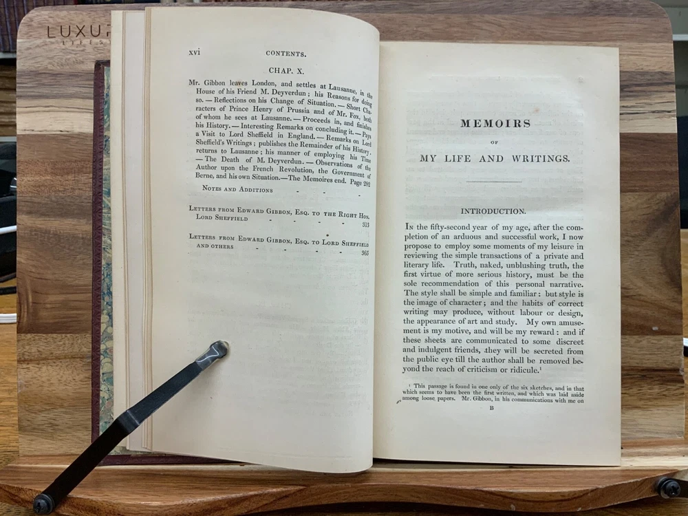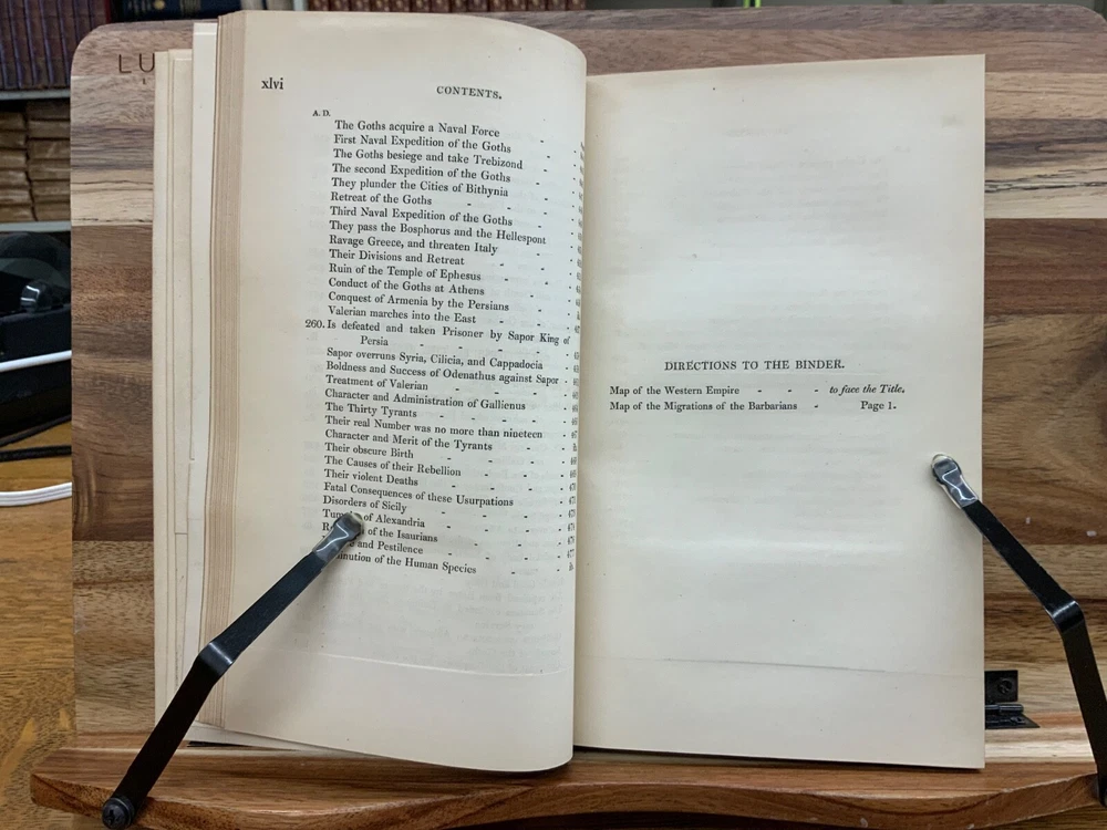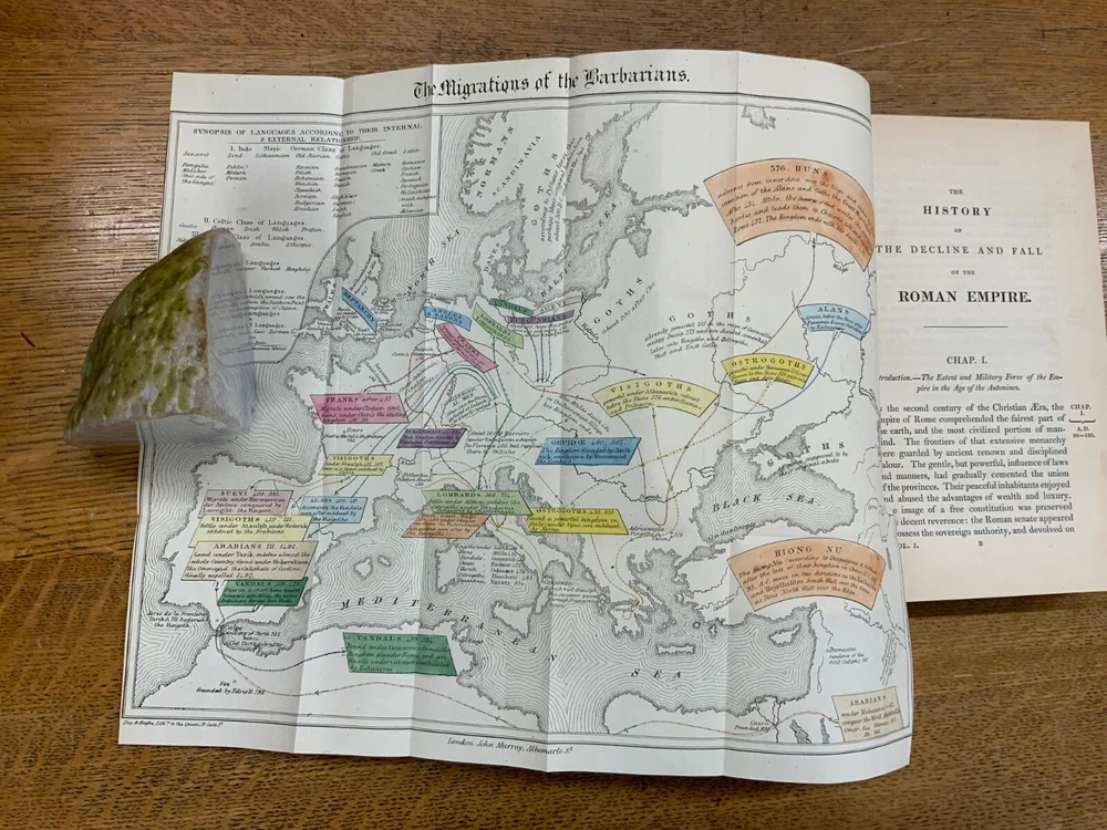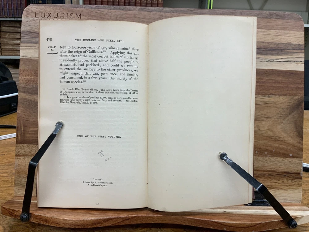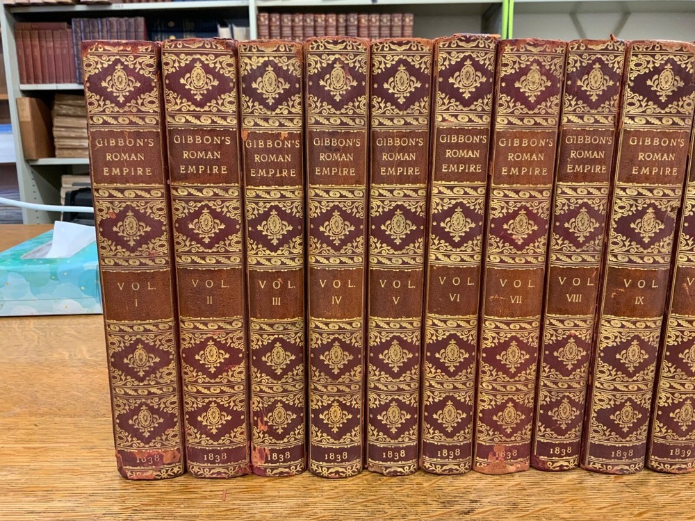 Contemporary full-leather fine bindings measure 8.5 x 5.5”, 8vos. The History of The Decline & Fall of the Roman Empire. By Edward Gibbon, Esq. With Notes by the Rev. H. H. Milman, Prebendary of St. Peter’s, and Vicar of St. Margaret’s, Westminster. In Twelve Volumes. London: John Murray, 1838-1839. First Edition. LACKING VOLUME 11! INCOMPLETE SET! + The Life of Edward Gibbon, Esq. With Selections from his Correspondence, and Illustrations by The Rev. H. H. Milman… London: John Murray, 1839. First Edition. In fair condition. FRONT BOARDS OF VOLUME 1 & LIFE OF GIBBON DETACHED FROM BINDINGS! Boards scuffed at edges and corners. Heads and tails of spines scuffed with some chipping at heads of Vols. VI, VIII, IX, X & XII. Scuffing at tails with loss of gilt lettering or deco on volumes I, III, VII & X. Hinges creased with front hinge cracked at head of Vol. IX’s spine & rear hinge cracked at head of Vol. XII’s spine. Normal toning in margins throughout text-blocks. Fold-out maps in Vol. I normally toned at creases with small tears at some creases. Light off-setting on title page of Life of from frontispiece. Front boards DETACHED Vols. I & Life of. INCOMPLETE SET. Please see photos and ask questions, if any, before purchasing. Henry Hart Milman (1791 – 1868) was an English historian and ecclesiastic. In 1821 Milman was elected professor of poetry at Oxford ; and in 1827 he delivered the Bampton lectures on The character and conduct of the Apostles considered as an evidence of Christianity. In 1835, Sir Robert Peel made him Rector of St Margaret's, Westminster, and Canon of Westminster , and in 1849 he became Dean of St Paul's. He was elected a Foreign Honorary Member of the American Academy of Arts and Sciences in 1864. In 1838 he had edited Edward Gibbon's Decline and Fall of the Roman Empire, and in the following year published his Life of Gibbon. INCOMPLETE SET! LACKING VOLUME 11! RARES1839AKLP 05/25 - HK2488