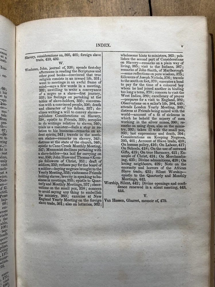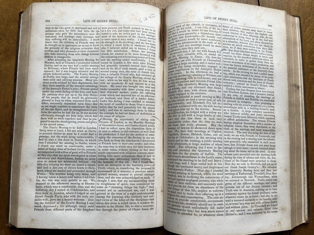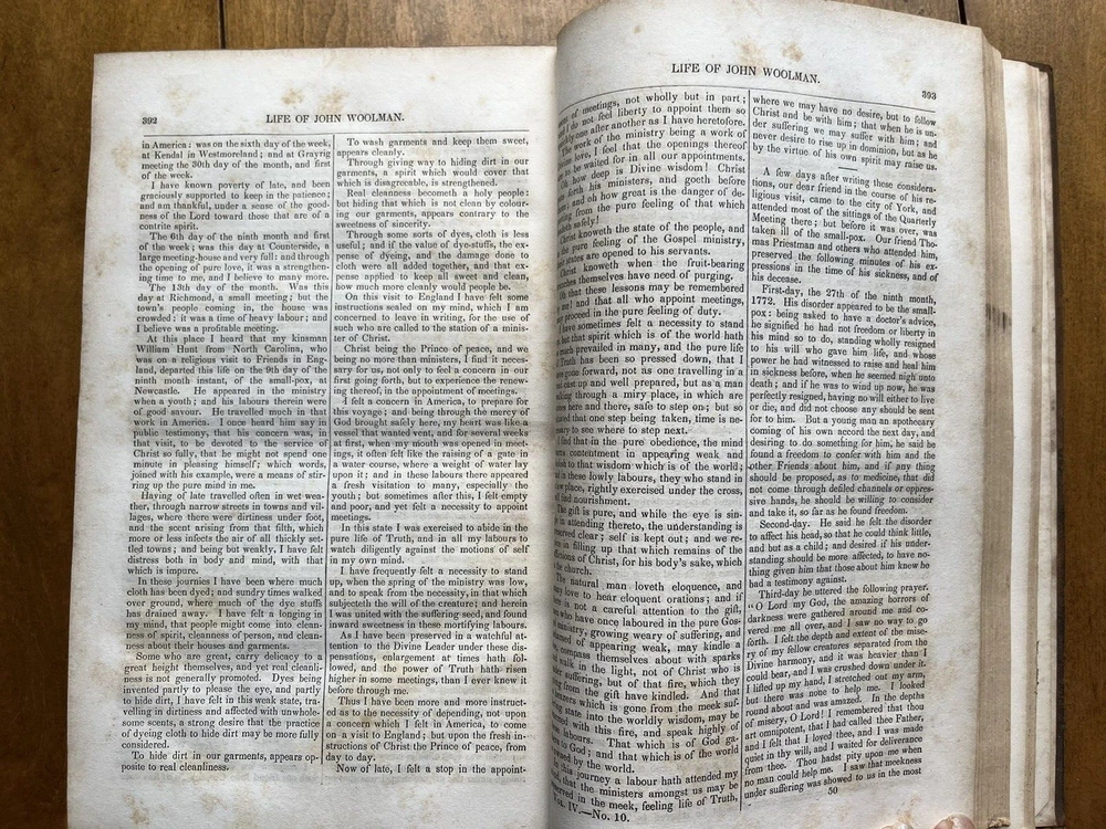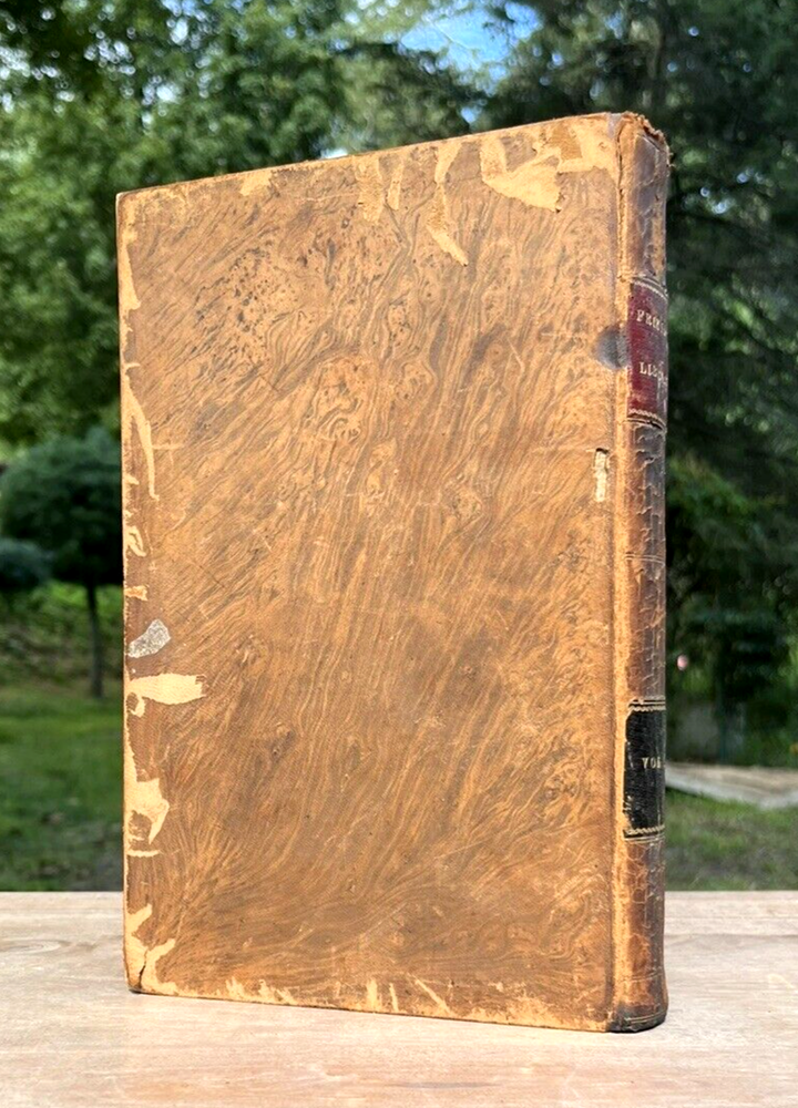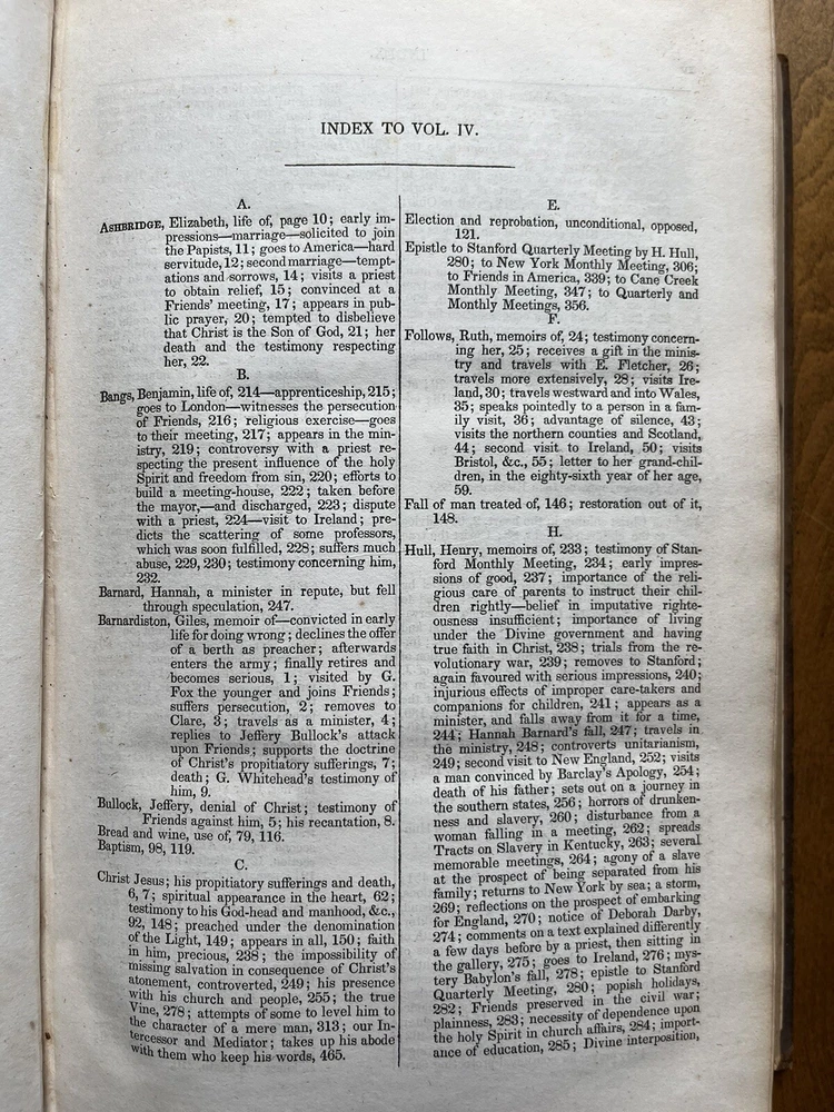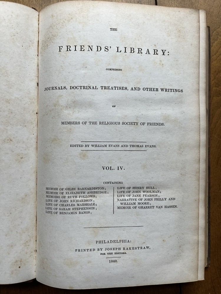 The Friend's Library: Comprising Journals, Doctrinal Treatises, and Other Writings of Members of the Religious Society of Friends. Edited by William Evans and Thomas Evans. Volume IV. 1st Edition published in 1840 in Philadelphia by Joseph Rakestraw. Condition: Sound binding. Full leather with heavy rubbing and wear as pictured above. Board tips rubbed through. Leather on spine looks as though it was scorched by fire at some point. Dig in back board. Inscription on front free endpaper and another former owner's stamp on front flyleaf. Light to moderate foxing throughout. Pages 284 and 285 have a few purple pencil markings as pictured above. Pages are whole and tight. 6 1/2" x 10 1/4" with 480 pages.