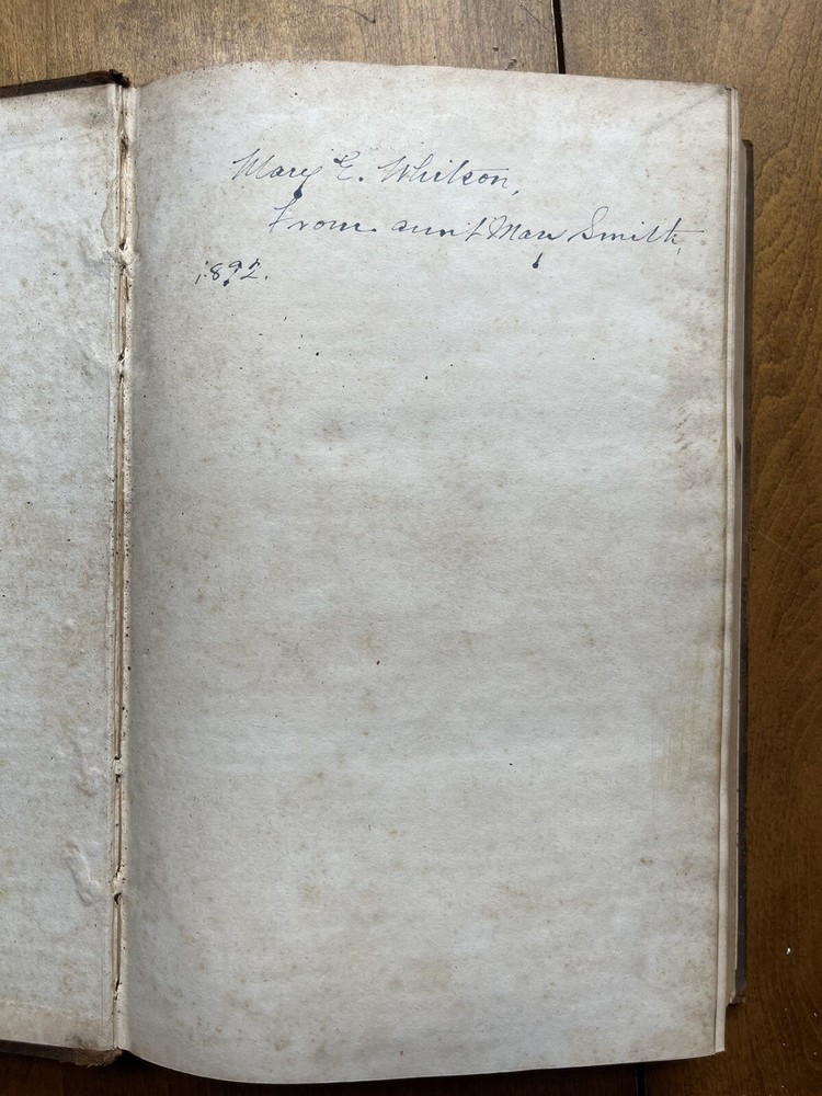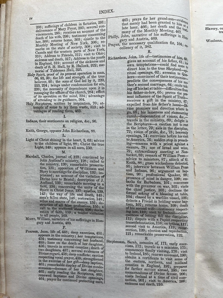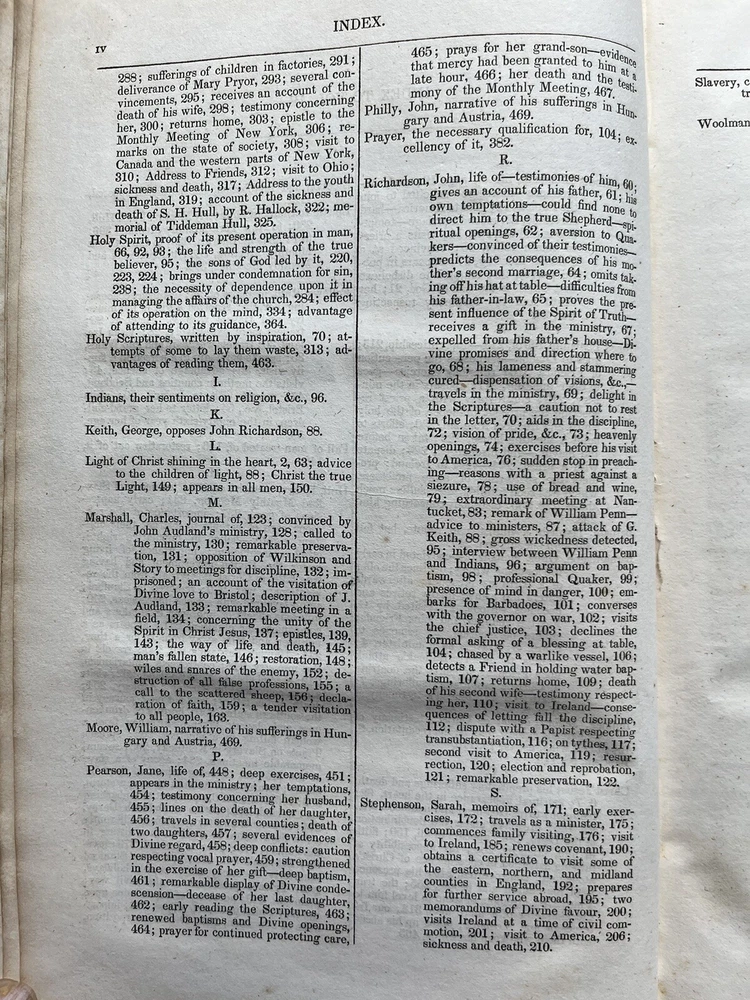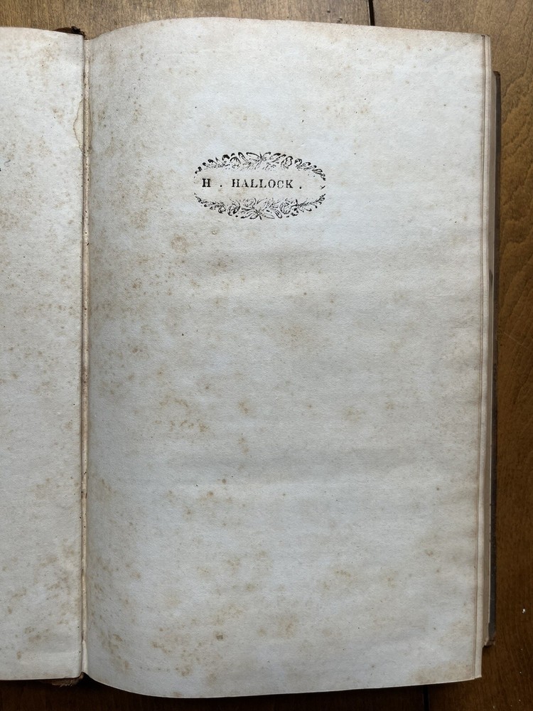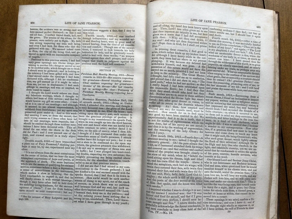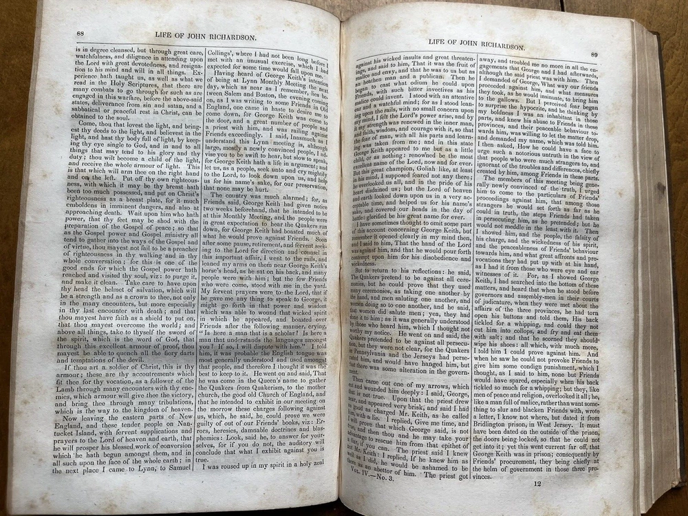 The Friend's Library: Comprising Journals, Doctrinal Treatises, and Other Writings of Members of the Religious Society of Friends. Edited by William Evans and Thomas Evans. Volume IV. 1st Edition published in 1840 in Philadelphia by Joseph Rakestraw. Condition: Sound binding. Full leather with heavy rubbing and wear as pictured above. Board tips rubbed through. Leather on spine looks as though it was scorched by fire at some point. Dig in back board. Inscription on front free endpaper and another former owner's stamp on front flyleaf. Light to moderate foxing throughout. Pages 284 and 285 have a few purple pencil markings as pictured above. Pages are whole and tight. 6 1/2" x 10 1/4" with 480 pages.