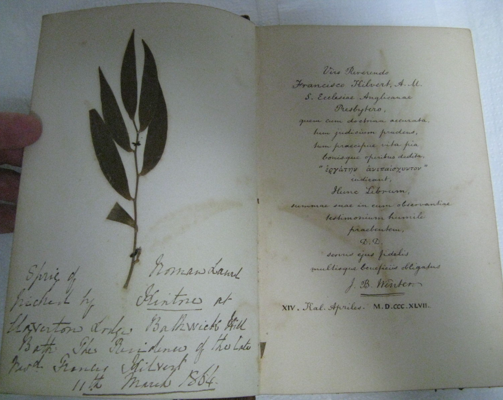 Historical book. This was presented to the reverend Francis Kilvert by J. B. Winter in the year 1847. A sprig from his residence has been inserted and anchored to the inside front page one year after Rev. Kilvert died, in 1864 and is inscribed. Francis Kilvert (1793–1863) was an English cleric, schoolmaster, antiquary, and literary editor. His nephew was the famous diarist, Francis Kilvert (1840-). Born at Westgate Street, Bath, Somerset on Good Friday 1793, he was the eldest son of Francis Kilvert, coachmaker, and Anna his wife; his uncle was Richard Kilvert, domestic chaplain to Bishop Richard Hurd and rector of Hartlebury. Orphaned while still young, and the eldest of seven sons, he became guardian to his brothers. For a time he was educated under Dr. Michael Rowlandson at Hungerford. He then went to the Bath grammar school, where Nathaniel Morgan had him as an assistant. He matriculated at Worcester College, Oxford, on 6 November 1811, and graduated B.A. in 1819 and M.A. in 1824. Kilvert was ordained deacon by Richard Beadon, bishop of Bath and Wells, in 1816, and priest in 1817; his first curacy was at Claverton, near Bath. He declined the post of principal of Queen's College, Birmingham, stayed in Bath, and took on minor posts, including minister of St. Mary Magdalen's Chapel, chaplain of the General Hospital, and evening lecturer at St. Mary's, Bathwick. His main income came from keeping pupils. In 1837 Kilvert bought Claverton Lodge, on the southern slope of Bathwick Hill, where he took scholars for the rest of his life. Kilvert was one of the earliest members of the Bath Literary Club. He died at Claverton Lodge on 16 September 1863, and was buried in Old Widcombe churchyard, near the grave of his father and two of his brothers. A brass tablet to his memory was placed on the walls of St. Mary, Bathwick. Works Kilvert wrote: Sermons at Christ Church, Bath, before the National Schools, 1827. Sermons at St. Mary's Church, Bathwick, 1837. Sermon preached at Wrington, 1840. Selections from unpublished Papers of Bishop Warburton, 1841; also issued in same year as vol. xiv. (supplemental), of William Warburton's Works. Pinacothecæ Historicæ specimen. Auctore F.K., A.M., 1848; pt. ii., with name in full, 1850. A series of Latin inscriptions on illustrious men. Ralph Allen and Prior Park, 1857. Richard Graves of Claverton, 1858. Memoirs of Life and Writings of Bishop Hurd, 1860. After his death there was published in 1866 a volume of his Remains in Verse and Prose, with a brief Memoir, edited by William Luke Nichols, with William Long. It included the paper on Alexander Pope's connection with the West of England, and particularly with Bath; but omitted papers read to the Bath Literary Society, such as those on Philip Thicknesse and the Batheaston vase, were omitted. His last communication to the Bath Theological Book Society, lines on Over the Water to Warleigh, was printed by H. D. Skrine at Bath in October 1863. He was a frequent contributor to [[Notes and Queries]], and he wrote in the Bath Chronicle. Kilvert married at the close of 1822 Adelaide Sophia de Chièvre. Smart-phone users, click top right menu of phone, select 'request desktop site'. After the item reloads in desktop view, tap on main picture, it will open in spectacular viewing quality with zoom, enabling you to actually read the words on the pages and see tiny details. Tap side arrows to see next picture. We accept all payment methods which are shown on this site as capable of accepting, including Paypal, payments via personal check or MO can be arranged via messaging me, website permitting. This listing has pictures of the actual book or books being sold, no stock-photos or photos of similar items, I took a complete set of new pictures especially for this listing and I have carefully described the condition of this specific item that you are looking at. Thank You.