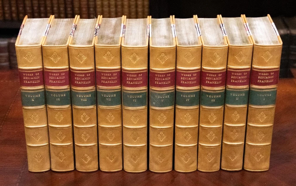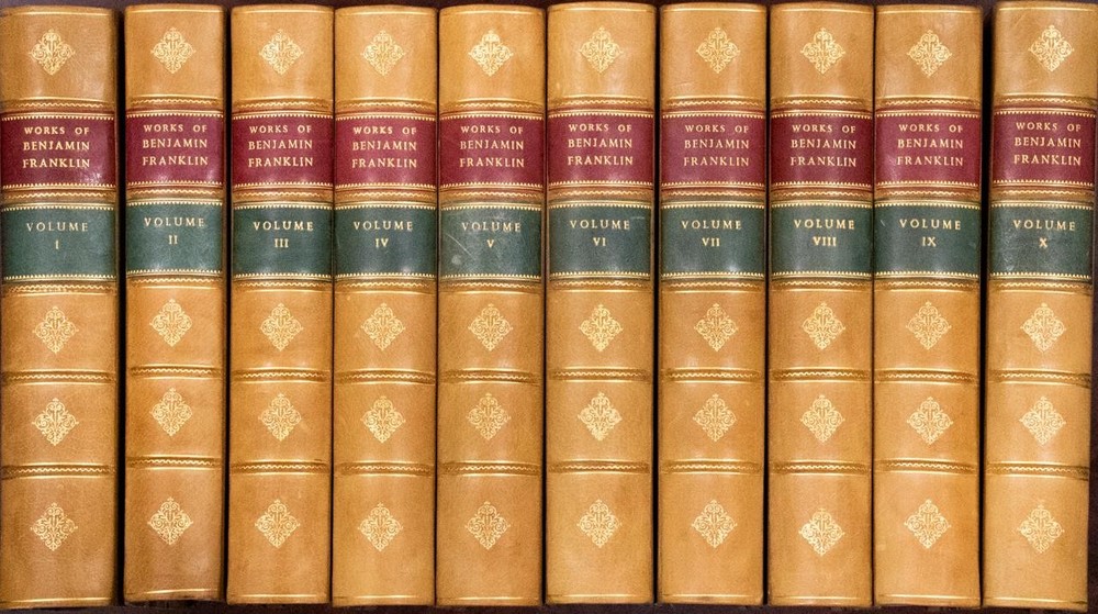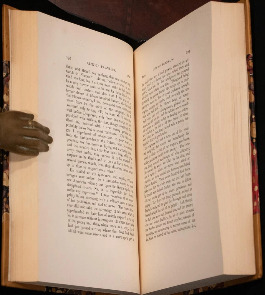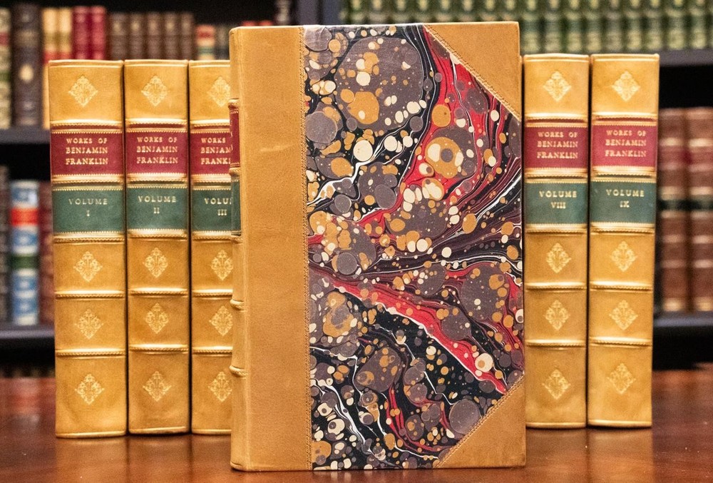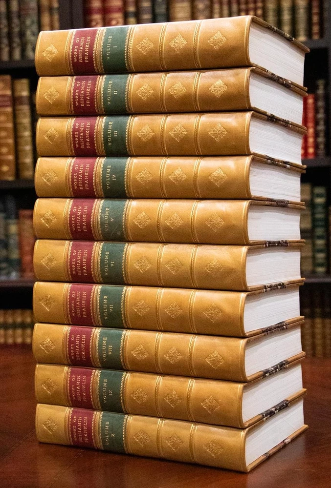 THIS COMPLETE TEN VOLUME SET IS IN NEAR FINE CONDITION BEAUTIFULLY REBOUND IN 3/4 LEATHER WITH MARBLED BOARDS, SIX COMPARTMENTS AND FIVE RAISED BANDS TO SPINE WITH BRIGHT GILT DETAILS AND TITLE. BINDING AND HINGES ARE EXCELLENT, NEW END PAPERS AND PASTE DOWNS, NO LOOSE OR MISSING PAGES, PAGES ARE REMARKABLY BRIGHT AND CLEAN, WITHOUT MARKS, SOME LIGHT SPORADIC FOXING, SOME FRONTISEPIECES WITH TANNING. ILLUSTRATED WITH STEEL ENGRAVINGS AND FOLD OUT PLATES, BOOKS MEASURE 10.25"x7". FIRST EDITION PUBLISHED 1836-1840, 185 YEARS OLD. A SCARCE TITLE IN FINE LEATHER, YOU WILL LOVE THIS SET! 1840 Works of Benjamin Franklin First Edition Illustrated Fine Leather 10" Tall 1840 Works of Benjamin Franklin First Edition Illustrated Fine Leather 10" Tall Description THIS COMPLETE TEN VOLUME SET IS IN NEAR FINE CONDITION BEAUTIFULLY REBOUND IN 3/4 LEATHER WITH MARBLED BOARDS, SIX COMPARTMENTS AND FIVE RAISED BANDS TO SPINE WITH BRIGHT GILT DETAILS AND TITLE. BINDING AND HINGES ARE EXCELLENT, NEW END PAPERS AND PASTE DOWNS, NO LOOSE OR MISSING PAGES, PAGES ARE REMARKABLY BRIGHT AND CLEAN, WITHOUT MARKS, SOME LIGHT SPORADIC FOXING, SOME FRONTISEPIECES WITH TANNING. ILLUSTRATED WITH STEEL ENGRAVINGS AND FOLD OUT PLATES, BOOKS MEASURE 10.25"x7". FIRST EDITION PUBLISHED 1836-1840, 185 YEARS OLD. A SCARCE TITLE IN FINE LEATHER, YOU WILL LOVE THIS SET! !!!CLICK HERE!!! Visit My eBay Store TO SEE ALL THE BOOKS WE HAVE FOR SALE!!! IF YOU LIKE WHAT YOU SEE THAN SAVE US TO YOUR FAVORITES BY CLICKING HERE. Add me to your Favorite Sellers RARE ANTIQUARIAN BOOKS CAN BE FRAGILE AND NEED TO BE HANDLED WITH CARE. About us: Reagan's Rare Books is a purveyor of Antiquarian books primarily from the 18th and 19th centuries. We love antique books! We search all over the country for the finest rare books, looking for those with beautiful bindings and in great condition so that we can offer you, the customer, a truly rare one of a kind collectible. Paypal Preferred. Please make payment arrangements within 48 hours of winning your auction. We reserve the right to re-list items not paid within 5 days. Shipping *To Insure That Your Package arrives without any Problems , Please Double Check to Make Sure That The Address You Have Selected in eBay Is Correct. All books are carefully bubble wrapped and packed in a box with adequate packing peanuts to prevent any damage during shipment. All books are shipped with delivery confirmation and tracking. Books over $75.00 are automatically insured. RETURNS 100% Satisfaction Guaranteed. Returns accepted for any reason within 30 days of receipt. PLEASE CHECK MY OTHER LISTINGS. POSTING NEW RARE BOOKS DAILY/WEEKLY. Get images that make Supersized seem small. Showcase your items with Auctiva's Listing Templates! THE simple solution for eBay sellers. Track Page Views With Auctiva's Counter