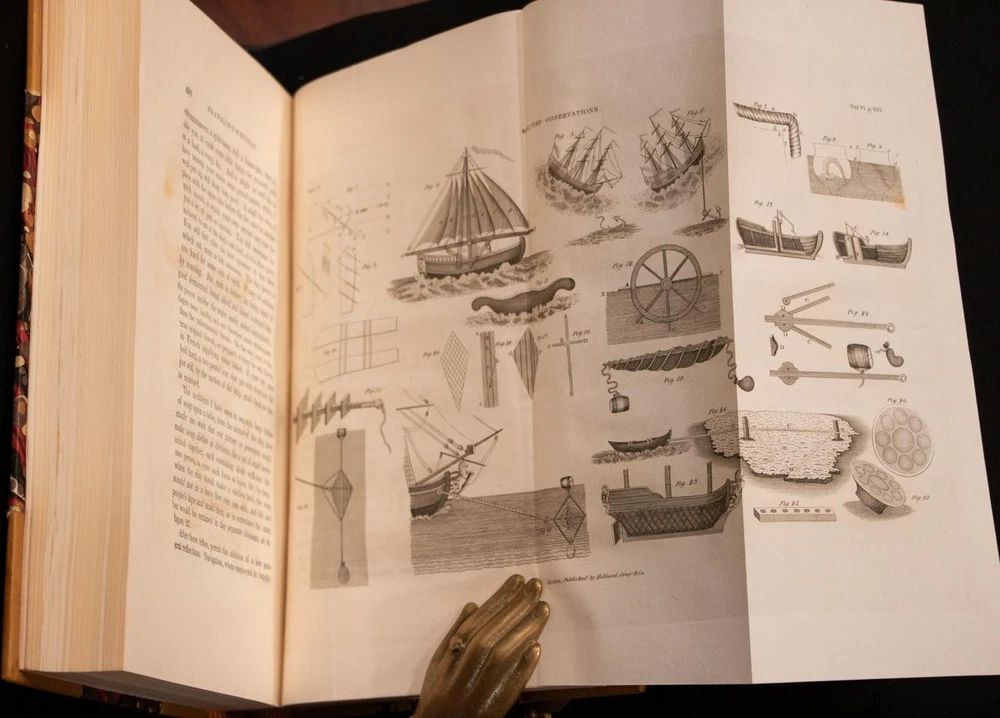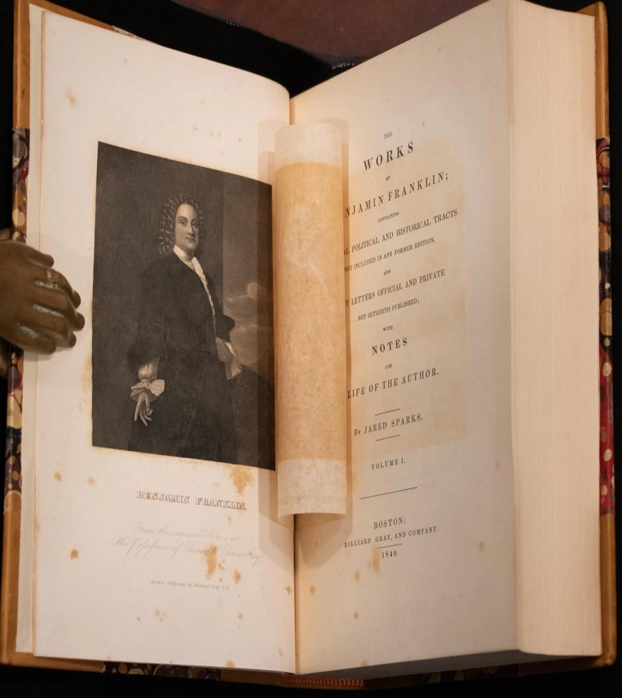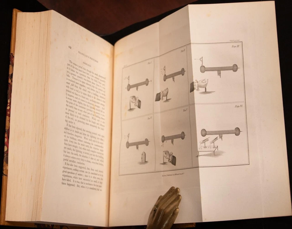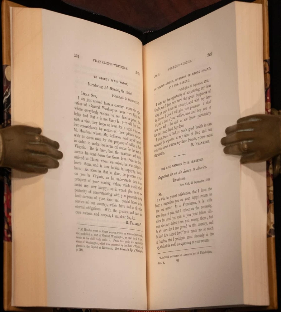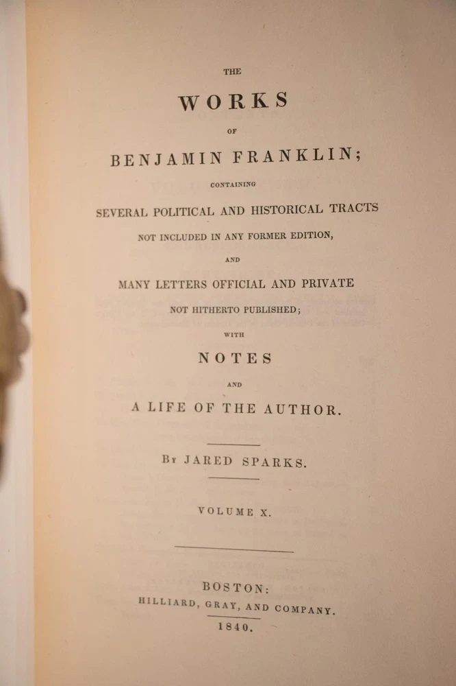 THIS COMPLETE TEN VOLUME SET IS IN NEAR FINE CONDITION BEAUTIFULLY REBOUND IN 3/4 LEATHER WITH MARBLED BOARDS, SIX COMPARTMENTS AND FIVE RAISED BANDS TO SPINE WITH BRIGHT GILT DETAILS AND TITLE. BINDING AND HINGES ARE EXCELLENT, NEW END PAPERS AND PASTE DOWNS, NO LOOSE OR MISSING PAGES, PAGES ARE REMARKABLY BRIGHT AND CLEAN, WITHOUT MARKS, SOME LIGHT SPORADIC FOXING, SOME FRONTISEPIECES WITH TANNING. ILLUSTRATED WITH STEEL ENGRAVINGS AND FOLD OUT PLATES, BOOKS MEASURE 10.25"x7". FIRST EDITION PUBLISHED 1836-1840, 185 YEARS OLD. A SCARCE TITLE IN FINE LEATHER, YOU WILL LOVE THIS SET! 1840 Works of Benjamin Franklin First Edition Illustrated Fine Leather 10" Tall 1840 Works of Benjamin Franklin First Edition Illustrated Fine Leather 10" Tall Description THIS COMPLETE TEN VOLUME SET IS IN NEAR FINE CONDITION BEAUTIFULLY REBOUND IN 3/4 LEATHER WITH MARBLED BOARDS, SIX COMPARTMENTS AND FIVE RAISED BANDS TO SPINE WITH BRIGHT GILT DETAILS AND TITLE. BINDING AND HINGES ARE EXCELLENT, NEW END PAPERS AND PASTE DOWNS, NO LOOSE OR MISSING PAGES, PAGES ARE REMARKABLY BRIGHT AND CLEAN, WITHOUT MARKS, SOME LIGHT SPORADIC FOXING, SOME FRONTISEPIECES WITH TANNING. ILLUSTRATED WITH STEEL ENGRAVINGS AND FOLD OUT PLATES, BOOKS MEASURE 10.25"x7". FIRST EDITION PUBLISHED 1836-1840, 185 YEARS OLD. A SCARCE TITLE IN FINE LEATHER, YOU WILL LOVE THIS SET! !!!CLICK HERE!!! Visit My eBay Store TO SEE ALL THE BOOKS WE HAVE FOR SALE!!! IF YOU LIKE WHAT YOU SEE THAN SAVE US TO YOUR FAVORITES BY CLICKING HERE. Add me to your Favorite Sellers RARE ANTIQUARIAN BOOKS CAN BE FRAGILE AND NEED TO BE HANDLED WITH CARE. About us: Reagan's Rare Books is a purveyor of Antiquarian books primarily from the 18th and 19th centuries. We love antique books! We search all over the country for the finest rare books, looking for those with beautiful bindings and in great condition so that we can offer you, the customer, a truly rare one of a kind collectible. Paypal Preferred. Please make payment arrangements within 48 hours of winning your auction. We reserve the right to re-list items not paid within 5 days. Shipping *To Insure That Your Package arrives without any Problems , Please Double Check to Make Sure That The Address You Have Selected in eBay Is Correct. All books are carefully bubble wrapped and packed in a box with adequate packing peanuts to prevent any damage during shipment. All books are shipped with delivery confirmation and tracking. Books over $75.00 are automatically insured. RETURNS 100% Satisfaction Guaranteed. Returns accepted for any reason within 30 days of receipt. PLEASE CHECK MY OTHER LISTINGS. POSTING NEW RARE BOOKS DAILY/WEEKLY. Get images that make Supersized seem small. Showcase your items with Auctiva's Listing Templates! THE simple solution for eBay sellers. Track Page Views With Auctiva's Counter