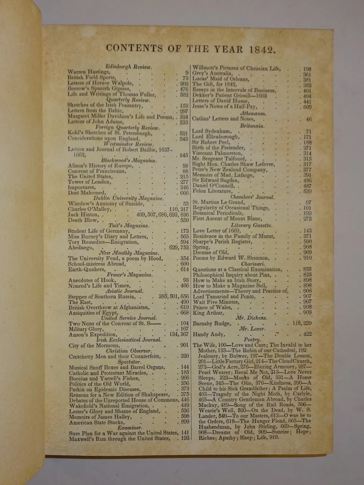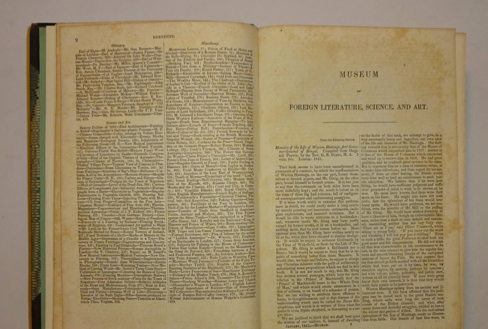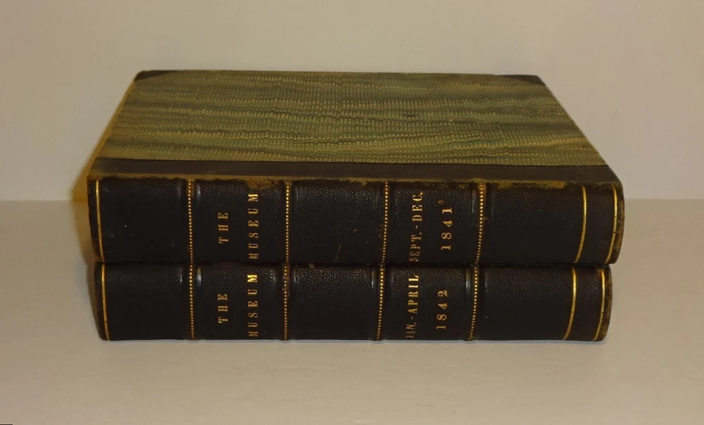 This is a collection of two volumes of the publication "The Museum of Foreign Literature, Science, and Art" from 1841 and 1842. Each volume contains four issues, as follows: 1841 - September to December; 1842 - January to April. The highlights of these volumes are reviews of the publication of the letters of JOHN and ABIGAIL ADAMS. The 1841 volume contains an 11 page review of the book "Letters of Mrs. Adams, the Wife of John Adams; with an Introductory Memoir by her Grandson, Charles Francis Adams." The 1842 volume contains a 14 page review of the book "Letters of John Adams, addressed to his Wife. Edited by his Grandson, Charles Francis Adams." The reviews contains excerpts of letters from each book. The volumes are bound in three-quarter leather with marbled covers and four raised bands on the spines. Other interesting content includes Barnaby Rudge and Master Humphrey's Clock (both incomplete) by Charles Dickens; Foster's Notes on the United States; The Spanish Gypsies; Anatomy of Suicide; King Arthur; Journal of an Autumn in the Country; Anecdotes of Actors; Pierce's History of Harvard University; Malaria; Geological Phenomena of the Falls of Niagara; Robinson and Smith's Travels in Palestine; Emerson's Essays; Sturmer, a Tale of Mesmerism; Mrs. Noble's Narrative of Captivity in China; Haughton's Sex in the World to Come; Catlin's Letters and Notes on the North American Indians; George Cruikshank's Omnibus; British Field Sports; Tower of London; Antiquities of Egypt; City of the Mormons; Letters of David Hume...and much more. Please see the photos for the complete list of contents.