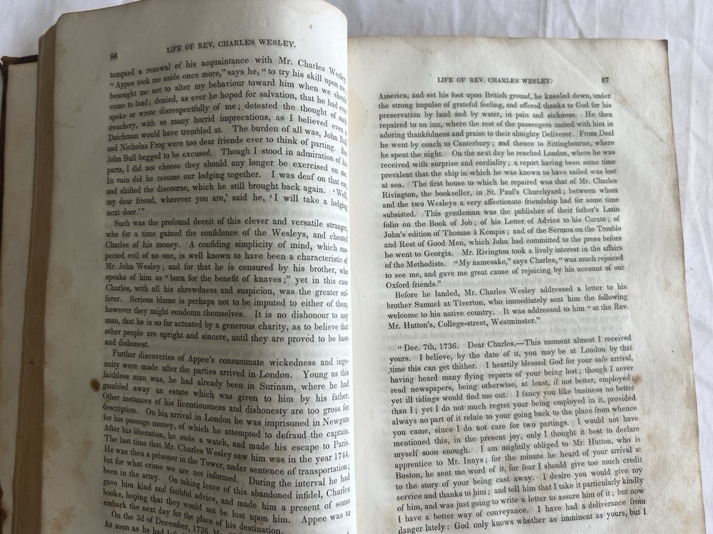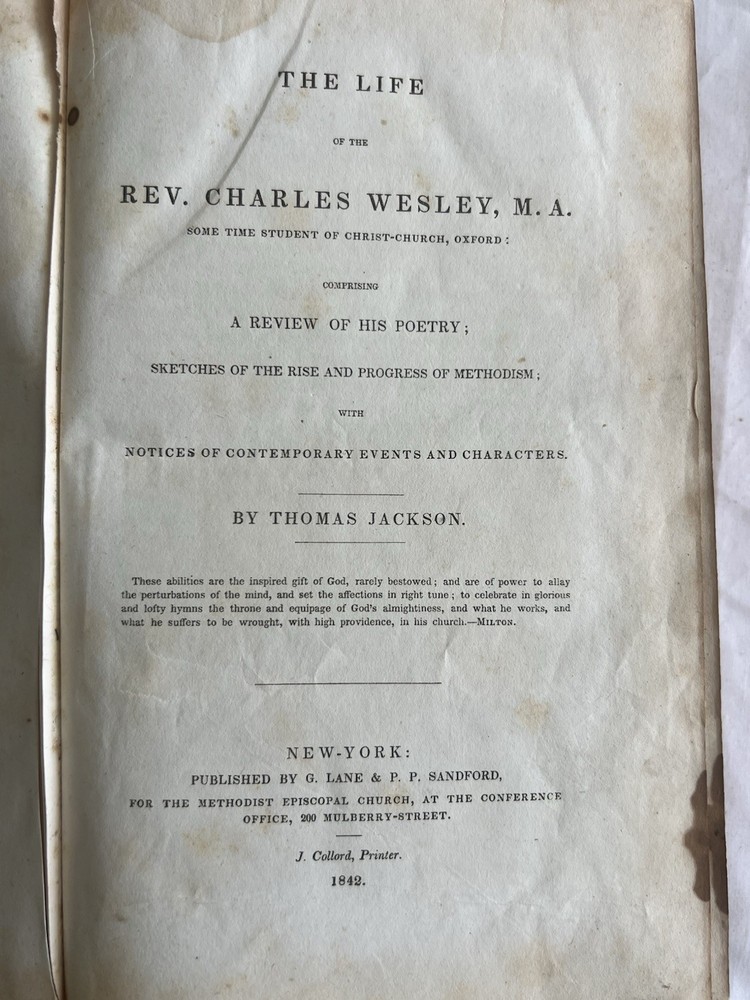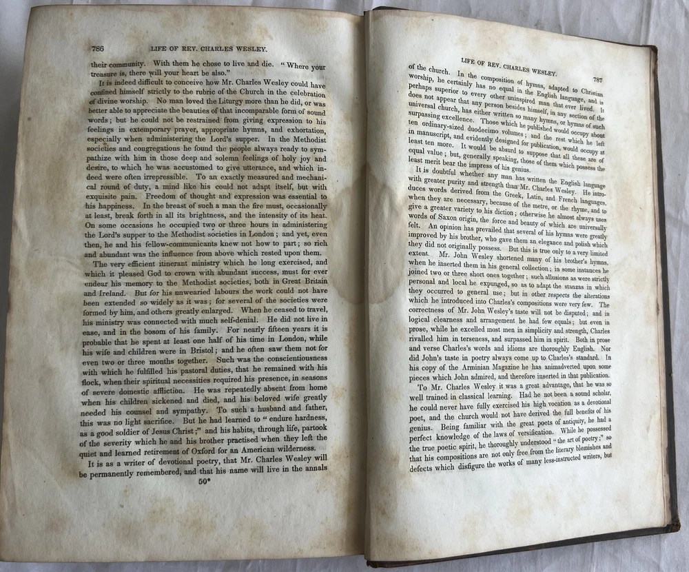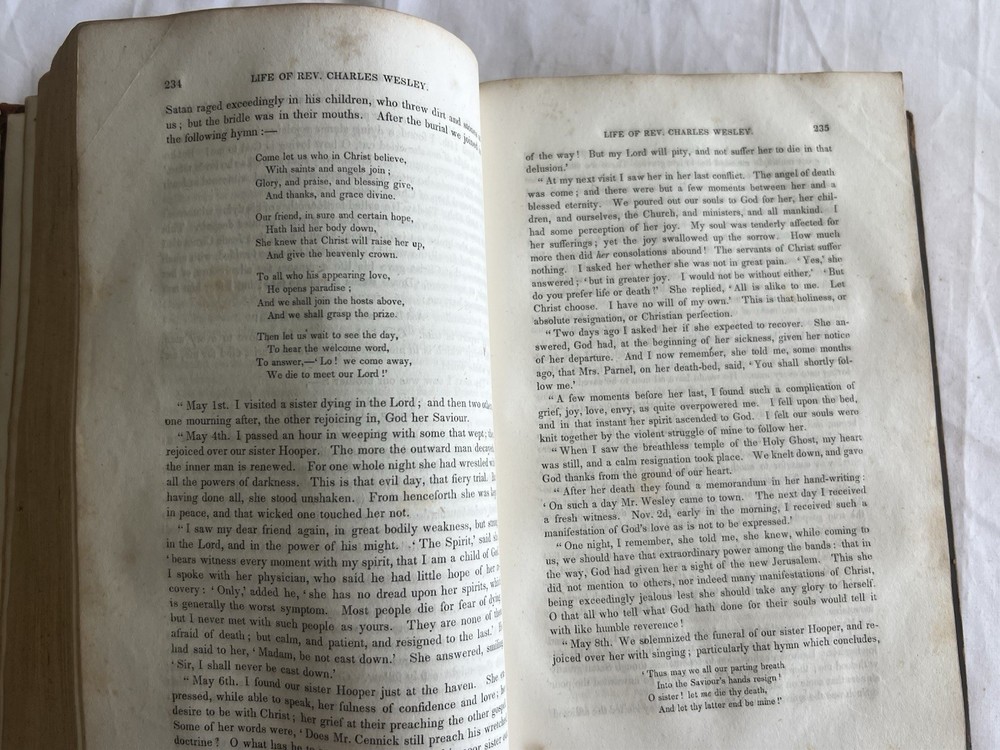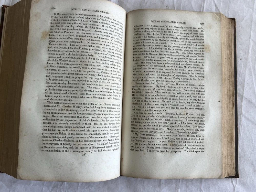 Title: 1842 Life of Rev Charles Wesley Methodism History Poetry Biography by Thomas Jackson Description: Published in 1842, The Life of the Rev. Charles Wesley, M.A. by Thomas Jackson offers an in-depth biography of the renowned Methodist leader and hymn writer. A student of Christ Church, Oxford, Charles Wesley played a central role in the rise of Methodism alongside his brother John Wesley. This extensive volume includes a review of Wesley’s poetry, historical sketches of Methodism’s development, and notes on contemporary figures and events. Issued by the Methodist Episcopal Church, this edition reflects both the religious fervor and literary appreciation of the time. A significant resource for those interested in Christian history, hymnology, or early Methodist literature. Condition: This 183-year-old book measures 9 x 6 inches and spans 797 pages. Bound in full calf leather, the covers are in good condition with only minor scuffing. The binding remains fairly tight, and all pages are present and securely bound. The spine covering is intact and retains the original red leather title label. The interior is clean, with no markings or writing.