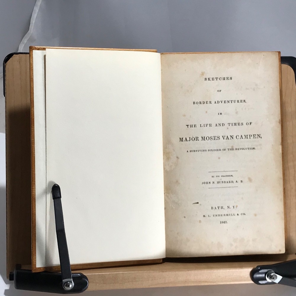 Sketches of Border Adventures, in the Life and Times of Major Moses Van Campen, A surviving Soldier of the Revolution, by his Grandson John N. Hubbard, R.L. Underhill & Co., Bath, New York, 1842, 310 pages, leather, 8vo. In good condition. Beautifully bound in modern leather. Very well done and attractive binding. Text block is toned with foxing throughout. Some more moderate staining throughout, but does not affect text. Binding tight and intact. Unmarked. Please see photos. This is the first issue of the third of three editions of this work. Van Campen was a militia officer from Northumberland County, Pennsylvania. In 1775, during a dispute between Connecticut and Wyoming, he took part in Plunket’s expedition into the Wyoming Valley. In 1777 he joined the revolutionary forces, and in 1780 the fort he built at Fishing Creek was attacked, but the settlers in the area were to retreat safely to the fort. However, the Van Campen family lost their home, and they they tried to return to their home site, they were attacked again, and his father and brother were killed and he and four others were captured. They escaped by killing nine of ten Indian guards, and mad their way home. RAREA1842BHKA