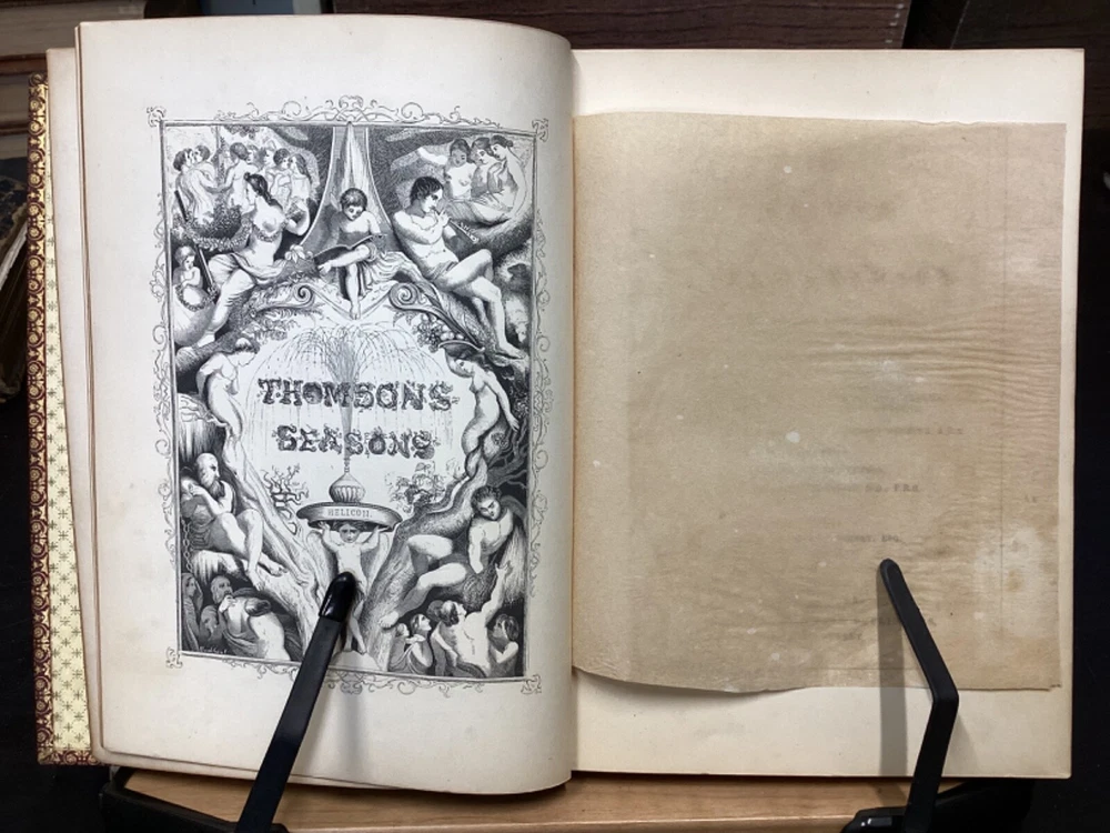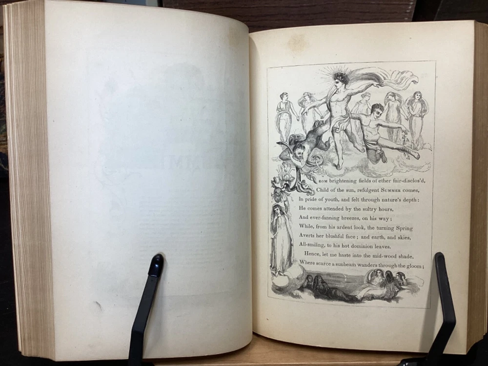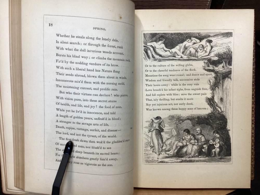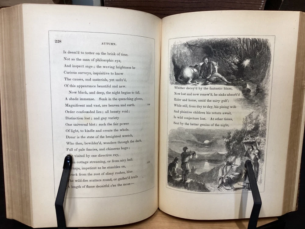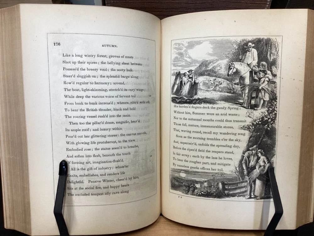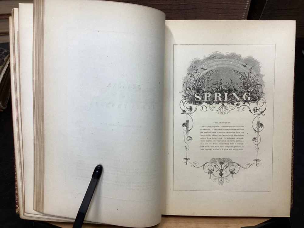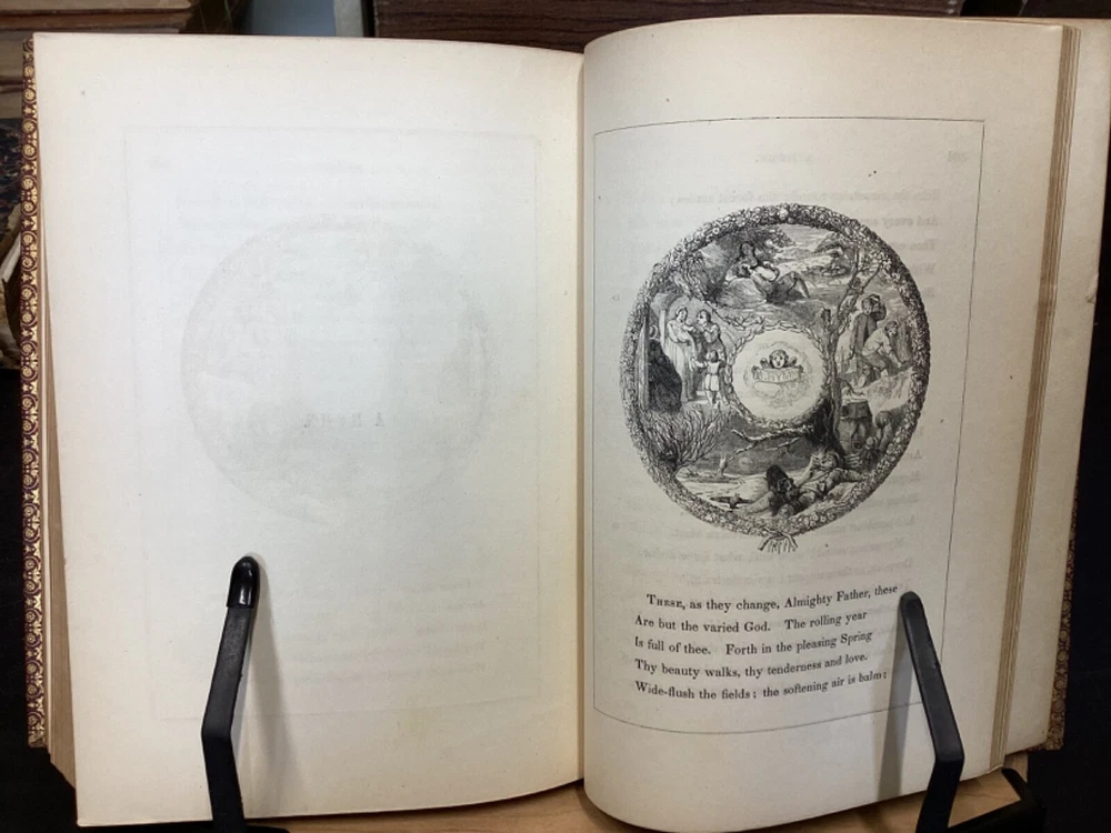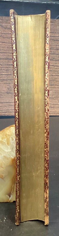 The Seasons by James Thomson, Harper & Brothers, New York, 1842, 320pp, leather, 6 x 8.5", 8vo Poor condition/as is. Front board is completely detached from binding. Wear and staining to front and rear boards. Moroccan red leather with gilt designs on front and rear boards. Tips are bumped. Chipping and cracking to spine, but still legible. Headcap is lacking with exposed binding. Fore edges in gilt. Patterned endpapers. Gift inscription in ink on front endpaper. Frontispiece opposite title page. Toning, age-staining, and finger-staining throughout textblock. Illustrated. Please see photos and ask any questions prior to purchase. The Seasons is a series of four poems written by the Scottish author James Thomson. The first part, Winter, was published in 1726, and the completed poem cycle appeared in 1730. The poem was extremely influential, and stimulated works by Joshua Reynolds, John Christopher Smith, Joseph Haydn, Thomas Gainsborough, and J.M.W. Turner. The edition in this listing also includes engraved illustrations and a biography of the author by Patrick Murdoch. FORN-TUB-0031-BB-0424-JC593
