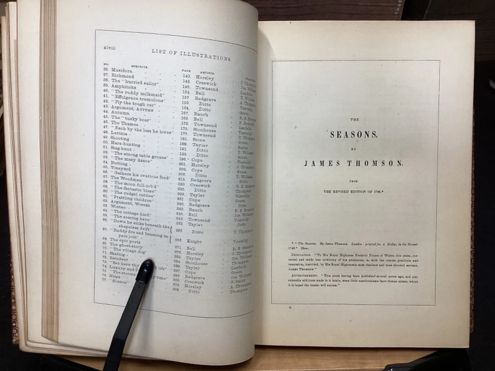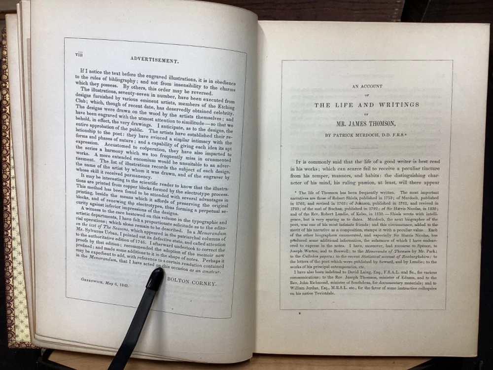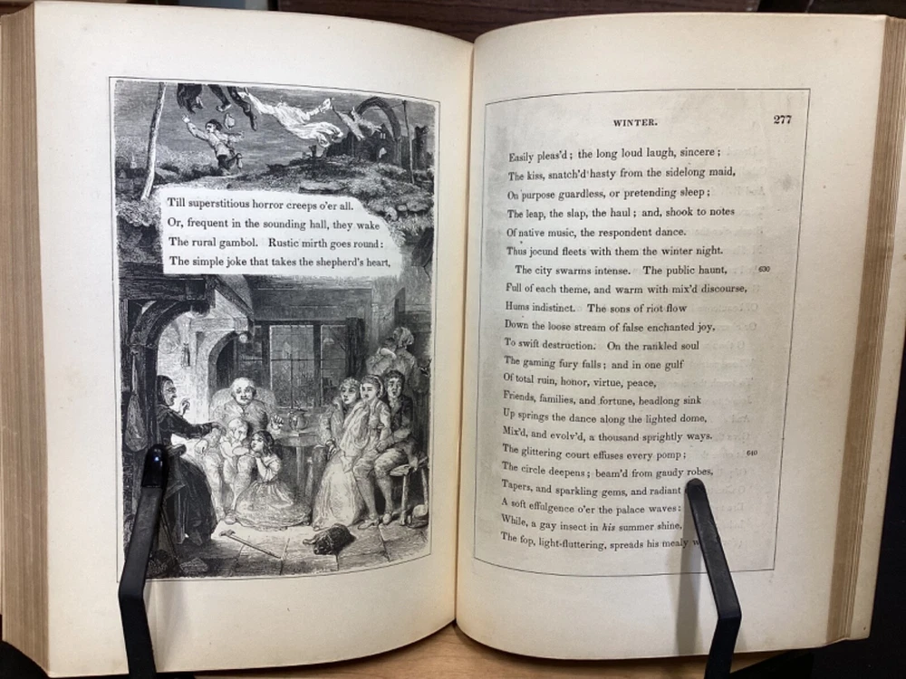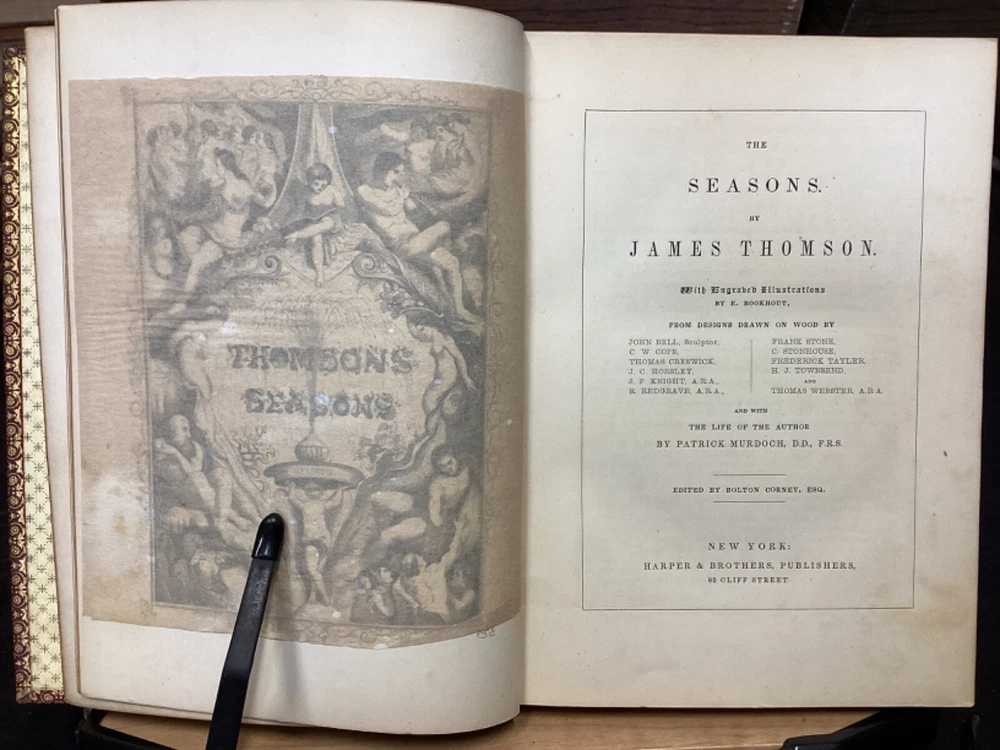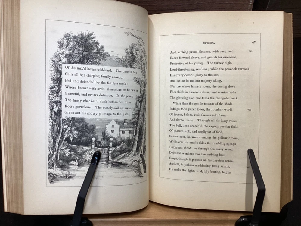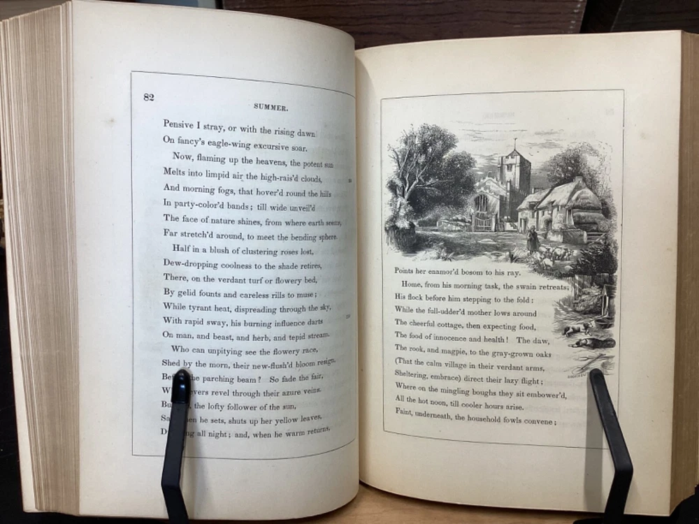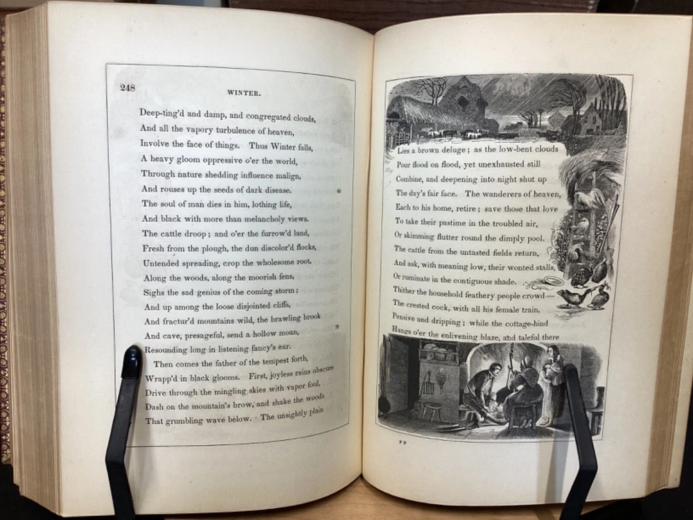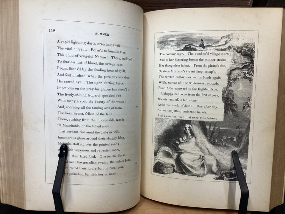 The Seasons by James Thomson, Harper & Brothers, New York, 1842, 320pp, leather, 6 x 8.5", 8vo Poor condition/as is. Front board is completely detached from binding. Wear and staining to front and rear boards. Moroccan red leather with gilt designs on front and rear boards. Tips are bumped. Chipping and cracking to spine, but still legible. Headcap is lacking with exposed binding. Fore edges in gilt. Patterned endpapers. Gift inscription in ink on front endpaper. Frontispiece opposite title page. Toning, age-staining, and finger-staining throughout textblock. Illustrated. Please see photos and ask any questions prior to purchase. The Seasons is a series of four poems written by the Scottish author James Thomson. The first part, Winter, was published in 1726, and the completed poem cycle appeared in 1730. The poem was extremely influential, and stimulated works by Joshua Reynolds, John Christopher Smith, Joseph Haydn, Thomas Gainsborough, and J.M.W. Turner. The edition in this listing also includes engraved illustrations and a biography of the author by Patrick Murdoch. FORN-TUB-0031-BB-0424-JC593