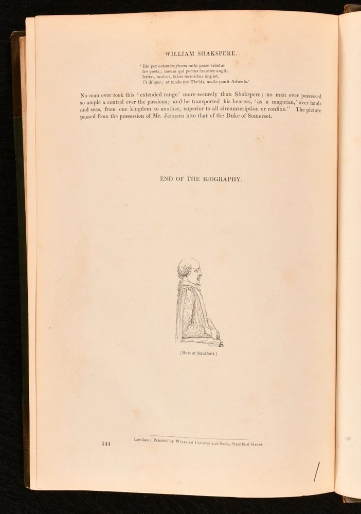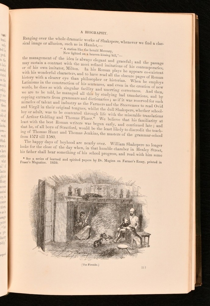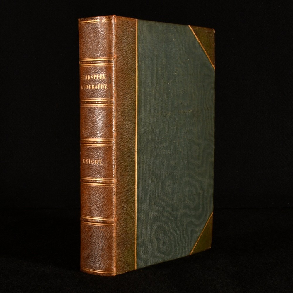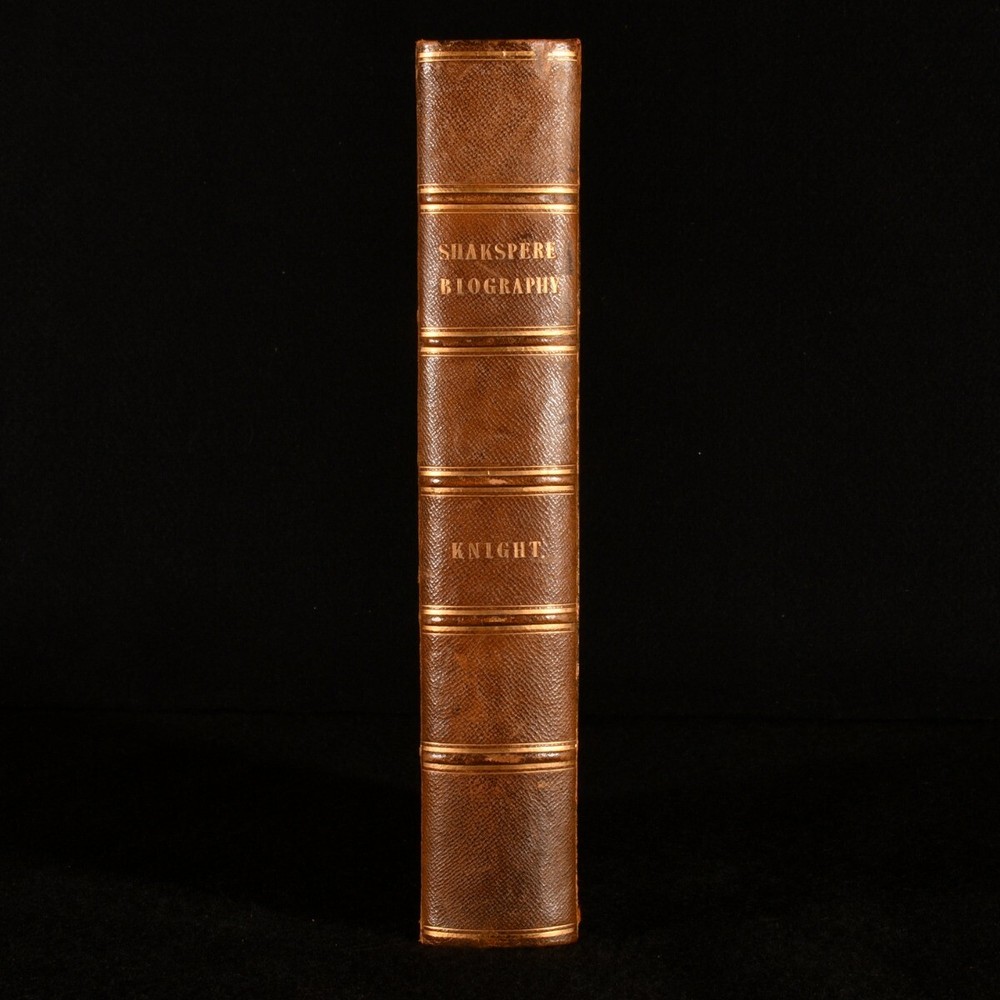 Click here to see our other books! William Shakespeare: A Biography Charles Knight 1843 [Charles Knight] : [London] 9.5" by 6.5" [10], 544pp. SUMMARY Pictorial biography of Shakespeare by Charles Knight, complete with two books in one volume. Illustrated,Leather Binding,Rebound Overall Condition: Very Good This book weighs 1.5 KG when packed UK Postage: £ 3.99 US Postage: £ 23.99 EU Postage : £ 18.99 European Postage: £ 19.99 Asia Postage: £ 31.99 Worldwide Postage: £ 32.99 DESCRIPTION This pictorial biography, richly decorated in text with numerous engravings from original drawings by W. Harvey, was originally published in parts between 1838 and 1841. The present copy complete with two books bound in one. Written by Charles Knight, English publisher and author known for his contributions to The Penny Magazine , and The English Cyclopeedia. CONDITION in a half straight up grain morocco binding over cloth covered boards, gilt to top edge. Externally very smart with minor shelf wear, minor rubbing along the joints, spine, and extremities, few light damp marking to rear board. Internally, firmly bound. Light spotting to first and last few leaves, otherwise pages bright and clean throughout. With numerous lovely illustrations in text. Overall Condition: Very Good GLOSSARY OF TERMS Overall Condition (Dustwrapper condition rating is shown after that for the book itself, where a dustwrapper is present) Fine - Very well preserved copy showing very little wear Very Good Indeed - Only one or two minor faults, really a very attractive copy Very Good - Quite a wide term meaning no major faults but probably several smaller ones often expected given the age of the book, but still a respectable copy Good - Meaning not very good. Some more serious faults as will be described in the condition report under 'condition' Good Only - Meaning one or more faults that could really do with repair Fair - As with good only above but with other faults leaving a compromised copy even after repair Poor - Really bad and possibly seriously incomplete. We only sell books in this condition where their rarity or value makes them attractive none the less. Major defects will be described. GUARANTEE We offer a full money back guarantee on our descriptions. Please ask for details and conditions. We prefer PAYPAL. If you pay via PAYPAL we will post the item off the same or the next working day with the postage you have selected. Please note we cannot accept USD cheques