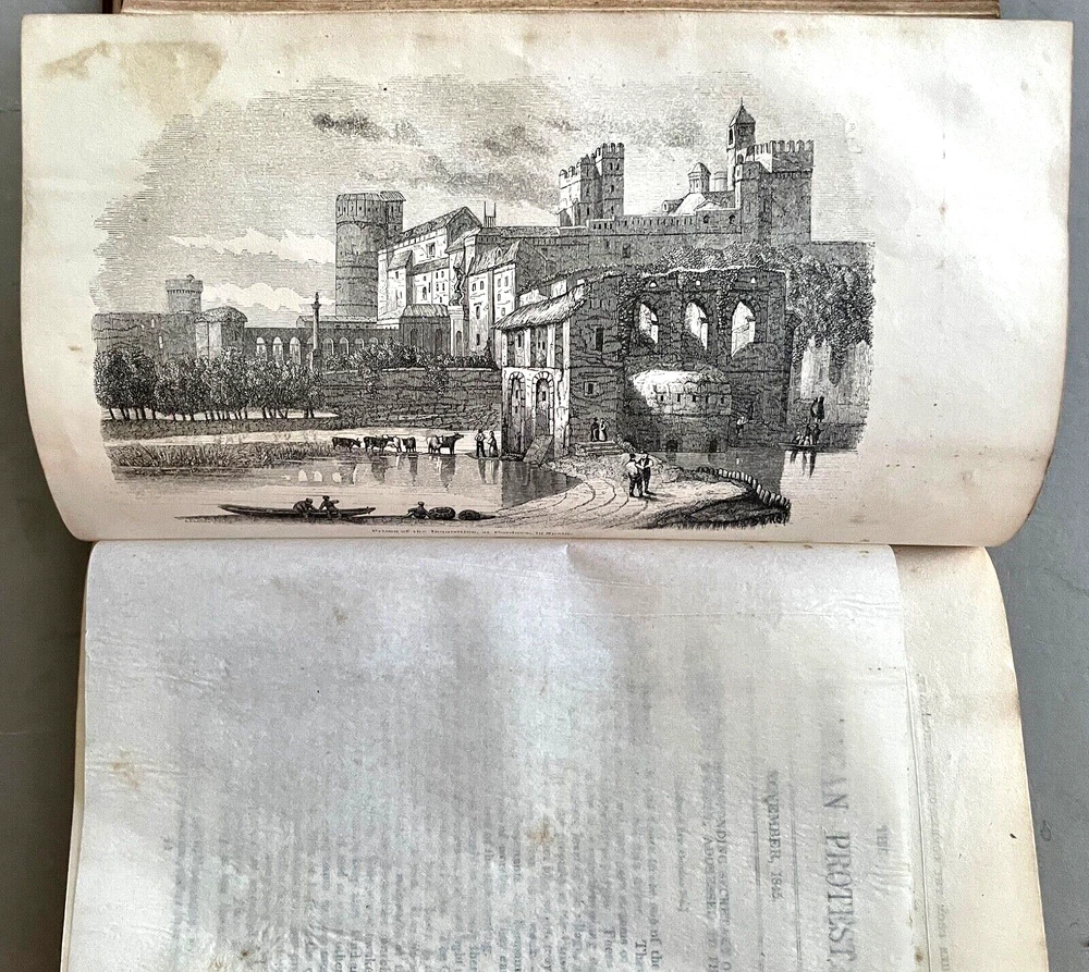 The American Protestant Magazine Vol. 1, nos. 1-12, b ound with two additional titles [FIRST EDITION] New York: American Protestant Society, (1845). Hardcover in 3/4 leather and marbled boards. Measures 9 x 6 inches; 384, 30, 32 pages illustrated with wood-block engravings throughout. Listed in Billington's 'Tentative Bibliography of Anti-Catholic Propaganda' (and given the engraved title page image of the Pope and other religious leaders drowning in the 'Sea of Truth,' it probably deserves the inclusion.) Bound together with: Rev. Joseph F. Berg, D.D., "A Lecture; Delivered in the Musical Fund Hall, On Tuesday Evening, November 26, 1850, In Answer to Archbishop Hughes on the Decline of Protestantism; Rev. N. Murry, D.D., The Decline of Popery and Its Causes, An Address Delivered to The Broadway Tabernacle on Wednesday Evening, January 15, 1851. Some wear and scuffing of leather and boards but a sound copy of this rarely found title. Leather title label with center chip; light to moderate foxing, age-toning, staining, etc. Uncollated and potentially missing an unpaginated engraving or two (?) but otherwise complete.