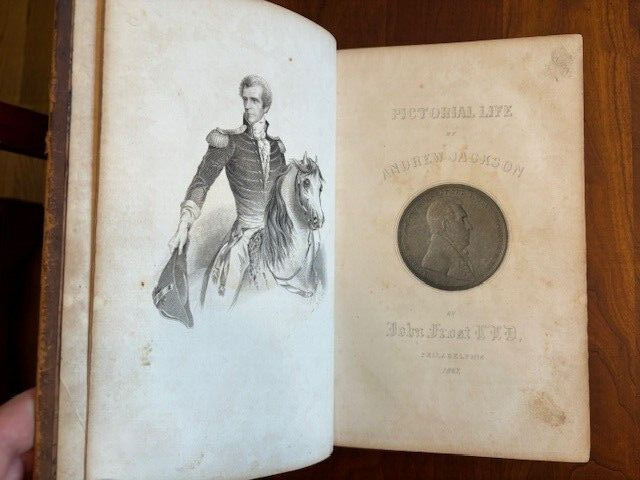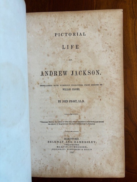 PICTORIAL LIFE OF ANDREW JACKSON By John Frost Published: Hartford: Belknap and Hamersley/Philadelphia: Martin Bomberger/Cincinnati: Bomberger & Gillis, 1847. Illustrated from engravings. 8vo., calf decorated in blind to upper board and stamped in gilt to spine, raised bands, marbled edges and endpapers. Foxing throughout text. Front hinge cracked and board loose, but still attached. I've done my best to describe the book, but if you have additional questions, please don't hesitate to send me an e-mail.