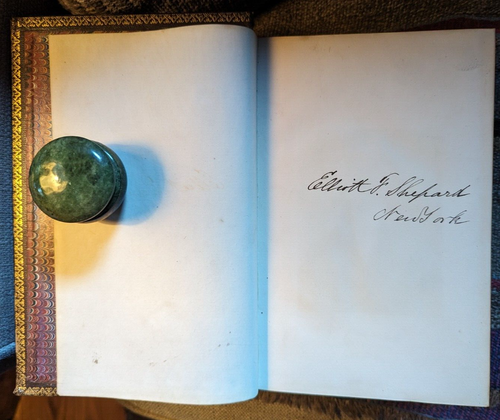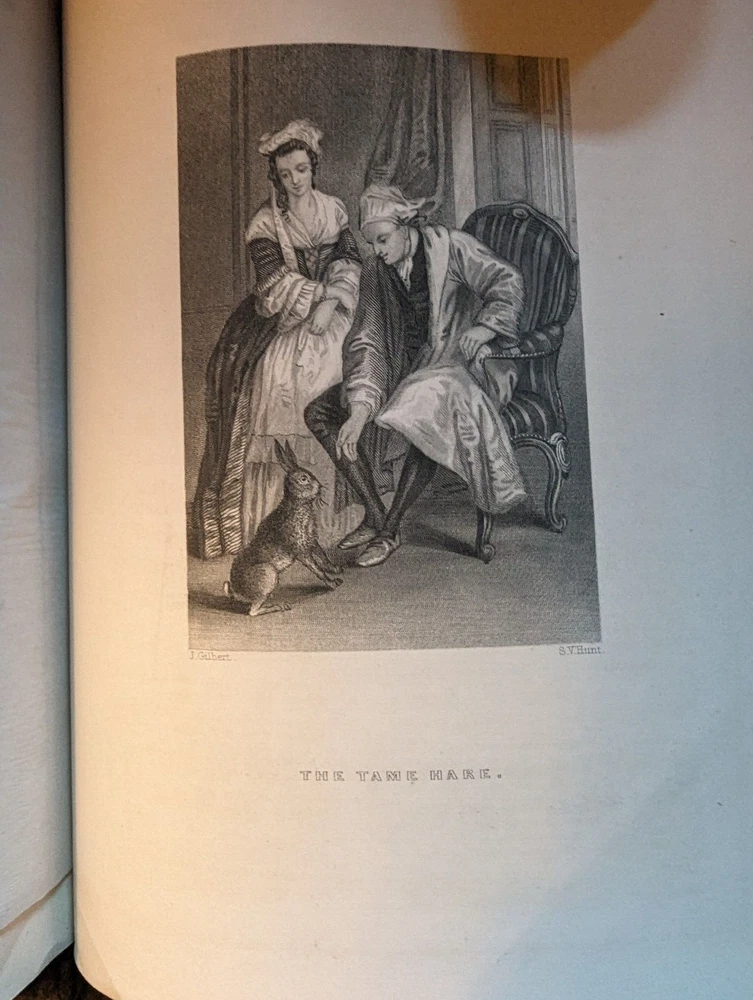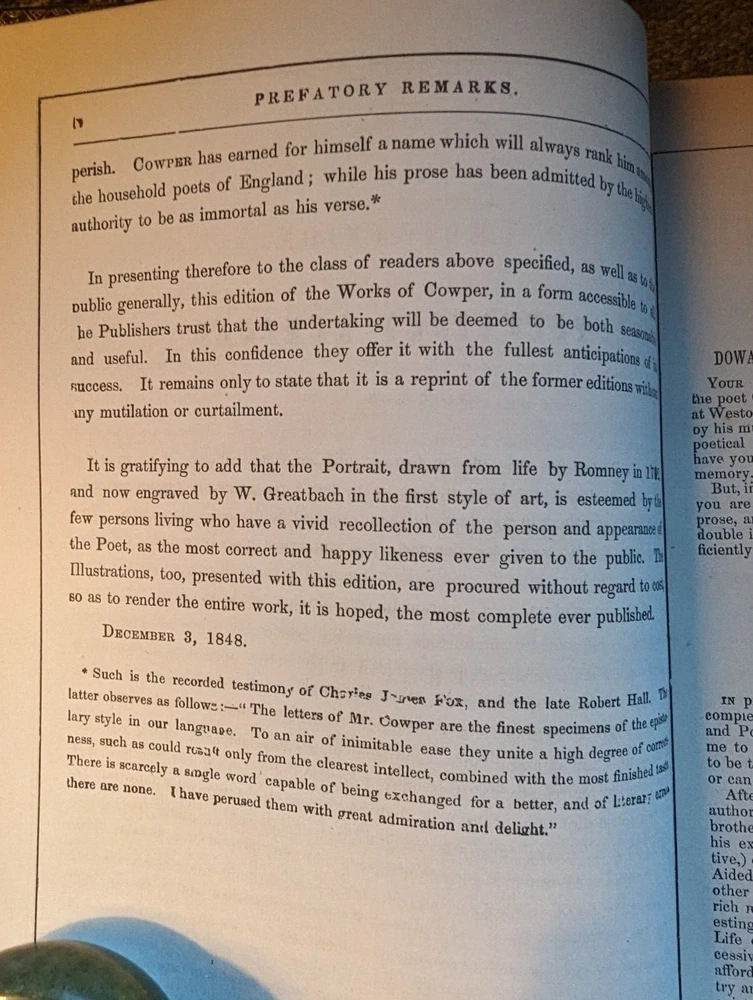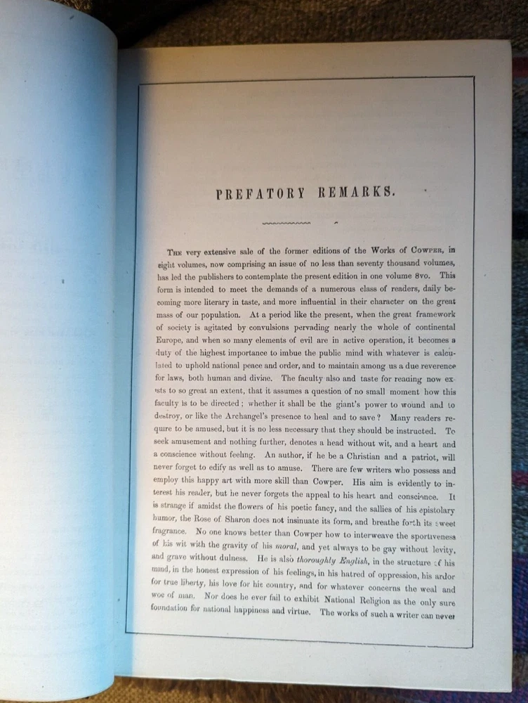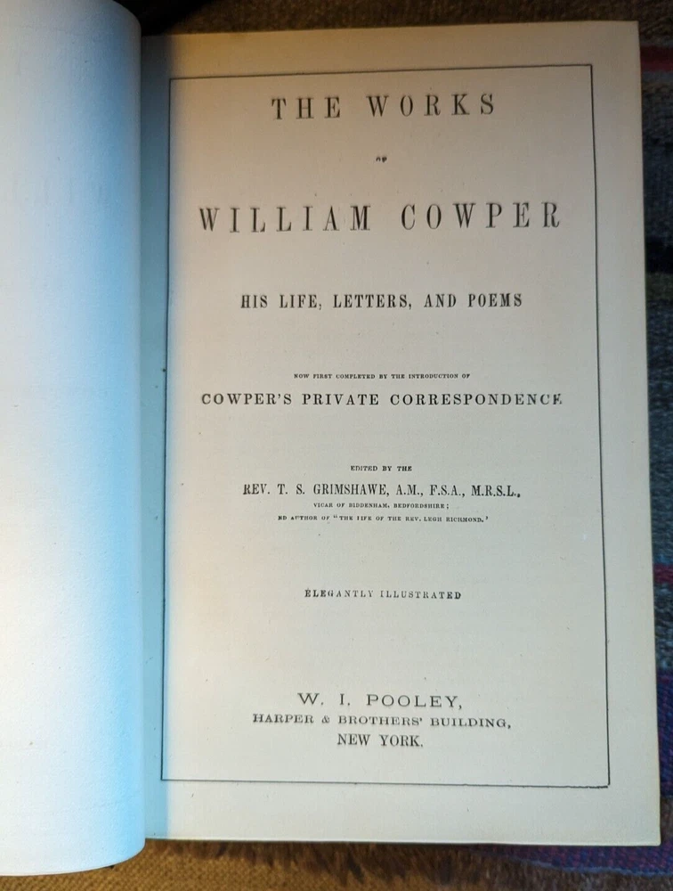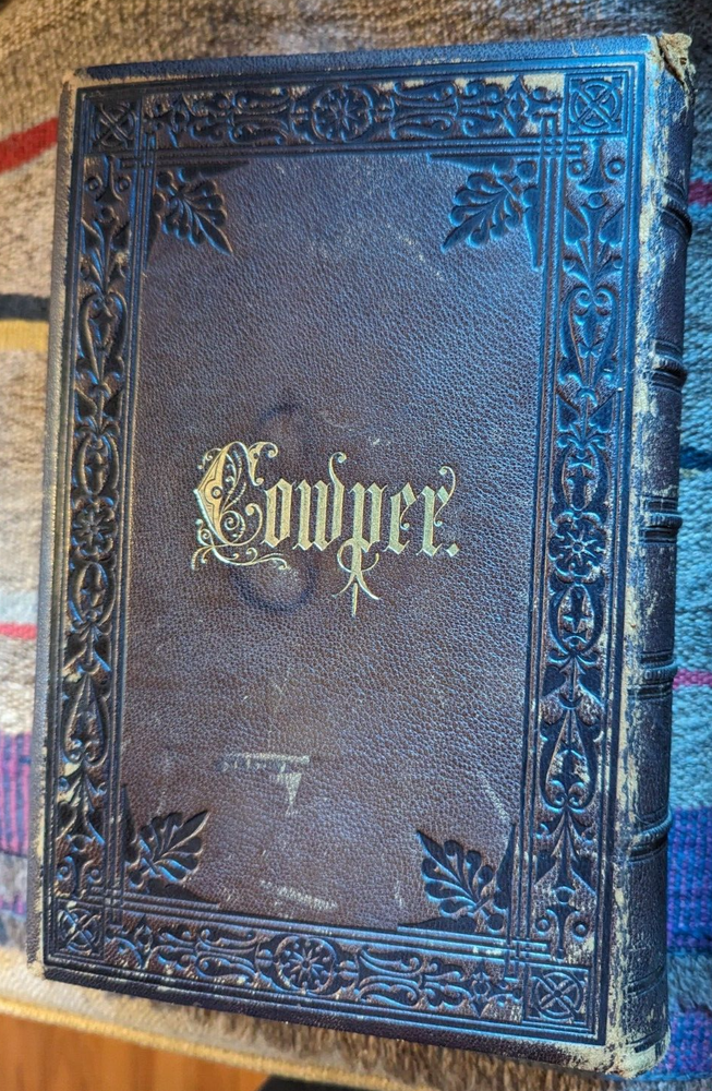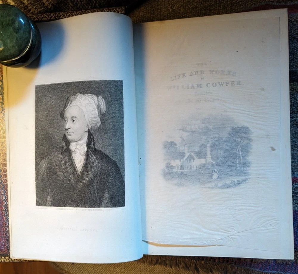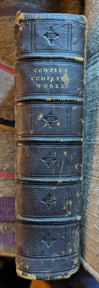 c.1848*-'Works of William Cowper, Life, Letters & Poems' Private Correspondence Edited by Rev. T. S. Grimshawe Leatherbound, All Gilt Edges Fine Woodcut Illustrations Cowper, pronounced 'Cooper', was a famous poet and writer of hymns, most notably the one that begins "The Lord works in mysterious ways..." He lived his life under the oppression of mental illness and died finally from suicide in 1800 but in the meanwhile his journey through life had many differing episodes, most famously his transition from Atheism to an evangelical Christianity. As a writer of many hymns, among other reasons, his life is a favorite subject of theologians to this day. For a closer look at his life you need only go to Youtube for a variety of presentations to meet every need. This would make a great gift for a Reverend or perhaps the religious student in your life. The book is finely bound in leather with three shiny gold gilt edges with text presented in a double column format that puts one in mind of an ancient tome. *There is no copyright page or printing history. The introductory page is dated 1848, and the style of the production is more common to the first half of the 19th century.
