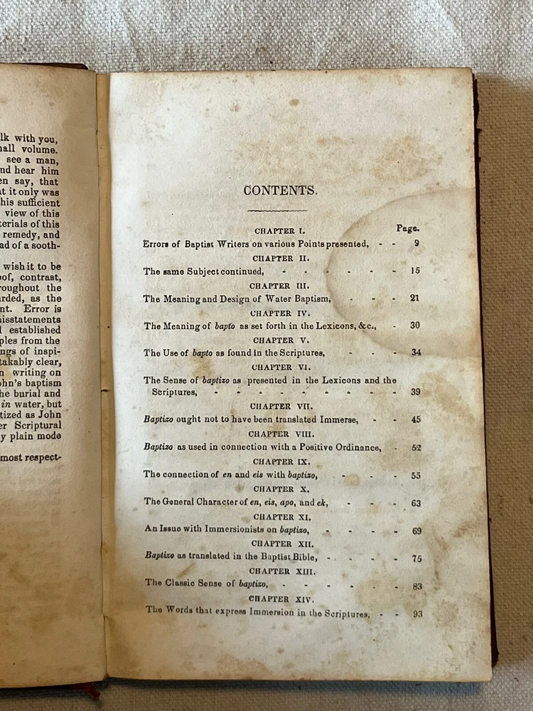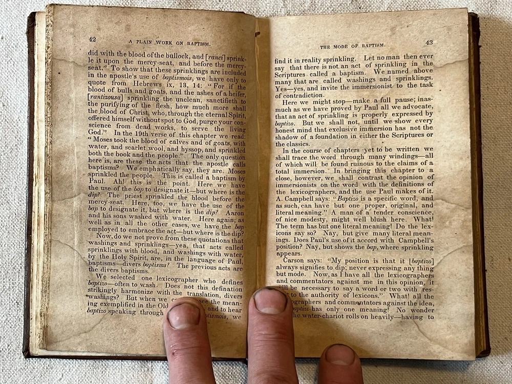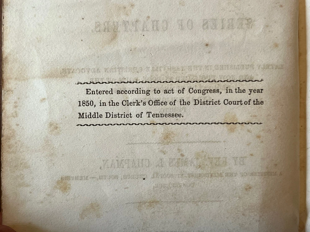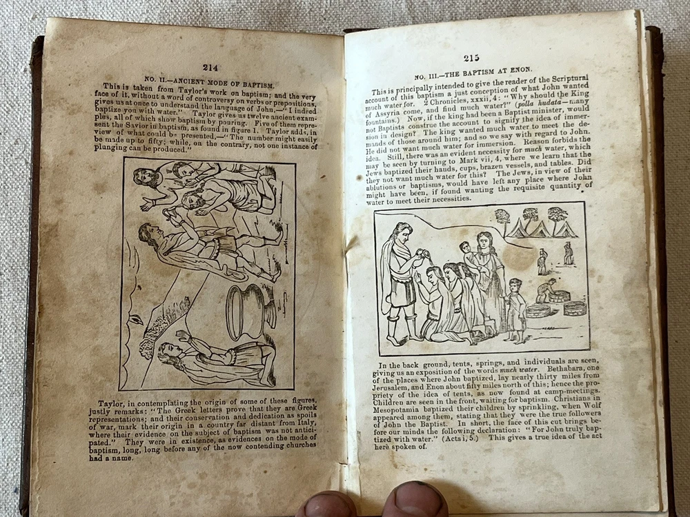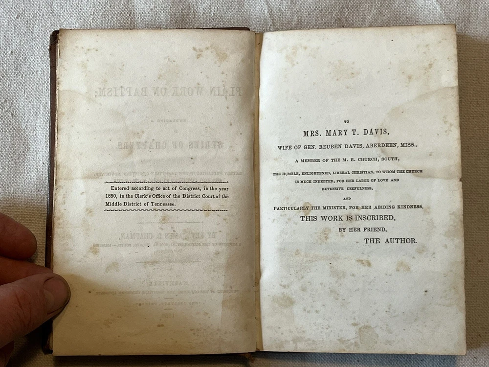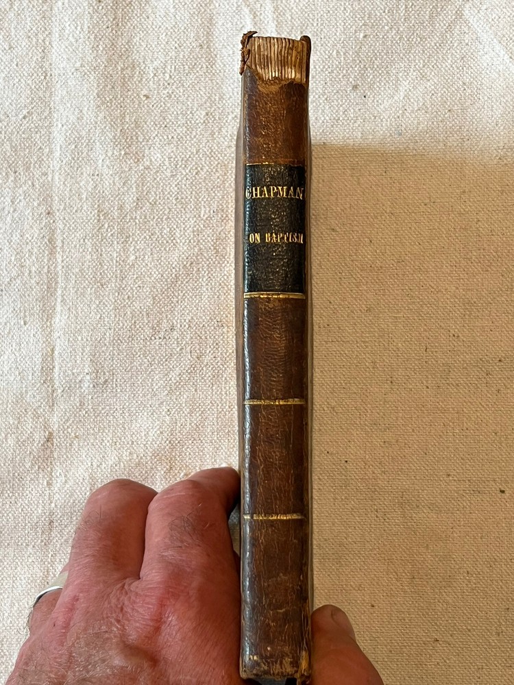 1850 1st ed Plain Work On Baptism Embracing A Series Of Chapters, by Rev. James L Chapman, published by the Nashville Christian Advocate, 215 pages, Nashville TN Leather Bound. This manuscript was first published by The Nashville Christian Advocate and later published in book form by the same group. This is a 1st ed. of the book. Size: 7”x4.5”x.75” Condition: please look closely at pics and ask questions. I will send more pics if needed. Overall condition is Fair, book has numerous flaws and imperfections but is complete and intact. Front cover is bumped and worn at edges. Spine is split at top and bottom with a 1/2” bite from the top. Back cover has a noticeable crease and is also bumped and worn at the edges. Writing in pencil to front and back inside covers. Foxing and water damage throughout. Book is warped at the edges. Those are some of the more notable issues but I’m sure there are more. Selling AS IS so please look at the pictures and contact me if you need more information. Shipping is USPS First Class with insurance. I do not ship rare and expensive books Media Mail