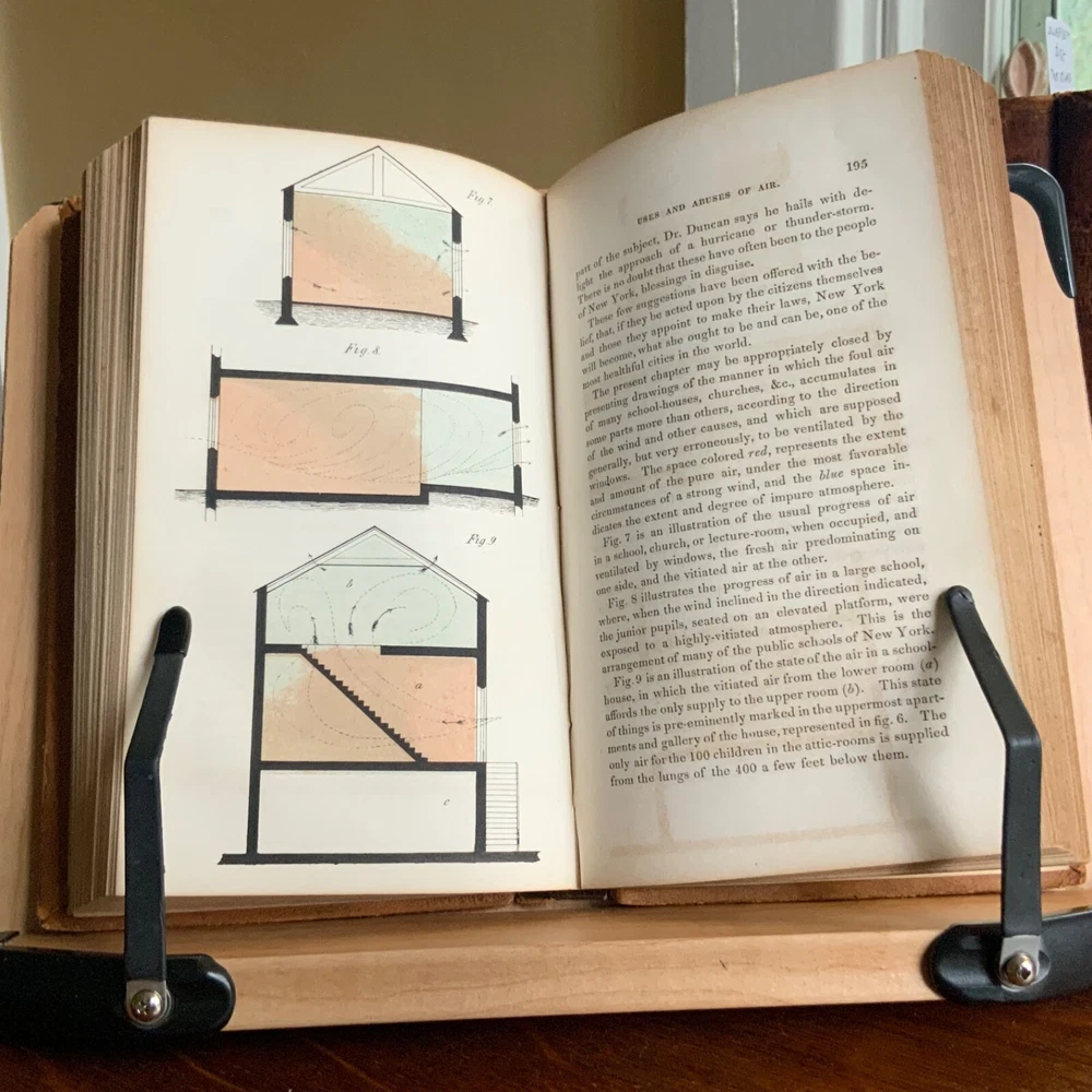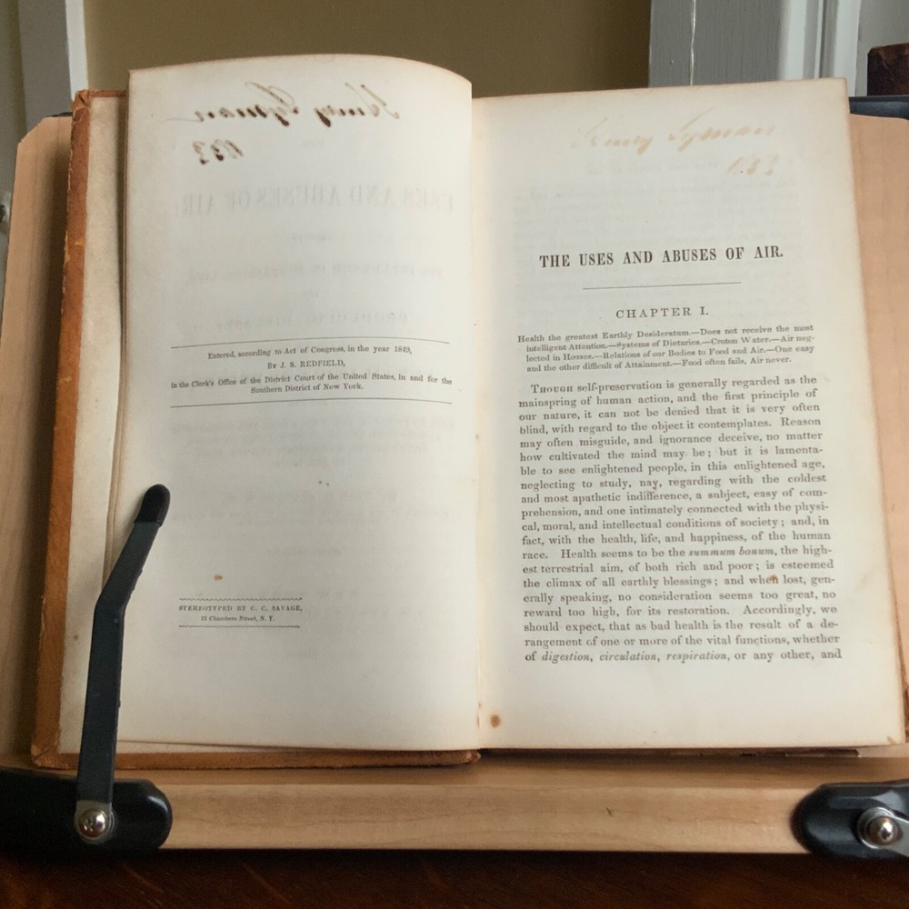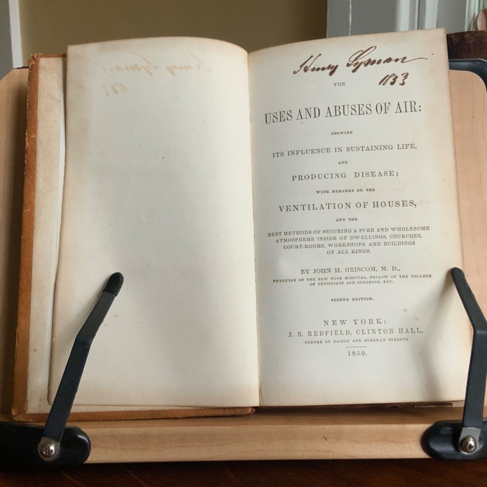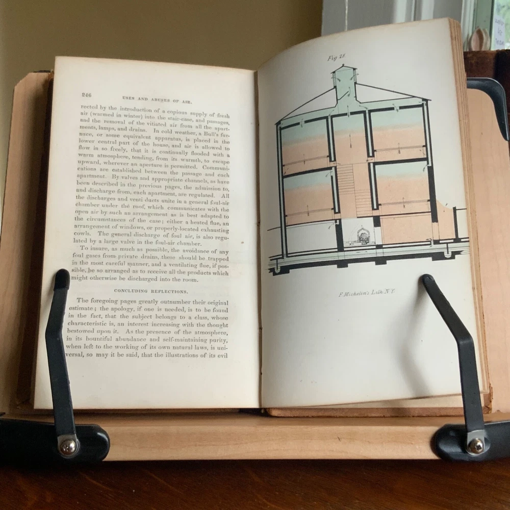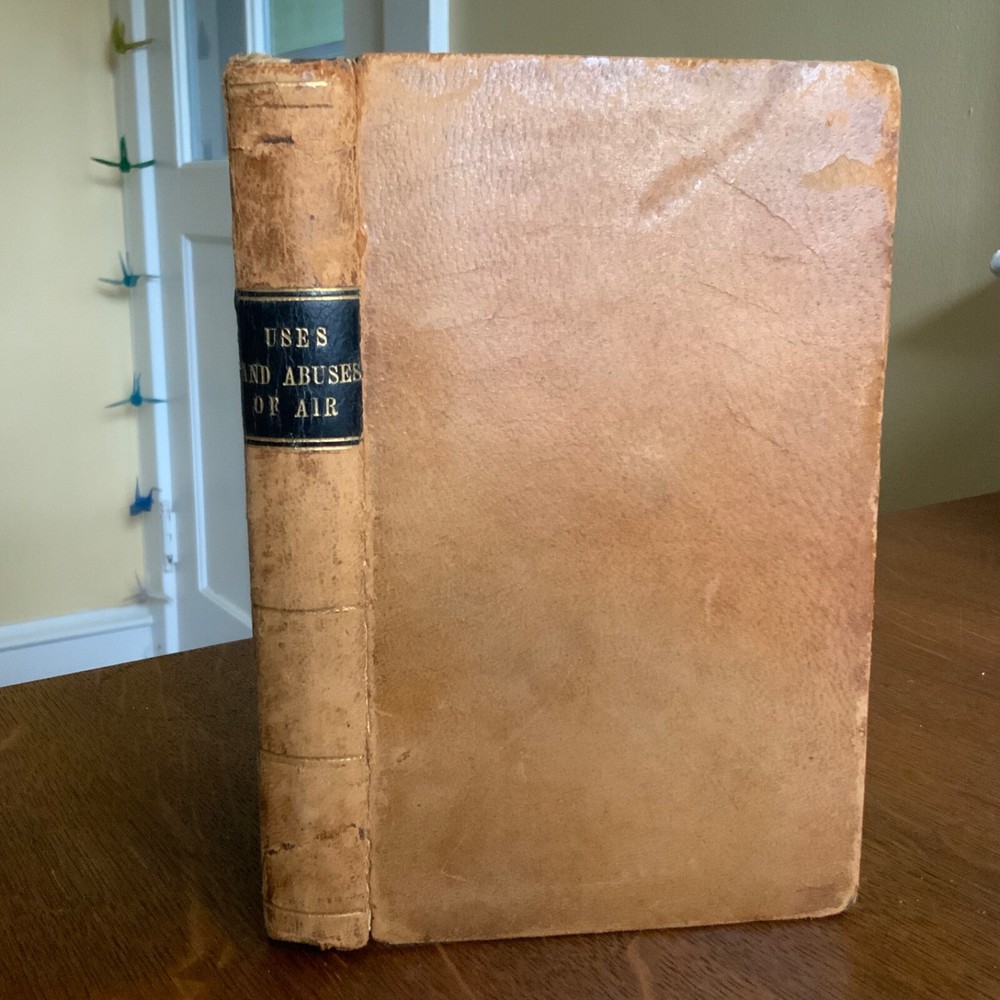 The Uses and Abuses of Air: Showing Its Influence in Sustaining Life, and Producing Disease; with Remarks on Ventilation of Houses, and the Best Methods of Securing a Pure and Wholesome Atmosphere Inside of Dwellings, Churches, Court-Rooms, Workshops, and Buildings of All Kinds, By John H. Griscom, J.S. Redfield, New York, 1850, 252 pp plus publisher’s adverts [13], twenty-three illustrations, nine color lithographs, full original leather, 7.75 x 5”, 12mo. In good condition. Light wear to extremities with minor scuffing along edges and corners. Desiccation present at edges with light scuffing at surface of leather. Spine dried with cracking at bottom and top compartments. Bookplate of Penn State Architecture professor Maurice Robert des Marais on pastedown. Old hand ownership of Henry Lyman dated 1853 on title. Offsetting from signature on following leaf. Light toning throughout with minor instances of foxing. Some offsetting from plates. Free of known marginalia. Binding tight and intact. Please see photos. Second edition, first published in 1849. The author was a physician of the New York Hospital. He uses color lithographic diagrams to illustrate the flow of air through rooms; this was a convention that can be seen in other similar books of the later 19th-century, but this is quite an early instance. COLN1850ADED-923