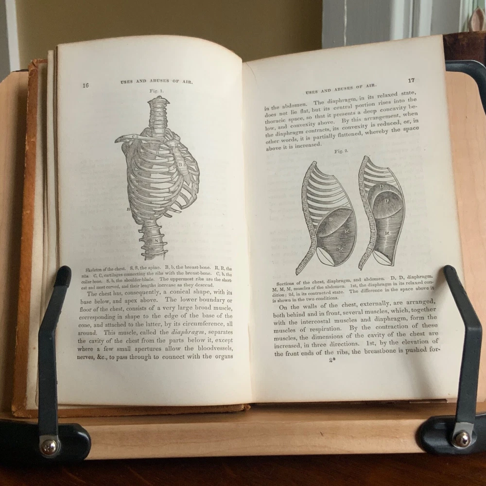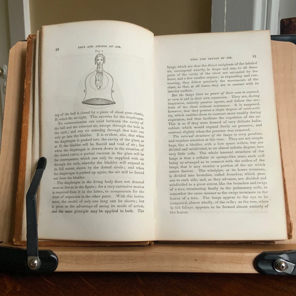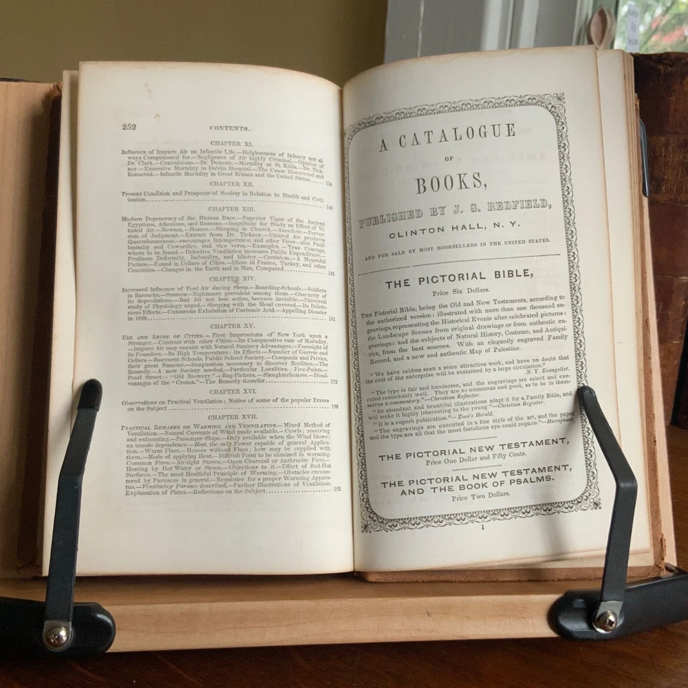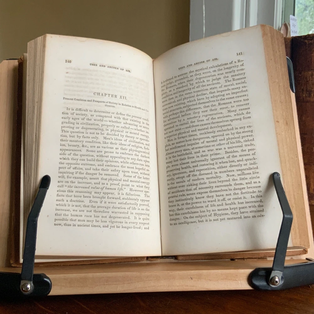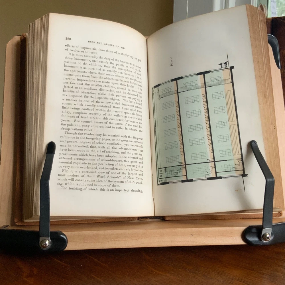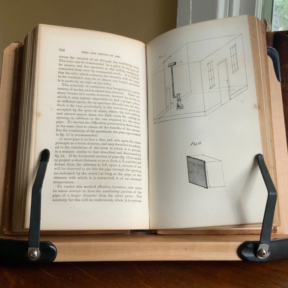 The Uses and Abuses of Air: Showing Its Influence in Sustaining Life, and Producing Disease; with Remarks on Ventilation of Houses, and the Best Methods of Securing a Pure and Wholesome Atmosphere Inside of Dwellings, Churches, Court-Rooms, Workshops, and Buildings of All Kinds, By John H. Griscom, J.S. Redfield, New York, 1850, 252 pp plus publisher’s adverts [13], twenty-three illustrations, nine color lithographs, full original leather, 7.75 x 5”, 12mo. In good condition. Light wear to extremities with minor scuffing along edges and corners. Desiccation present at edges with light scuffing at surface of leather. Spine dried with cracking at bottom and top compartments. Bookplate of Penn State Architecture professor Maurice Robert des Marais on pastedown. Old hand ownership of Henry Lyman dated 1853 on title. Offsetting from signature on following leaf. Light toning throughout with minor instances of foxing. Some offsetting from plates. Free of known marginalia. Binding tight and intact. Please see photos. Second edition, first published in 1849. The author was a physician of the New York Hospital. He uses color lithographic diagrams to illustrate the flow of air through rooms; this was a convention that can be seen in other similar books of the later 19th-century, but this is quite an early instance. COLN1850ADED-923