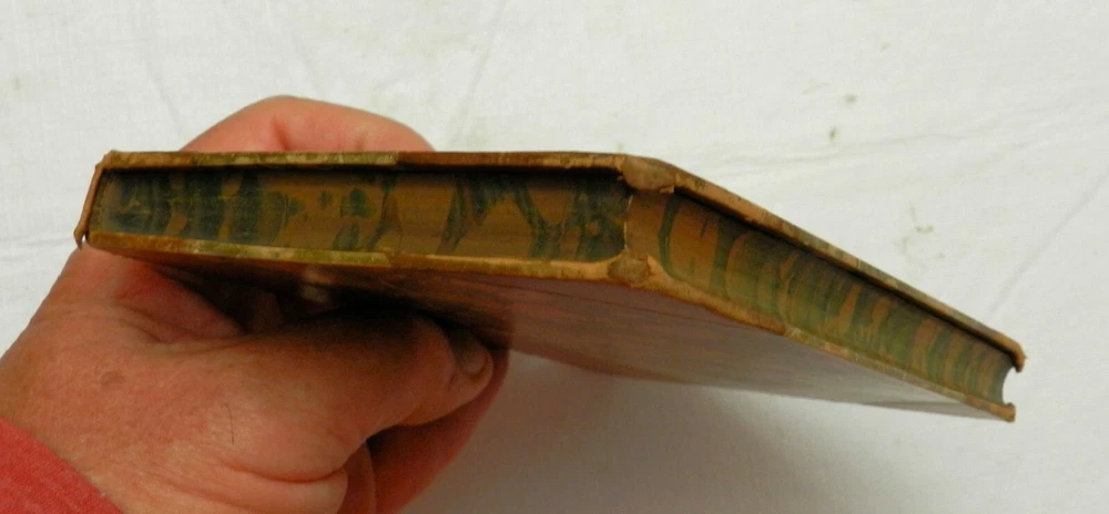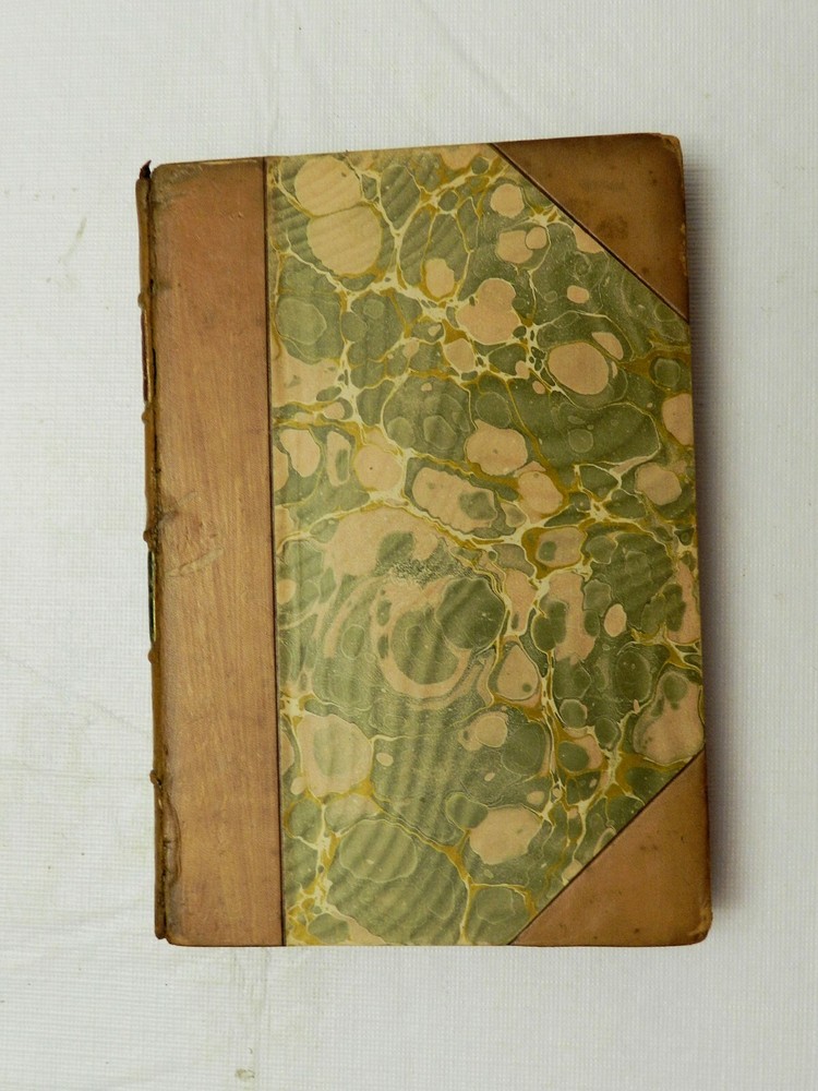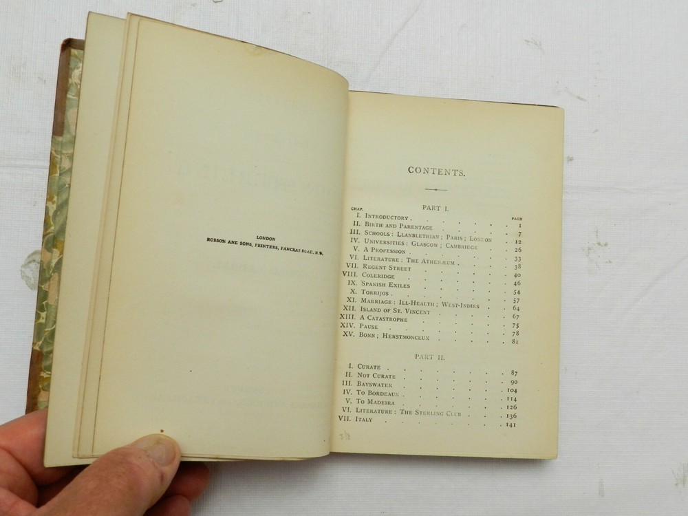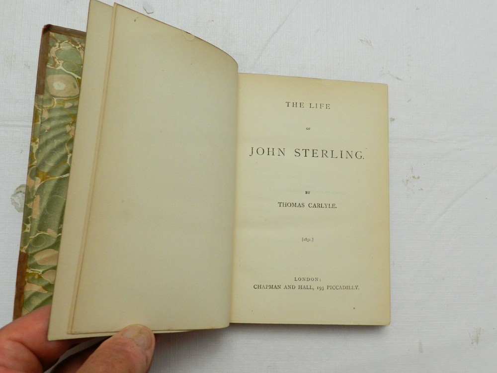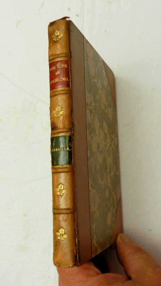 BEAUTIFUL UNIFORM 3/4 LEATHER, FIRST EDITION OF THIS BIOGRAPHY BY THOMAS CARLYLE. John Sterling (1806-1844) was poet, essayist, dissenting clergyman, member of the "Cambridge Apostles". From Wikipedia: "Sterling published in 1833 Arthur Coningsby, a novel, which attracted little attention, and his Poems (1839), the Election, a Poem (1841), and Strafford, a tragedy (1843), were not more successful. He had, however, established a connection in 1837 with Blackwood's Magazine, to which he contributed a variety of papers and several tales. Among these papers were allegorical fantasy stories such as "The Onyx Ring", "Land and Sea", "A Chronicle of England" and "The Palace of Morgana." John Sterling's papers were given to the joint care of Thomas Carlyle and Hare. Essays and Tales, by John Sterling collected and edited, with a memoir of his life, by Julius Charles Hare, appeared in 1848 in two volumes. Carlyle was dissatisfied with the Memoir and wrote a vivid Life (1851)." The book is solidly bound. Both the front and rear boards show a crack at the spine, but a previous owner apparently affected a good repair and now boards are solidly attached. Spines with 5 raised bands, black and red title blocks on the spine, gilt lettering and design on spine. Floral boards, matching floral endpapers, floral page edges, 248 pages. No interior marks A NICE ANTIQUE BOOK! B11