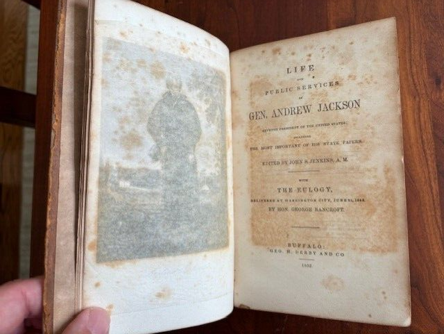 LIFE AND PUBLIC SERVICES OF GENERAL ANDREW JACKSON. By John S. Jenkins Published: George H. Derby & Co., Buffalo, NY, 1852. Hardcover in leather binding. Hinges loose, spine taped, some water spots but otherwise good for age, portrait intact. I've done my best to describe the book, but if you have additional questions, please don't hesitate to send me an e-mail.