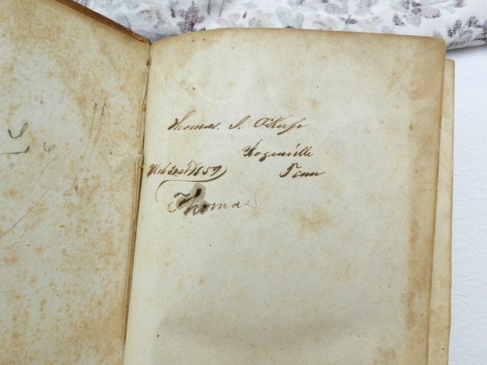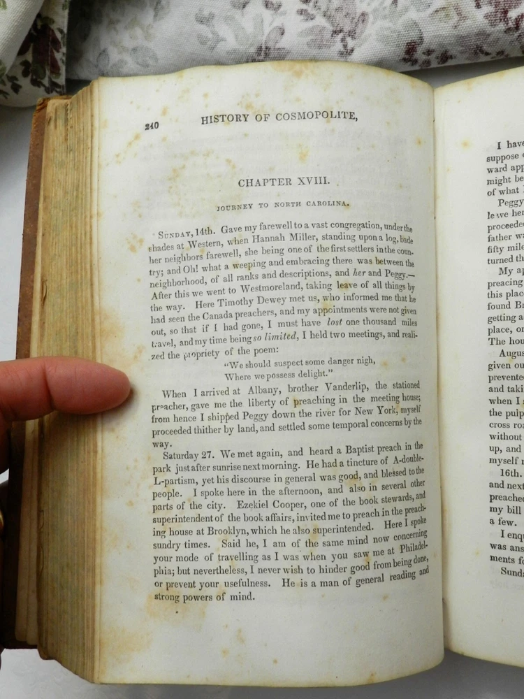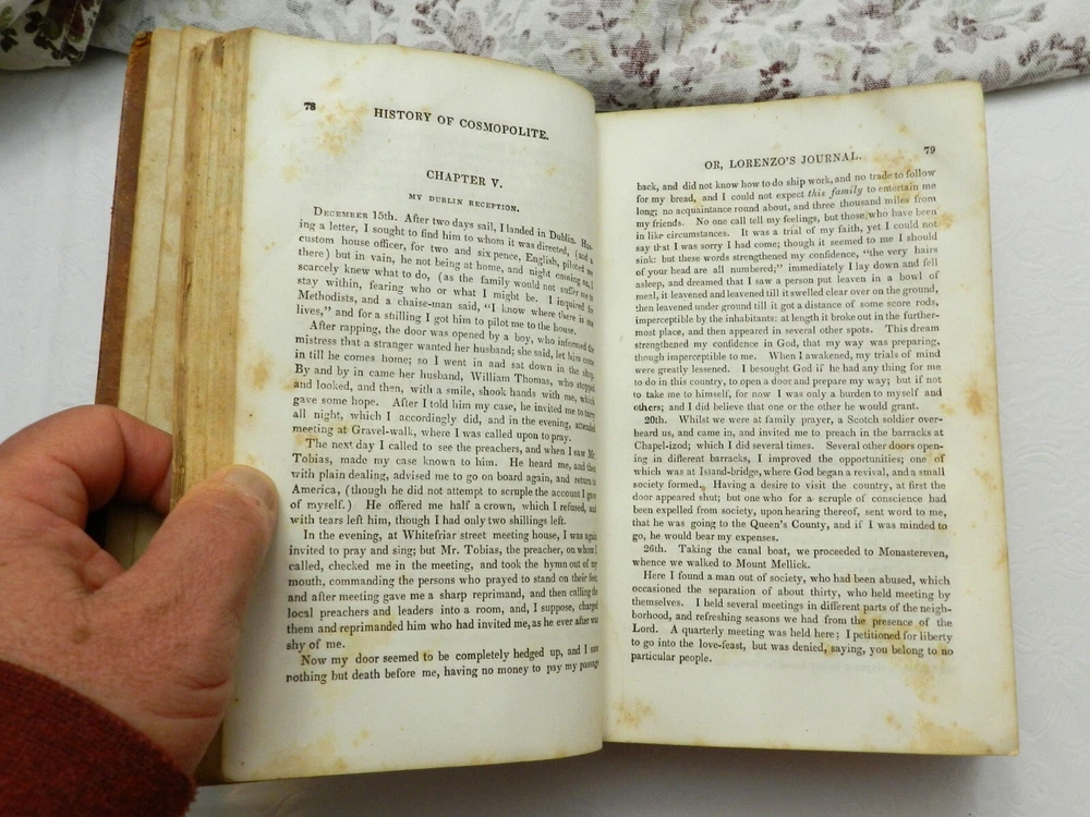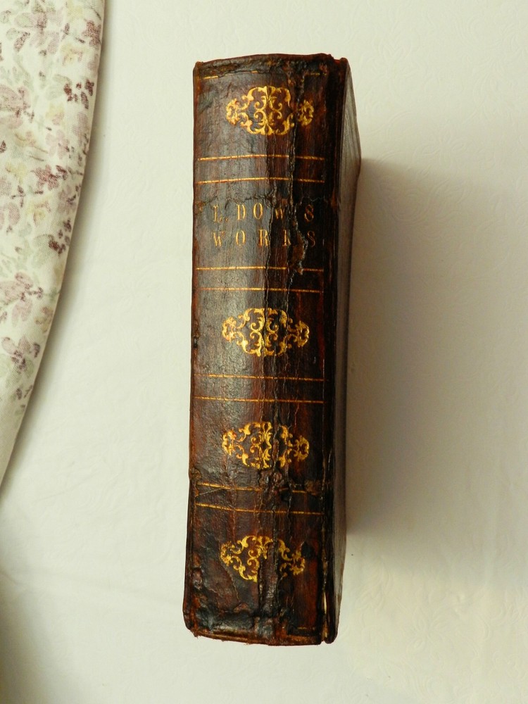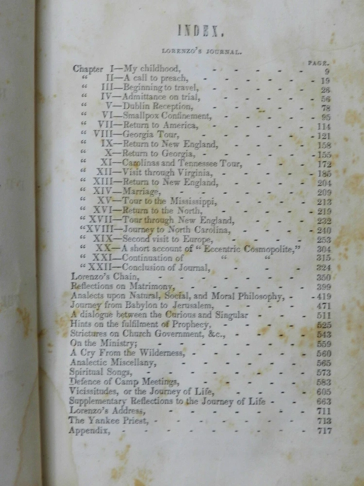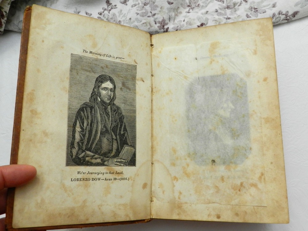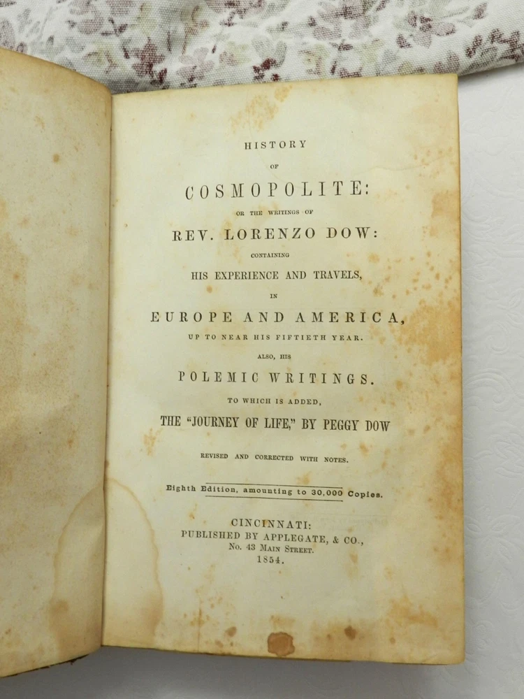 INTERESTING COMPILATION OF WORKS BY REVEREND LORENZO DOW, A NOTED AUTHOR FROM THE EARLY 1800s! Fully titled, History of Cosmopolite : Or the Writings of Rev. Lorenzo Dow : Containing His Experience and Travels, in Europe and America, Up to Near His Fiftieth Year. Also, His Polemic Writings. To Which is Added, The "Journey of Life," by Peggy Dow. This is the Eighth Edition (stated on title page), published in 1854 by Applegate, & Co. The copyright page notes a date of 1848, presumably the date of the First Edition of this Tome. This book is in VERY GOOD CONDITION, having been refurbished and reinforced. The leather boards are original, embossed, treated and sealed. The spine is cracked but again is sturdy having been sealed, with rubbed but clear gilt titling and decoration. The title is, L. DOW'S WORKS. The first free endpaper has a name and date - Mar. 31, 1859. No other markings in 720 clean and solidly bound pages, marble page edges. There is foxing throughout, heaviest in the first several (fading to the background amount by about page 25) and last few pages. The book has two portraits to start off the book - the author and his wife, with tissue protection between them. There are no further plates. From Wikipedia: "Lorenzo Dow (October 16, 1777 – February 2, 1834) was an eccentric itinerant American evangelist, said to have preached to more people than any other preacher of his era. He became an important figure and a popular writer. His autobiography at one time was the second best-selling book in the United States, exceeded only by the Bible". Here is the beginning of a lengthy bio found online: "This is the record of a remarkable and eccentric white man who devoted himself to a life of singular labor and self-denial. In any consideration of the South one could not avoid giving at least passing notice to Lorenzo Dow as the foremost itinerant preacher of his time, as the first Protestant who expounded the gospel in Alabama and Mississippi, and as a reformer who, at the very moment when cotton was beginning to be supreme, presumed to tell the South that slavery was wrong. He arrests attention-this gaunt, restless preacher. With his long hair, his flowing beard, his harsh voice, and his wild gesticulation, he was so rude and unkempt as to startle all conservative hearers. Said one of his opponents: "His manners (are) clownish in the extreme; his habit and appearance more filthy than a savage Indian, his public discourses a mere rhapsody, the substance often an insult upon the gospel." Said another as to his preaching in Richmond: "Mr. Dow's clownish manners, his heterodox and schismatic proceedings, and his reflections against the Methodist Episcopal Church, in a late production of his on church government, are impositions on common sense, and furnish the principal reasons why he will be discountenanced by the Methodists." B129