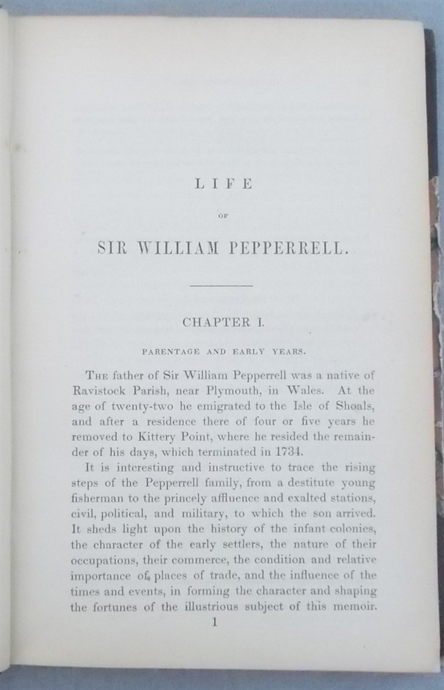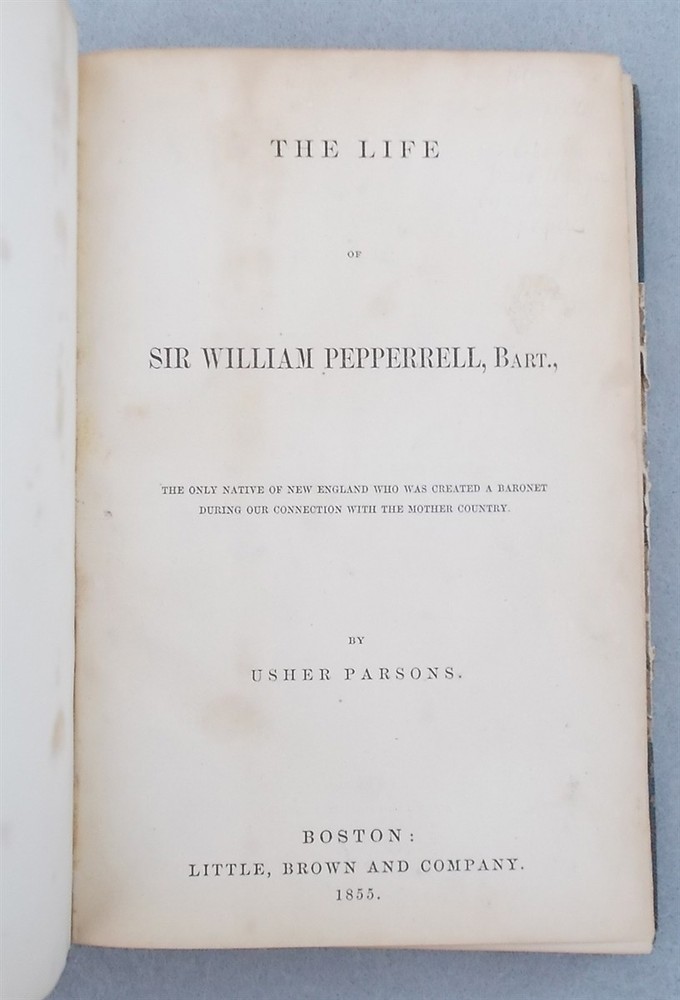 Parsons, Usher. The Life of Sir William Pepperrell, Bart. : the Only Native of New England Who Was Created a Baronet During Our Connection with the Mother Country. Boston: Little, Brown and Co. , 1855. First Edition. Leather: Very Good 7.75" x 5.5", 352pp. Handsomely bound in early half-leather over marbled boards, with matching marbled endpapers. Minimal scuffing to the leather, a bit of foxing to the first and last few leaves.