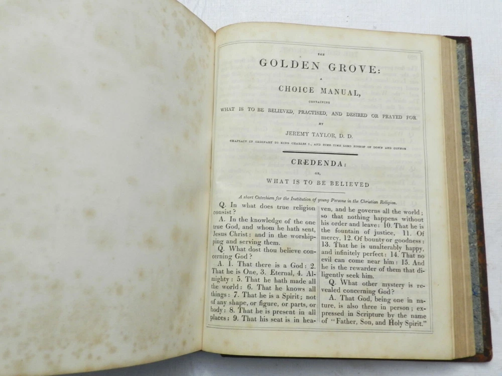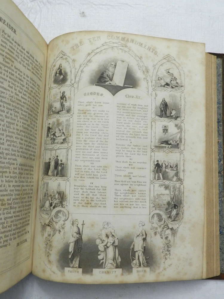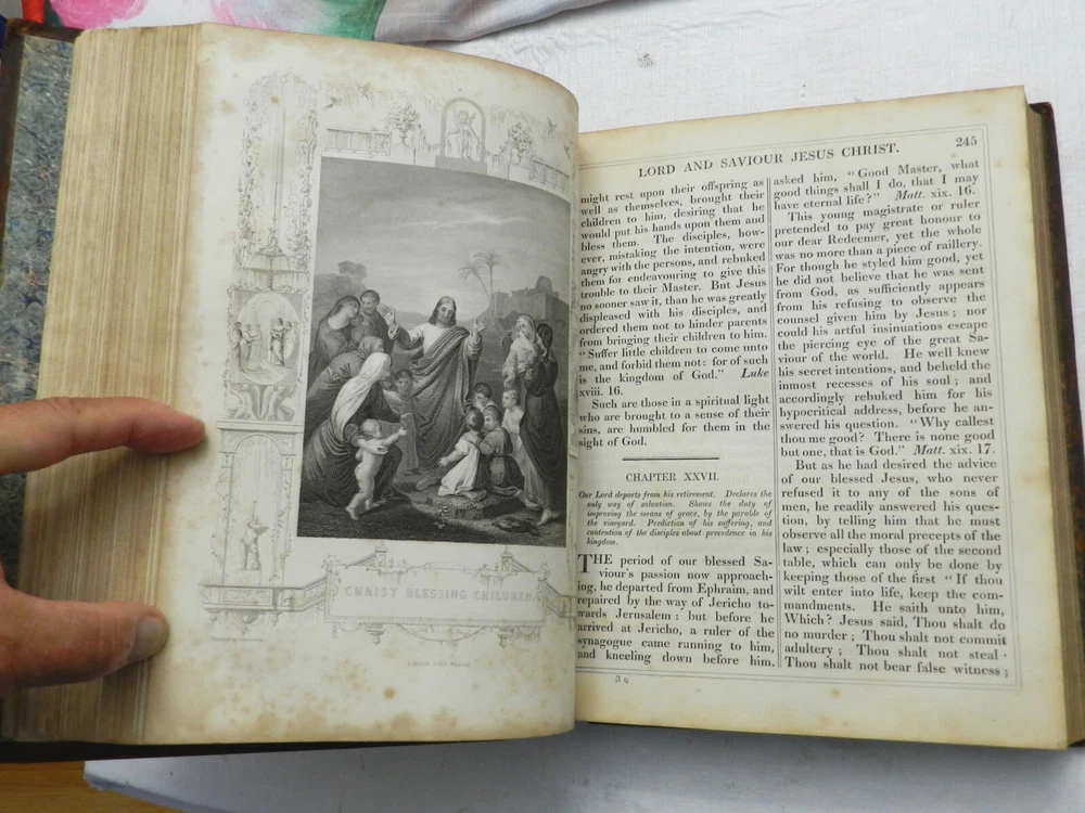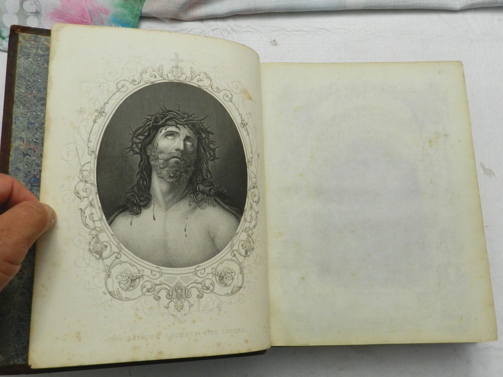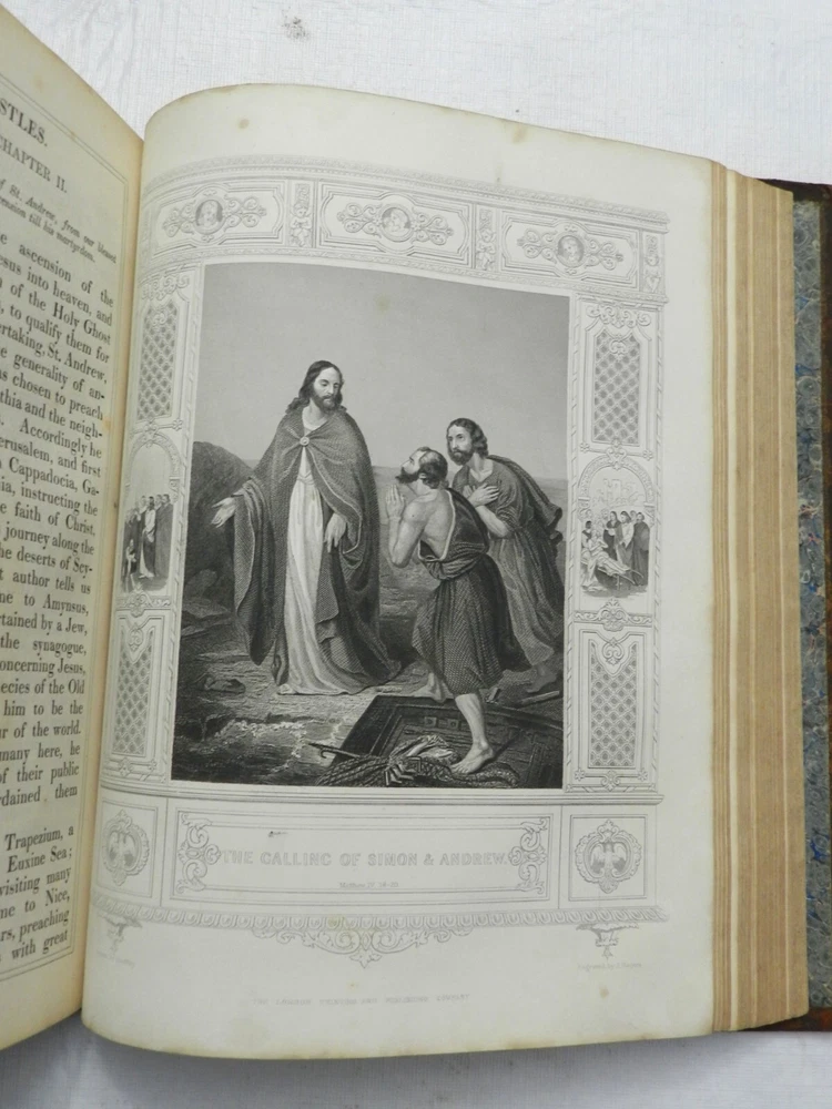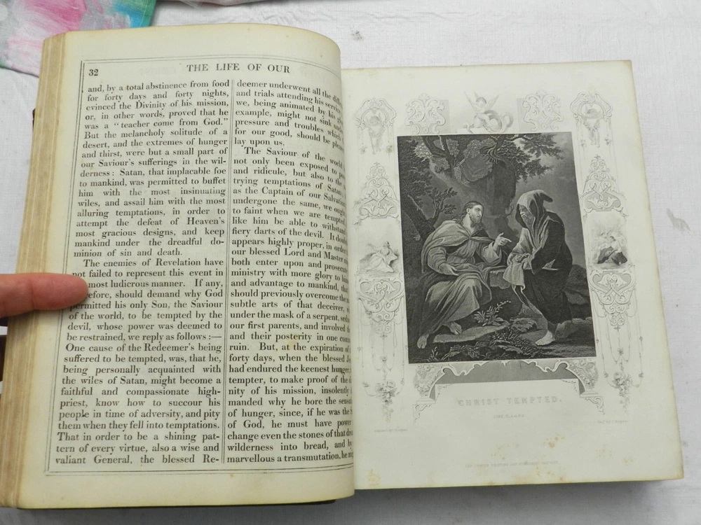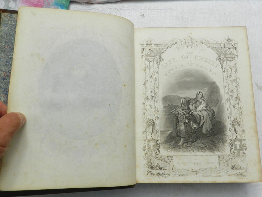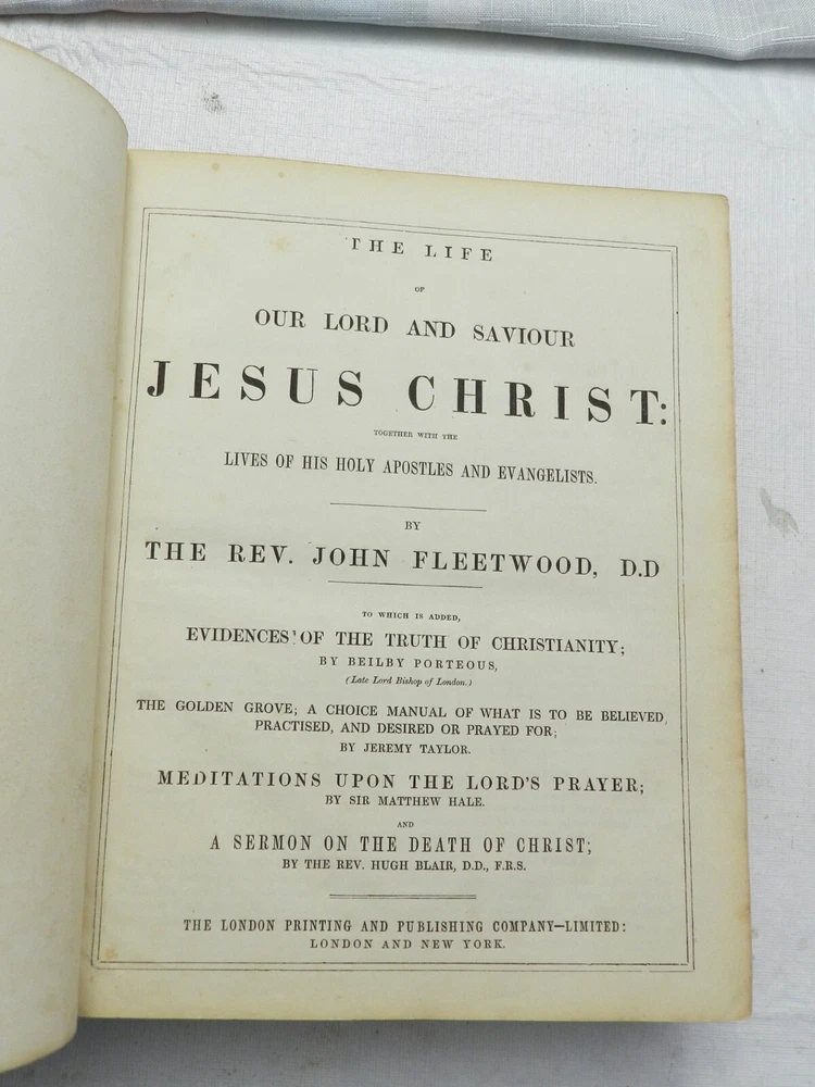 SUMPTUOUS TREATMENT OF THIS BIOGRAPHY OF JESUS CHRIST, ALONG WITH OTHER ESSAYS. Many versions of this underlying book can be found online, with what I believe to be the First Edition published in 1790. There is no date on this copy, but a very similar copy online with the same number of pages and additional sections was claimed to have been published in 1850. This copy, however, had a different publisher. A listed version by the same publisher of this copy, The London Printing and Publishing Company-Limited, with the same number of pages, was claimed to have been published "c. 1865". Finally, this copy has a BEAUTIFUL BOOKPLATE behind the front board which is dated, 1856. With all this information, I'll speculate on a date of publication of 1855. The fully title including all the additional sections is, "The Life of Our Lord and Saviour Jesus Christ: Together with The Lives of His Holy Apostles and Evangelists. To which is added, Evidences of the Truth of Christianity, by Beilby Porteus; The Golden Grove; A Choice Manual of what is to be Believed, Practised and Prayed for by Jeremy Taylor. Meditations Upon the Lord's Prayer by Sir Matthew Hale and A Sermon on the Death of Christ by Rev. Hugh Blair." Published by The London Printing and Publishing Company-Limited. Overall in VERY GOOD CONDITION, with professional refurbishment of the leather boards including a securing of the full leather boards to the spine with use of binding tape, clean and sealing the leather. The spine titling is fully rubbed out, but the title indentation is seen and it is possible it could be brought back to life with a professional application of gilt. Original marble endpapers. xii, 787 pages, 52 BEAUTIFUL B&W ENGRAVED FULL-PAGE PLATES. Very minimal foxing, beautiful plates, clean large print on boxed two-column text. A VERY NICE RENDITION OF THIS IMPORTANT BIOGRAPHY! B38