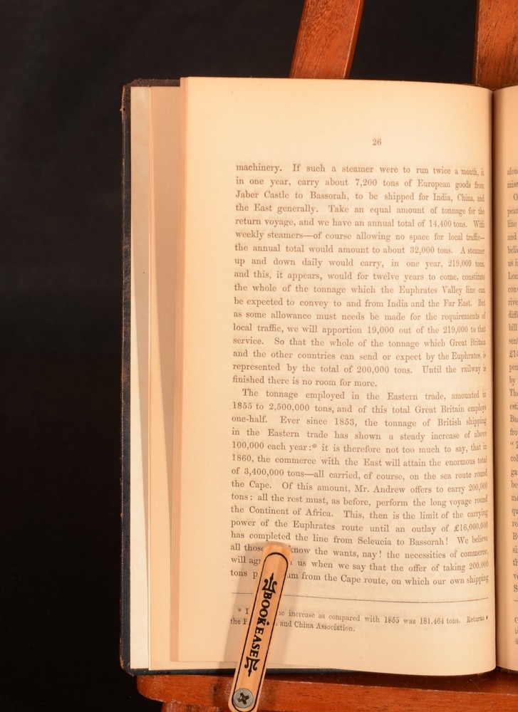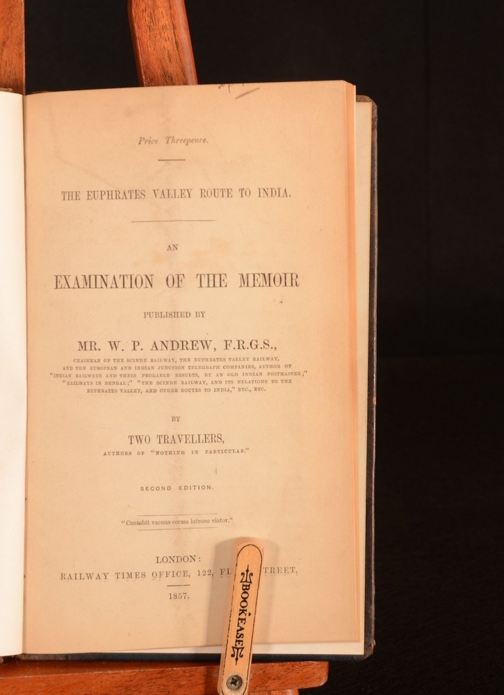 Click here to see our other books! The Euphrates Valley Route to India. An Examination of the Memoir Published by Mr. W. P. Andrew 'Two Travellers' 1857 Railway Times Office : London 8" by 5" 35pp SUMMARY A very scarce examination of Sir William P. Andrew's memoir detailing his proposal for the construction of a railway along the Euphrates to the port at Basra, as an alternative route to India. Leather Binding,Very Scarce Overall Condition: Very Good This book weighs 0.5 KG when packed UK Postage: £ 3.99 US Postage: £ 15.99 EU Postage : £ 13.99 European Postage: £ 14.99 Asia Postage: £ 18.99 Worldwide Postage: £ 19.99 DESCRIPTION William Patrick Andrew was the director of the East Indian Railway and founder of the Scinde, Punjab and Delhi Railway. He was best known for promoting railway and telegraphic communication with India and for his numerous publications on on Indian railways, that allowed his capacities for engineering to become known. The largest scheme of Sir William Andrew's life was the 'Euphrates Valley Railway'; first proposed in the 1830s as a more direct route between Britain and India. Whilst the idea was supported with funding by Sultan Abdulmecid I in 1857 the British government refused to fund the scheme, leading it to be dropped with the completion of the Suez Canal in 1869. This fascinating work, written anonymously by two authors, provides a comprehensive study of the written memoir by Andrew that detailed his plans for the railway through the Euphrates Valley between the Mediterranean and Persian Gulf. A second edition copy. CONDITION In a full crushed morocco binding, with gilt title to spine. Externally rubbed with heavy fading to spine and upper extremity of front board. Internally firmly bound. Pages age toned but very bright and clean. Slight offsetting to extremities of endpapers. Overall Condition: Very Good GLOSSARY OF TERMS Overall Condition (Dustwrapper condition rating is shown after that for the book itself, where a dustwrapper is present) Fine - Very well preserved copy showing very little wear Very Good Indeed - Only one or two minor faults, really a very attractive copy Very Good - Quite a wide term meaning no major faults but probably several smaller ones often expected given the age of the book, but still a respectable copy Good - Meaning not very good. Some more serious faults as will be described in the condition report under 'condition' Good Only - Meaning one or more faults that could really do with repair Fair - As with good only above but with other faults leaving a compromised copy even after repair Poor - Really bad and possibly seriously incomplete. We only sell books in this condition where their rarity or value makes them attractive none the less. Major defects will be described. GUARANTEE We offer a full money back guarantee on our descriptions. Please ask for details and conditions. We prefer PAYPAL. If you pay via PAYPAL we will post the item off the same or the next working day with the postage you have selected. Please note we cannot accept USD cheques