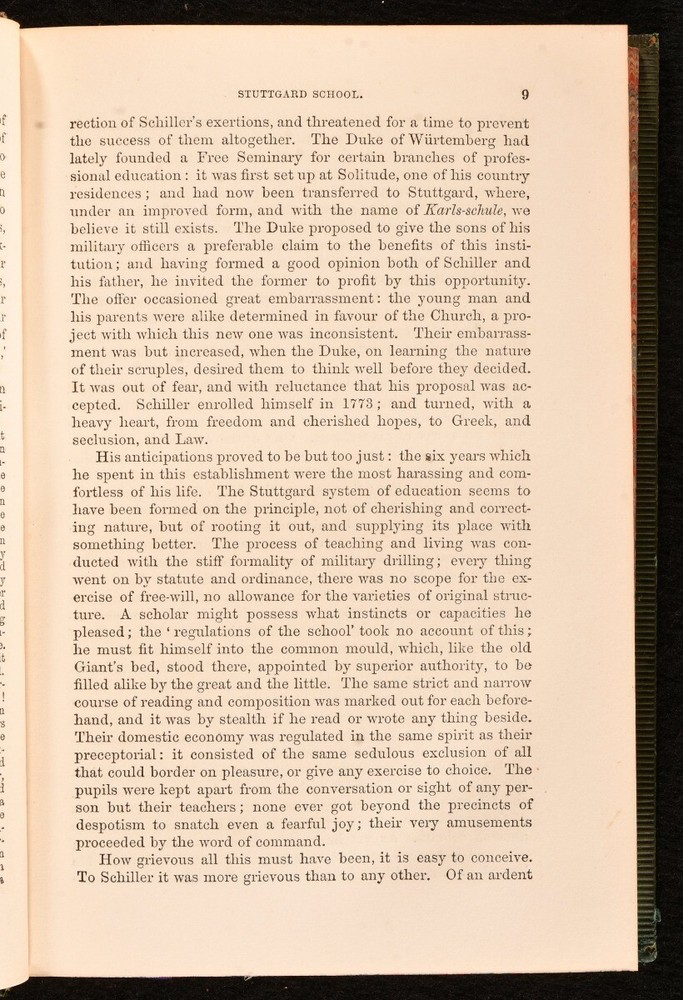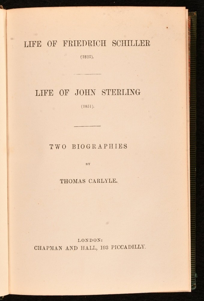 Click here to see our other books! Life of Friedrich Schiller (1825) Life of John Sterling (1951) Two Biographies Thomas Carlyle 1857 Chapman & Hall : London 7.5" by 5" vi, 415pp. SUMMARY A smart copy of these biographies of Friedrich Schiller and John Sterling, written by Thomas Carlyle. Leather Binding Overall Condition: Very Good Indeed This book weighs 0.75 KG when packed UK Postage: £ 3.99 US Postage: £ 19.99 EU Postage : £ 15.99 European Postage: £ 16.99 Asia Postage: £ 21.99 Worldwide Postage: £ 25.99 DESCRIPTION Dated from the British Library. The autobiographies of German poet, playwright, historian, philosopher, and physician, Friedrich Schiller, who is considered to be Germany's most important classical playwright, and John Sterling, a Scottish author and poet. Written by Thomas Carlyle, a British essayist, historian, and philosopher. CONDITION Bound in full green calf. Externally, very smart with light shelf wear to the extremities. Minor loss to the spine label and a small crack to the front joint at the tail of the spine. Internally, firmly bound. Pages are very bright and clean with light spotting to the endpapers. Library bookplate and bookseller's label to the front pastedown. Overall Condition: Very Good Indeed GLOSSARY OF TERMS Overall Condition (Dustwrapper condition rating is shown after that for the book itself, where a dustwrapper is present) Fine - Very well preserved copy showing very little wear Very Good Indeed - Only one or two minor faults, really a very attractive copy Very Good - Quite a wide term meaning no major faults but probably several smaller ones often expected given the age of the book, but still a respectable copy Good - Meaning not very good. Some more serious faults as will be described in the condition report under 'condition' Good Only - Meaning one or more faults that could really do with repair Fair - As with good only above but with other faults leaving a compromised copy even after repair Poor - Really bad and possibly seriously incomplete. We only sell books in this condition where their rarity or value makes them attractive none the less. Major defects will be described. GUARANTEE We offer a full money back guarantee on our descriptions. Please ask for details and conditions. We prefer PAYPAL. If you pay via PAYPAL we will post the item off the same or the next working day with the postage you have selected. Please note we cannot accept USD cheques