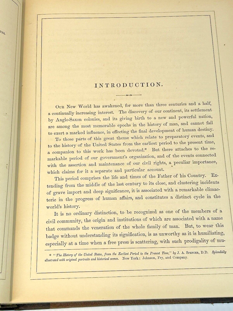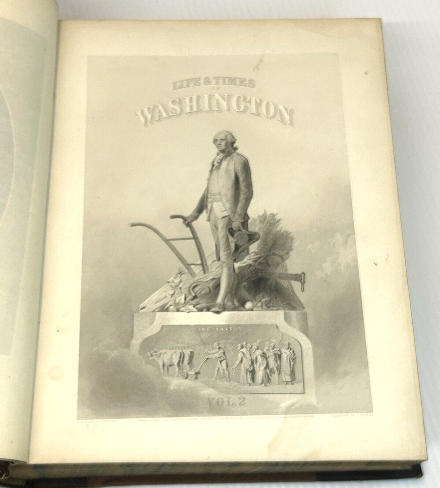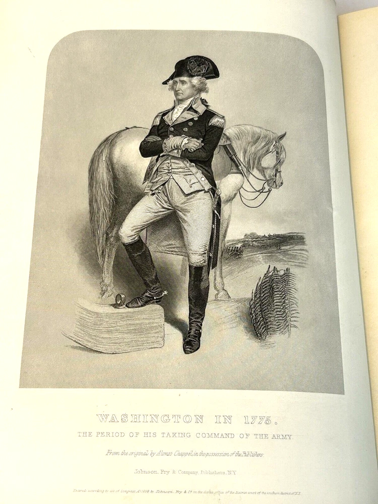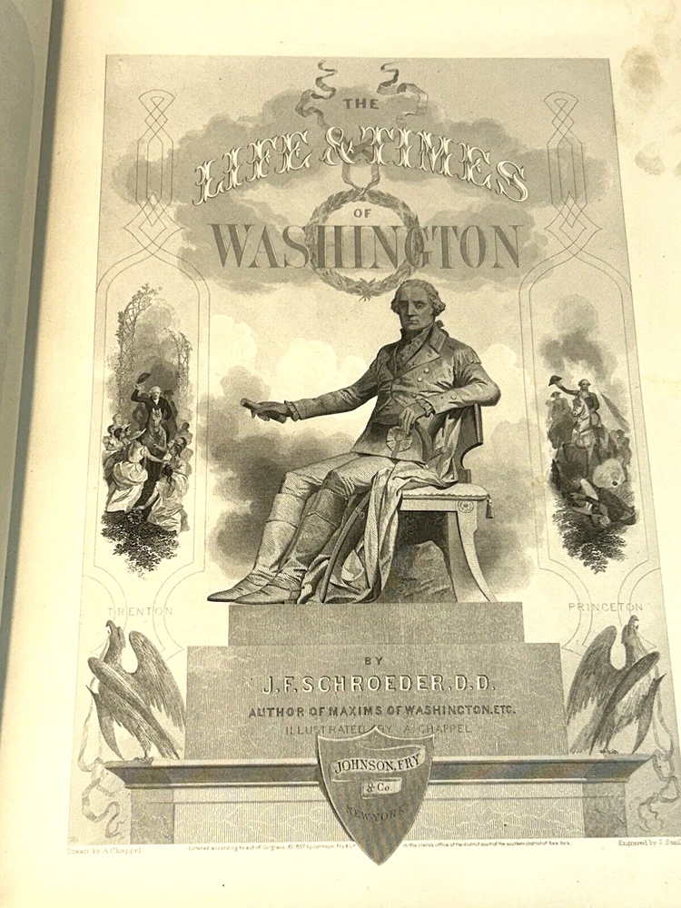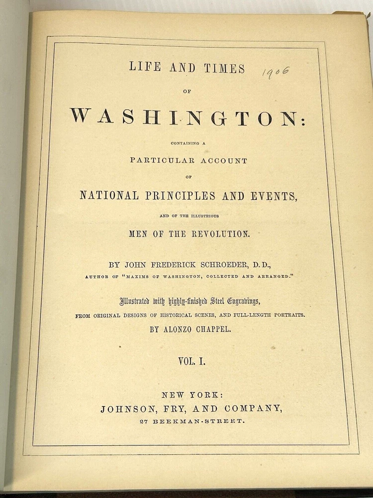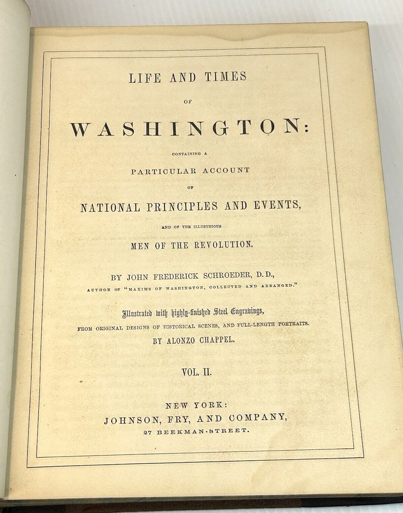 Life And Times of WASHINGTON Containing a Particular Account of National Principles and Events and of the illustrious Men Of The Revolution. by John Frederick Schroeder, D. D. Author of "Maxims of Washington, Collected and Arranged Illustrated with highly-finished Steel Engravings From original designs of historical scenes, and full-length portraits by ALONZO CHAPPEL VOL. I. VOL. II. New York: Johnson, Fry, and Company 27 Beekman-Street 9'' x 11" x 2 1/4" Volume 1 = 708 Pages Volume 2 = 762 Pages I have been an eBay seller since 2000, and a collector/treasure hunter since I was in elementary school. I love being able to rescue items that were destined for the trash heap and find new homes for them with people who will appreciate them. All reasonable offers will be considered! I do my best to describe my items as accurately as possible, but may miss details or make mistakes from time to time. However, if you are unsatisfied for any reason, please reach out to me so I can work to make things right. Thank you for your interest! 100% satisfaction guarantee or receive a quick refund 20% of the sale of this item will be donated to a youth-serving organization MP 5475.1 This set of two volumes is a must-have for any collector or enthusiast of American history. Written by John Frederick Schroeder, the biography of George Washington is a captivating read that explores the life and times of the first American president. The leather binding adds a touch of sophistication to this original edition, published by Johnson, Fry, and Company in 1857. The illustrations by Chappel add depth to the narrative, making it a great addition to any book collection. The book is written in English and is an original edition, not a facsimile. This set belongs in the Antiquarian & Collectible category and is a valuable addition to any book collection.