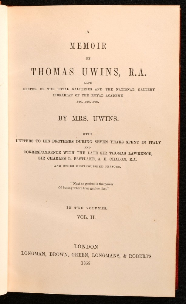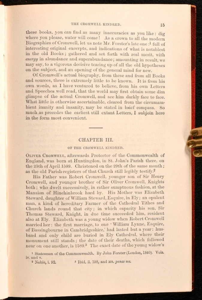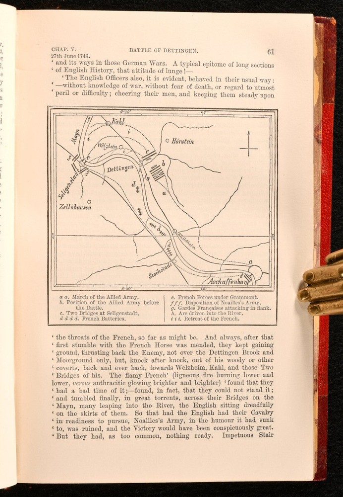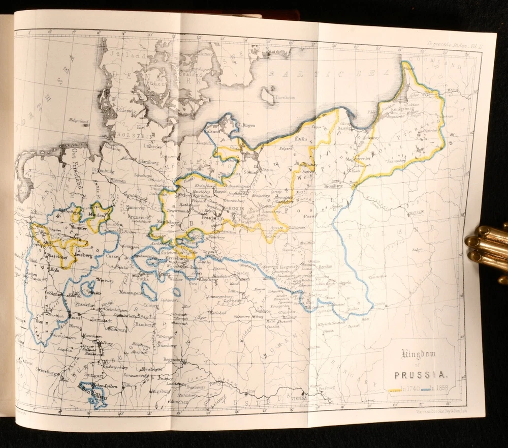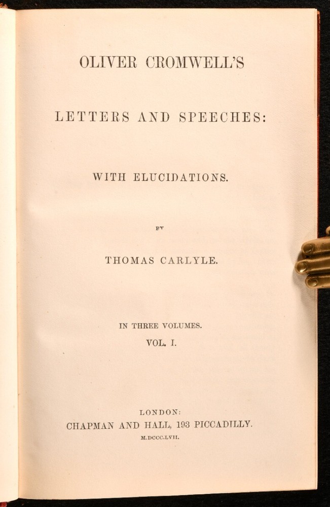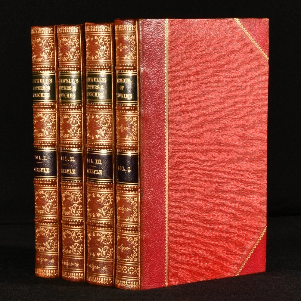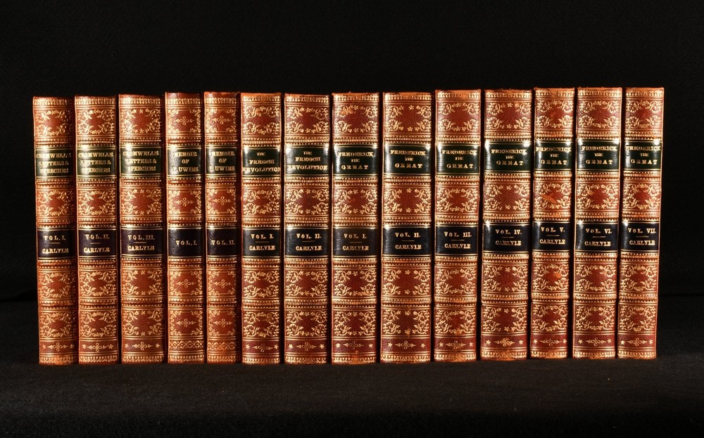 Click here to see our other books! Historical Works Thomas Carlyle, Mrs Uwins 1857-1869 Chapman and Hall; Longman, Brown , Green, Longmans, and Roberts : London 7.5" by 5" SUMMARY A lovely matching set bound in half leather comprising various historical or biographical volumes on General Oliver Cromwell, Thomas Uwins, the French Revolution, and Frederick the Great. First Edition,Folding Maps,Illustrated,Leather Binding,Pleasing Copy,Rebound Overall Condition: Near Fine This book weighs 15 KG when packed UK Postage: £ 4.49 US Postage: £ 79.99 EU Postage : £ 40.99 European Postage: £ 75.99 Asia Postage: £ 159.99 Worldwide Postage: £ 249.99 DESCRIPTION A lovely matching set bound in half morocco and cloth, with marbled edges and endpaper. Including three volumes Oliver Cromwell's Letters and Speeches: With Elucidations by Thomas Carlyle. The second edition of this work, with a foreword on the edition to volume one. Including the letters and speeches of Oliver Cromwell, noted English general and statesman who led the armies of the Parliament of England against King Charles I during the English Civil War. He acted simultaneously as head of state and head of government of the new republican commonwealth. Two volumes A Memoir of Thomas Uwins, With Letters to his Brother During Seven Years Spent in Italy and Correspondence, with the Late Sir Thomas Lawrence, Sir Charles L. Eastlake. A E Chalon, and other DIstinguished Persons by Mrs Uwins. The first edition of this work. A fascinating memoir of the British painter, and letters exchanged with important people of the time. Two volumes on The French Revolution: A History in Three Parts: I. The Bastille; II. The Constitution; III. The Guillotine . A thorough and interesting later edition of these volumes on the history of the French Revolution by Thomas Carlyle. These were inspiration for Charles Dickens' novel A Tale of Two Cities. Seven volumes A History of Friedrich II of Prussia, Called Frederick the Great . A later print complete with sic in text maps and fourteen folding maps. A complete set on the history of Frederick the Great, self-proclaimed King of Prussia from 1740 until his death, being the longer reigning monarch of the Hohenzollern. Under his rule, Prussia became a military power in Europe. CONDITION Bound in half morocco binding and cloth over boards, with marbled edges and endpapers, and five raised bands. Externally lovely with only minor rubbing to head and tail of spine and extremities. Internally, firmly bound. Minor faint spotting to the endpapers, otherwise pages are bright and clean. Collated. Complete with various maps, fourteen of which folding maps to Frederick the Great's volumes. Overall Condition: Near Fine GLOSSARY OF TERMS Overall Condition (Dustwrapper condition rating is shown after that for the book itself, where a dustwrapper is present) Fine - Very well preserved copy showing very little wear Very Good Indeed - Only one or two minor faults, really a very attractive copy Very Good - Quite a wide term meaning no major faults but probably several smaller ones often expected given the age of the book, but still a respectable copy Good - Meaning not very good. Some more serious faults as will be described in the condition report under 'condition' Good Only - Meaning one or more faults that could really do with repair Fair - As with good only above but with other faults leaving a compromised copy even after repair Poor - Really bad and possibly seriously incomplete. We only sell books in this condition where their rarity or value makes them attractive none the less. Major defects will be described. GUARANTEE We offer a full money back guarantee on our descriptions. Please ask for details and conditions. We prefer PAYPAL. If you pay via PAYPAL we will post the item off the same or the next working day with the postage you have selected. Please note we cannot accept USD cheques